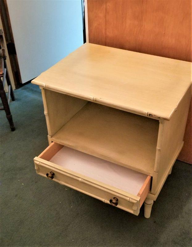 This piece matches the dresser that was in an earlier lot. Mid Century Faux Bamboo night stand - single drawer. Used condition. Light Olive in color. 24 " across, 18" deep, 26" tall.
