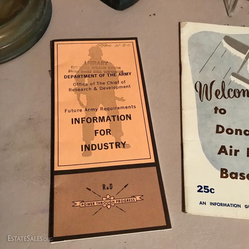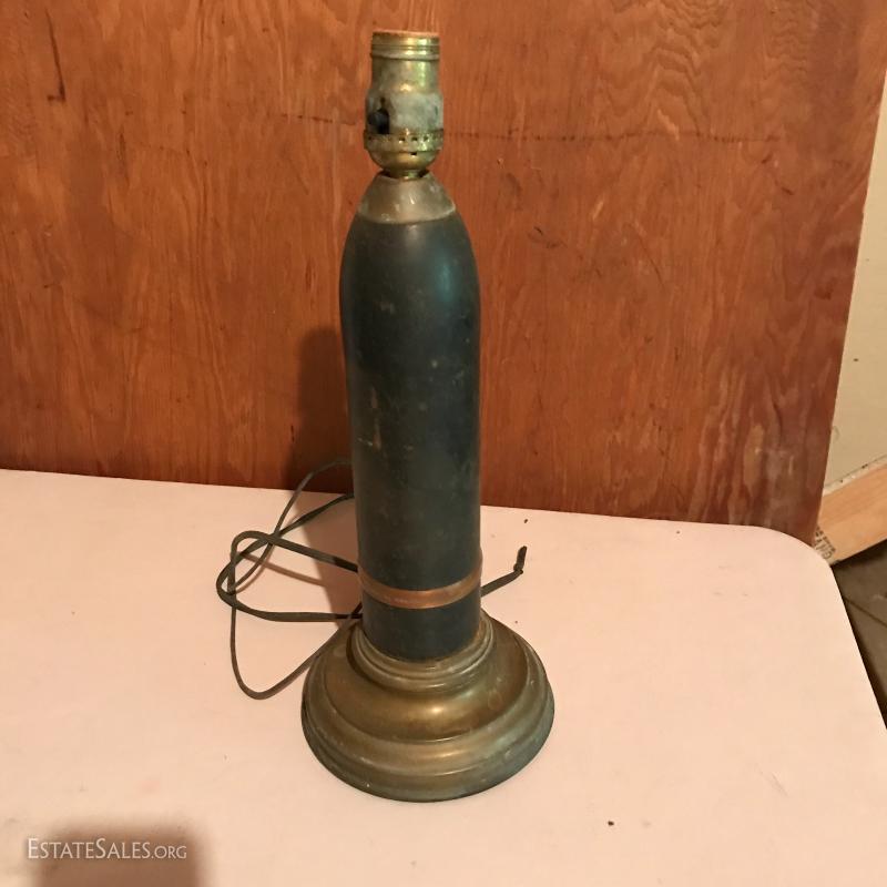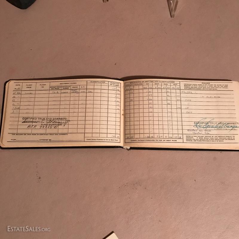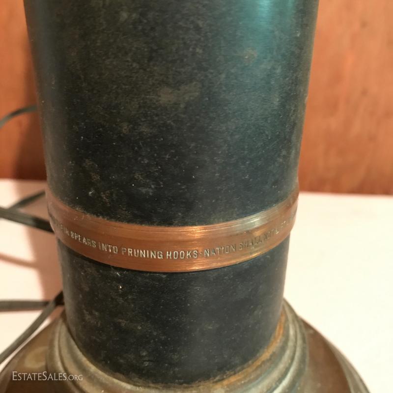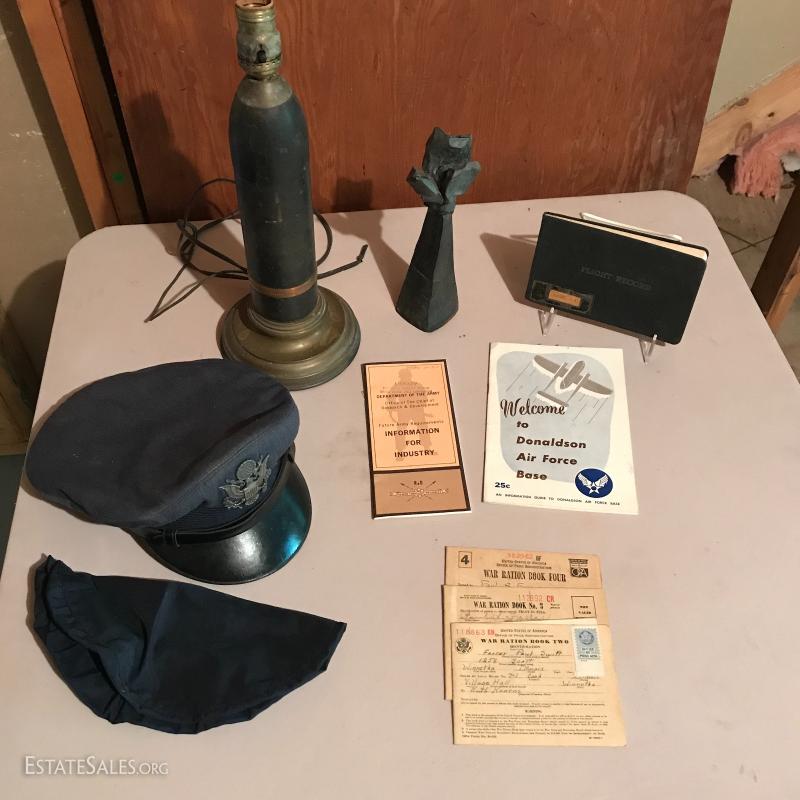 Flight log book from 1930 with few entries. 3 War Ration booklets, An Army and Air Force pamphlet, large steal mass with "Wessel 4140" written on it. Lamp made from what appears to be ammo and a copper band with wording that reads "They shall beat their swords into plowshares and their spears into pruning hooks. Nations shall not lift up sword against nation. Neither shall they learn war anymore." Wiring on lamp needs to be redone. Due to the weightiness of this lot is only available for local pick up in Flat Rock, NC.