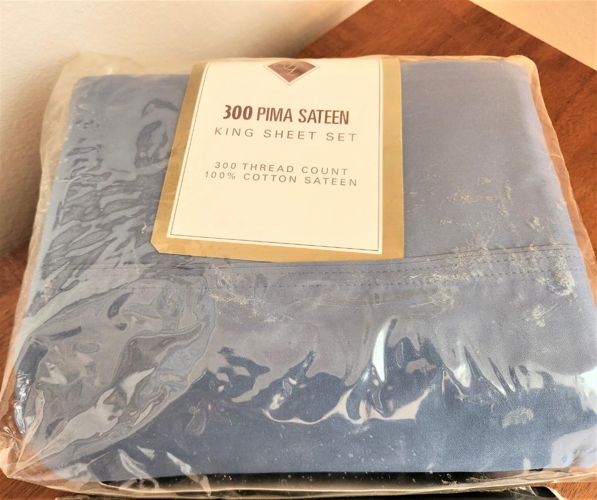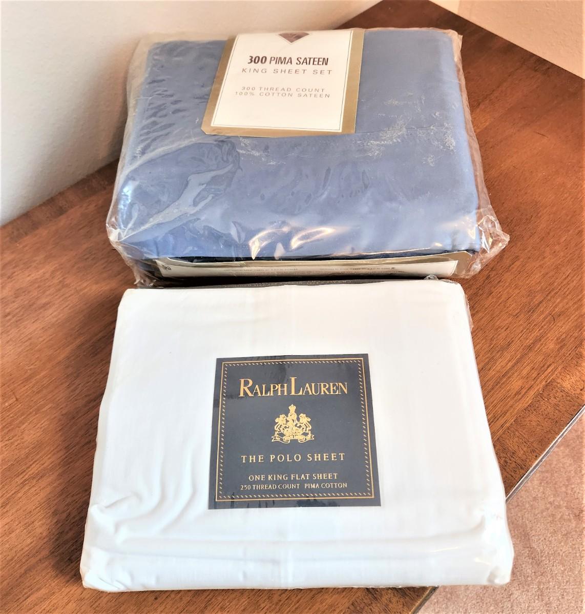 Both of these are never removed from package - white Ralph Lauren King flat sheet and a Wamsutta Pima Sateen 300 ct King sheet set (flat, fitted,, pillow cases - color is topaz blue).