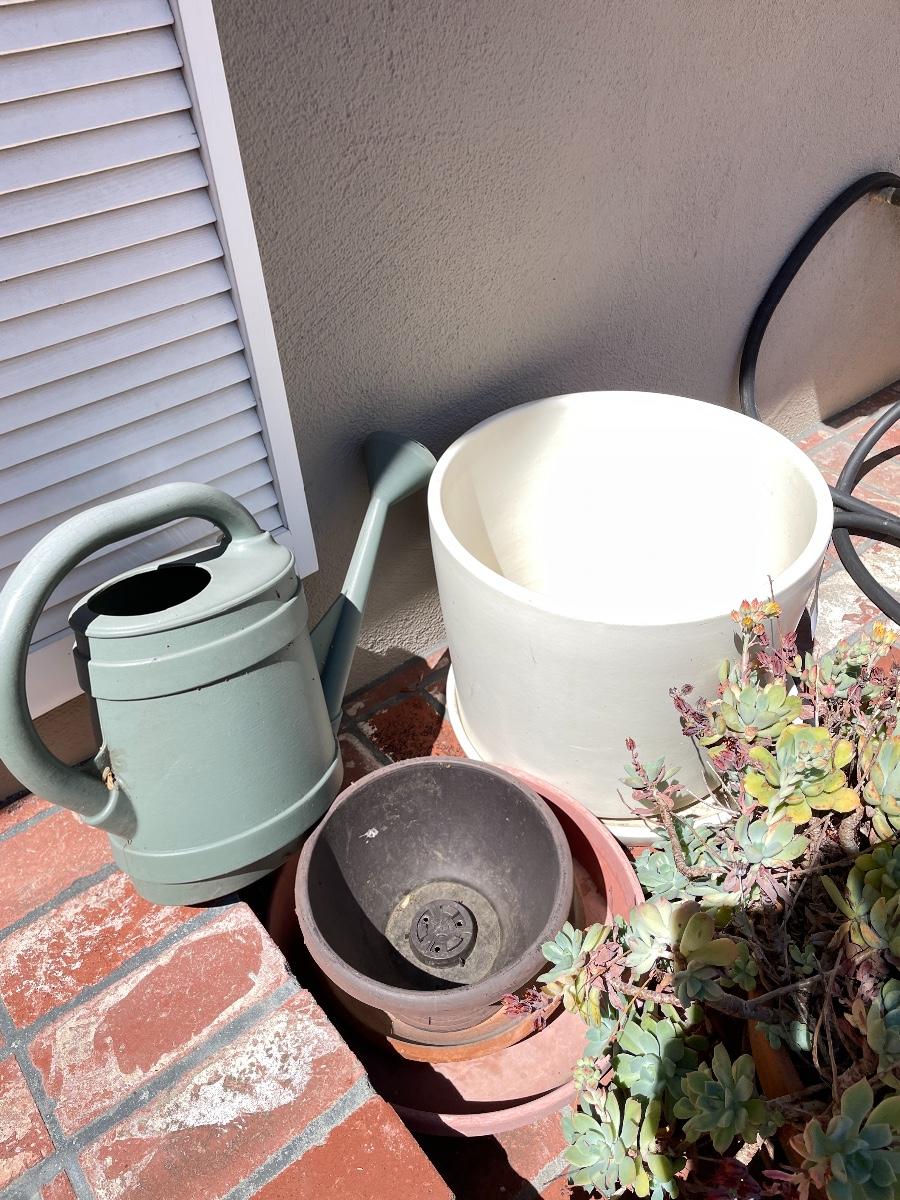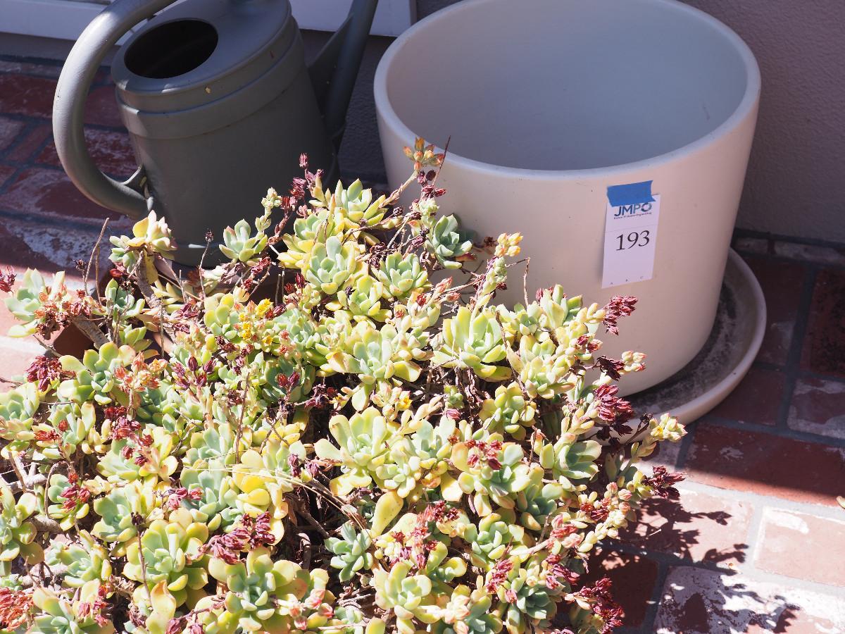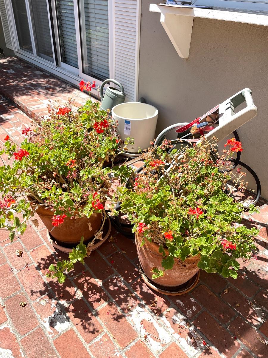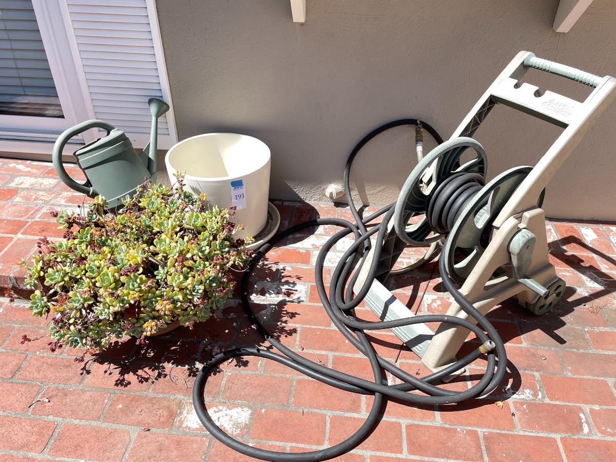 Lot 193- Outside back patio empty pots, watering can, live succulent, hose holder, large live geraniums in Terra Cotta pots, hanging metal plant holder. Wooden Bird whirligig.