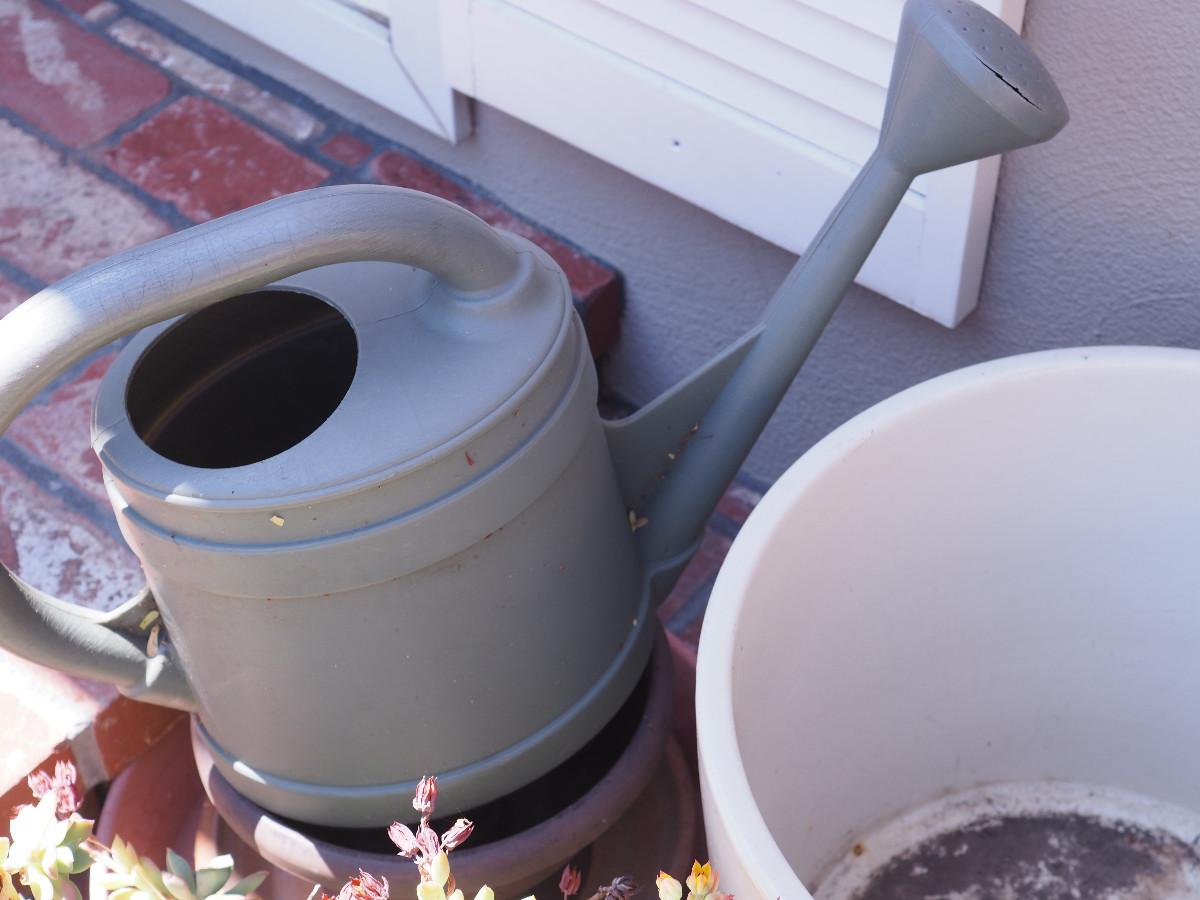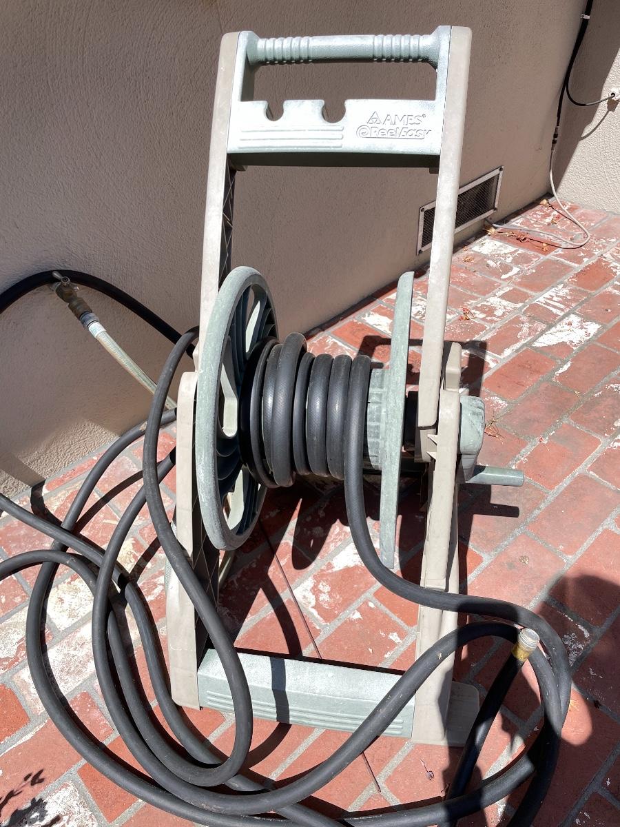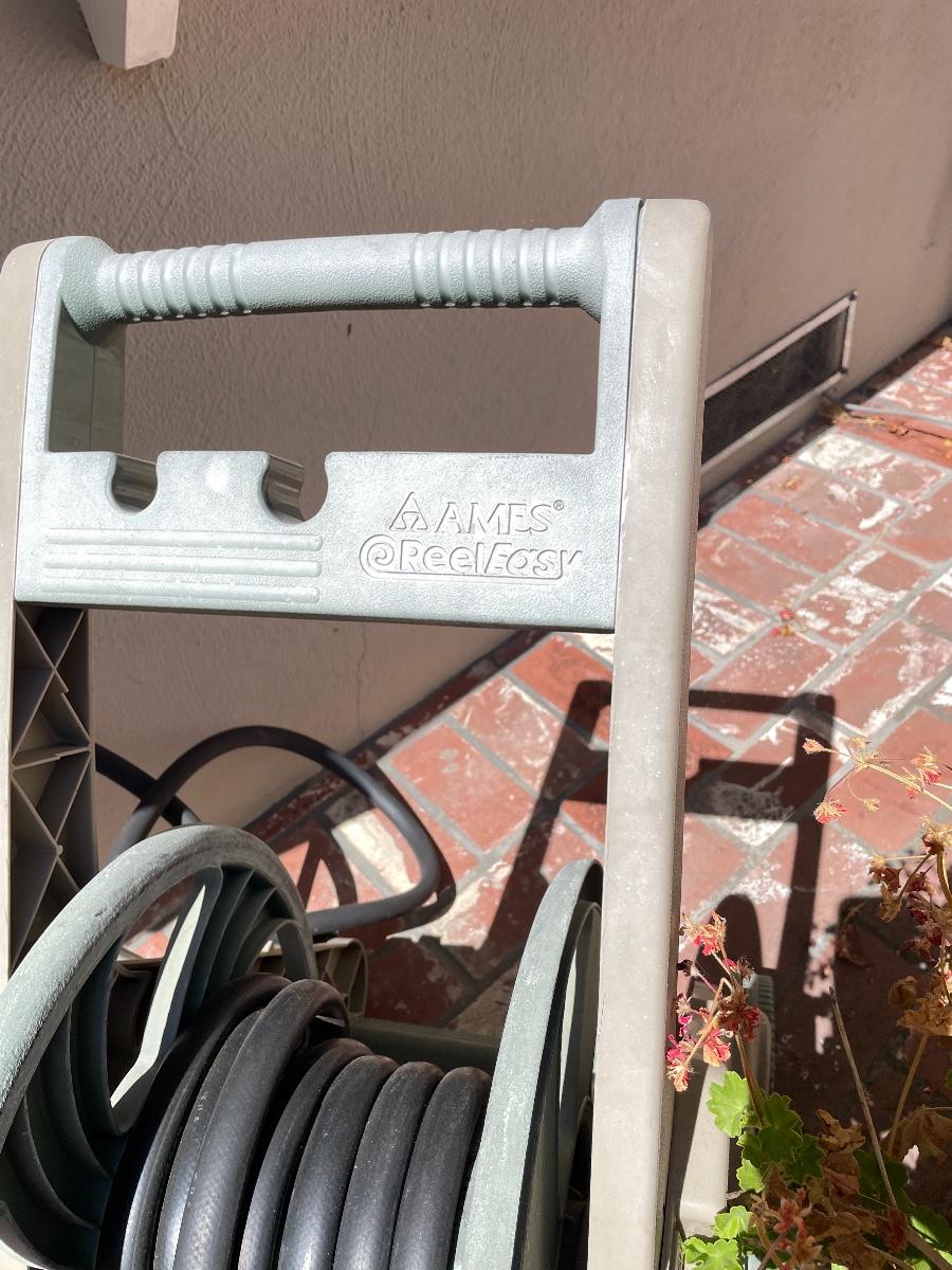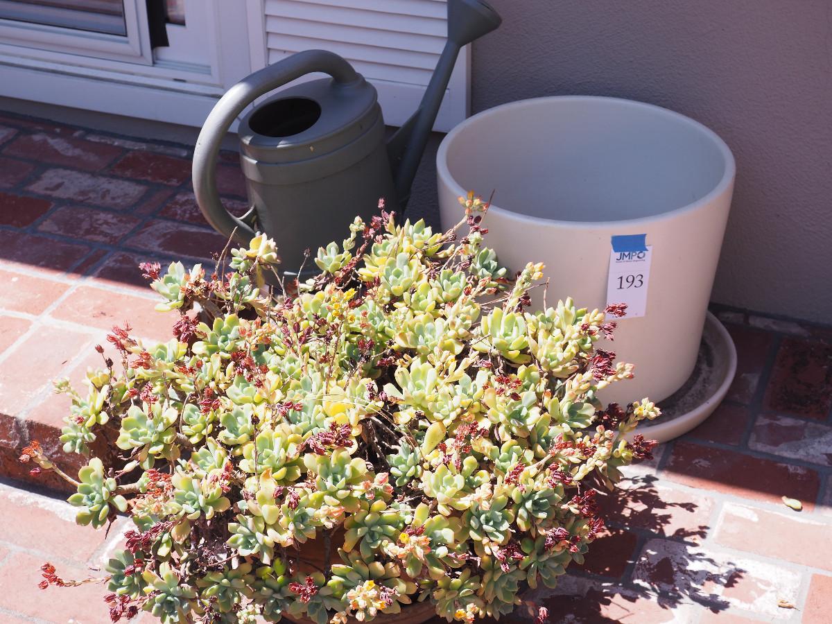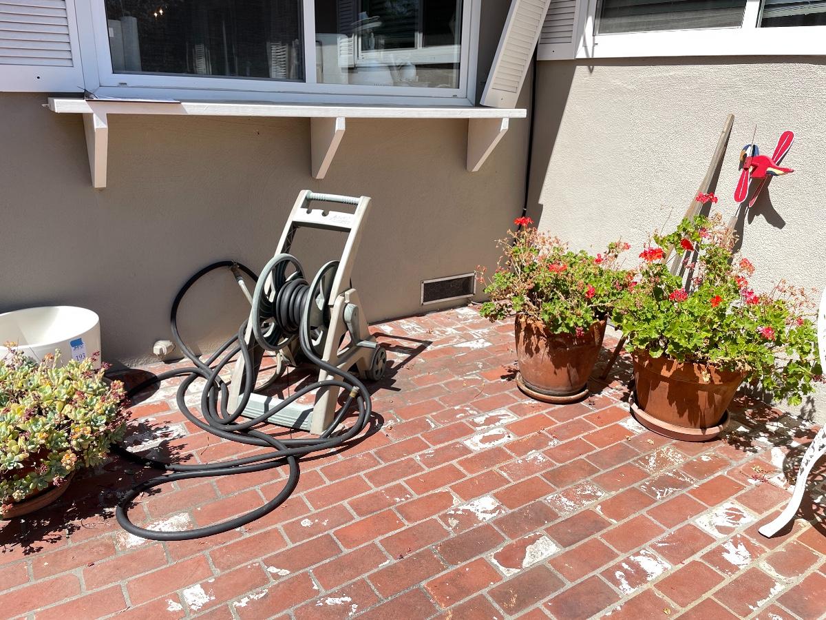 Lot 193- Outside back patio empty pots, watering can, live succulent, hose holder, large live geraniums in Terra Cotta pots, hanging metal plant holder. Wooden Bird whirligig.
