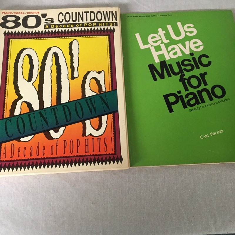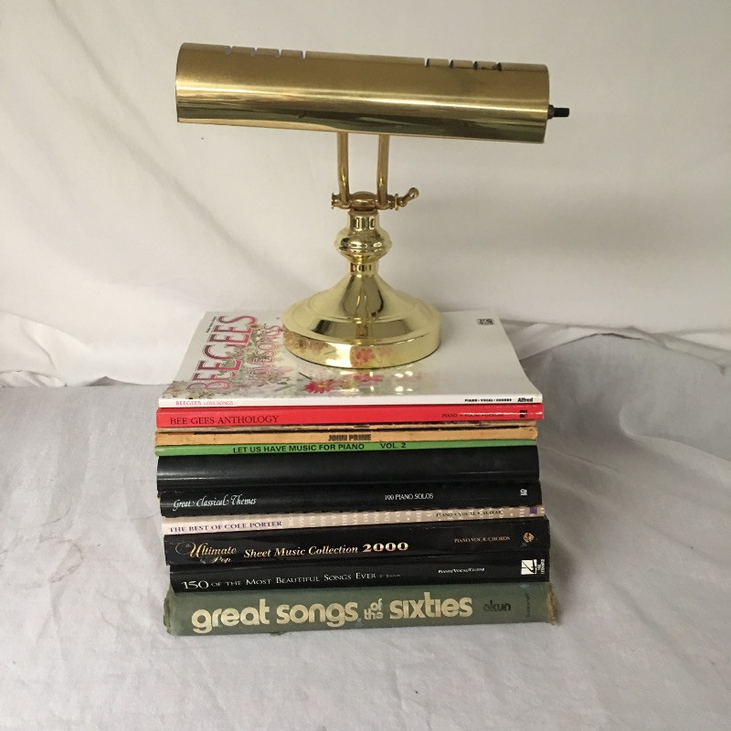 Adjustable piano lamp with music books including Bee Gees, John Lennon, music of the 60s, 80s pop music and more - see pictures.