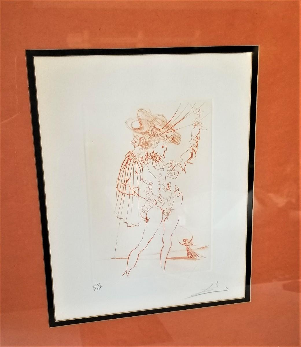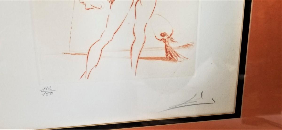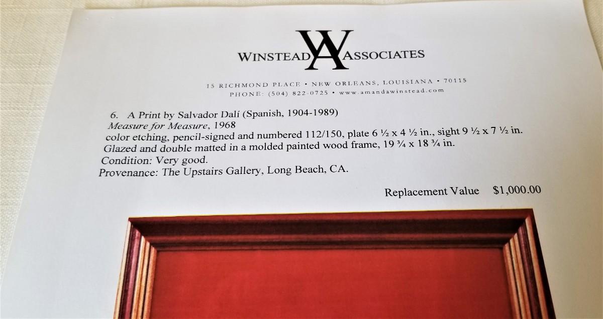 Pencil Signed, numbered 112/150 Salvador Dali color etching. Entitled "Measure for Measure" - done in 1968. Plate measures 6.5" x 4.5". Glazed double mat - molded painted wood frame. Entire thing measures 19.75" x 18.75". Very Good condition. This piece was professionally appraised a year or so ago by a professional appraiser - a copy of her report is included. She claims that the piece is genuine and has an insurance value of $1,000.00.