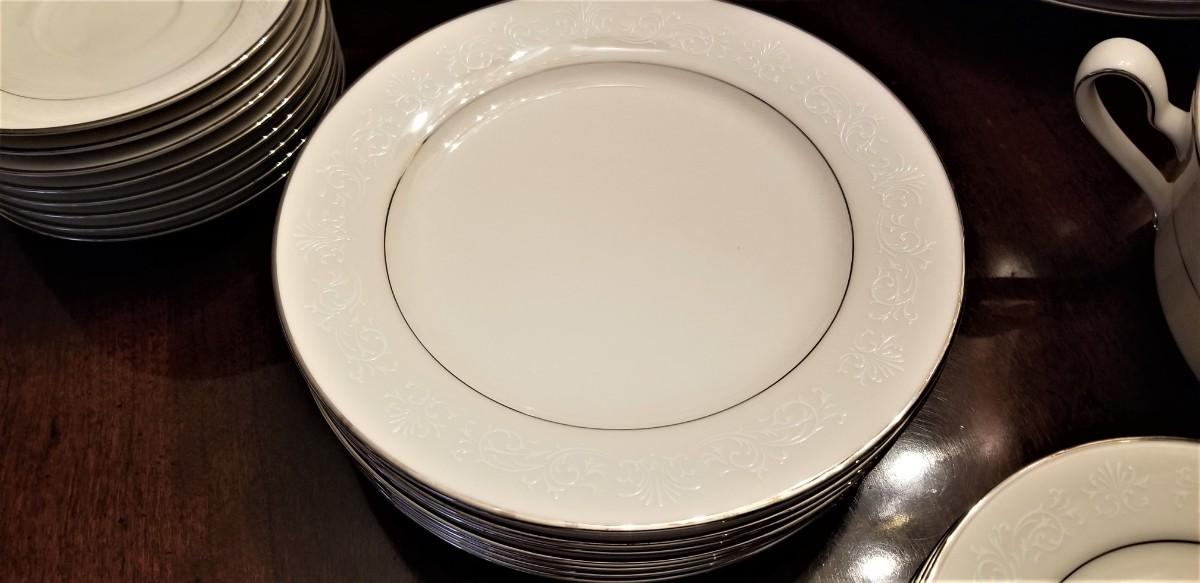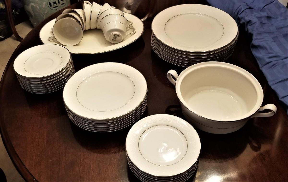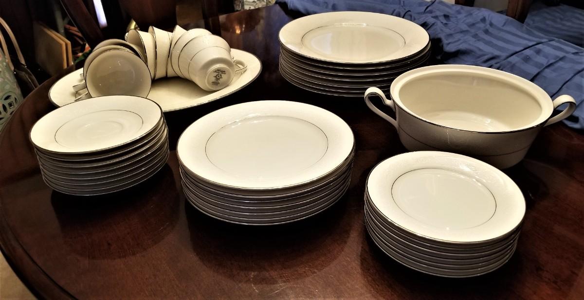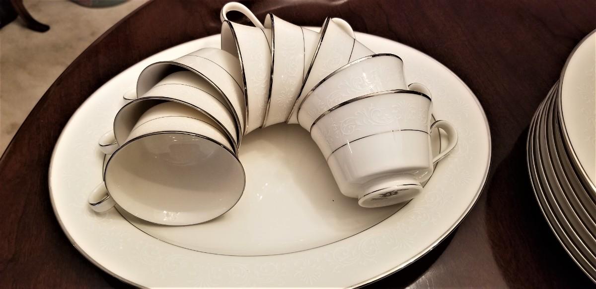 Lot of vintage NORITAKE fine china in the "Marseilles" pattern. You get all you see here: platter, 8 cups/saucers, 7 salad plates, 7 bread/butter plates, 7 dinner plates (10.5" across), vegetable bowl (we found the lid after we took the photos, so it's included), and an additional serving bowl that is also not pictured (found later). Dishes are platinum edged and are an ivory color. All in good condition.