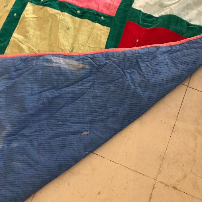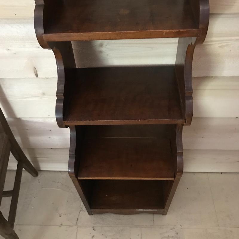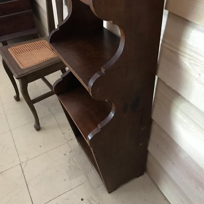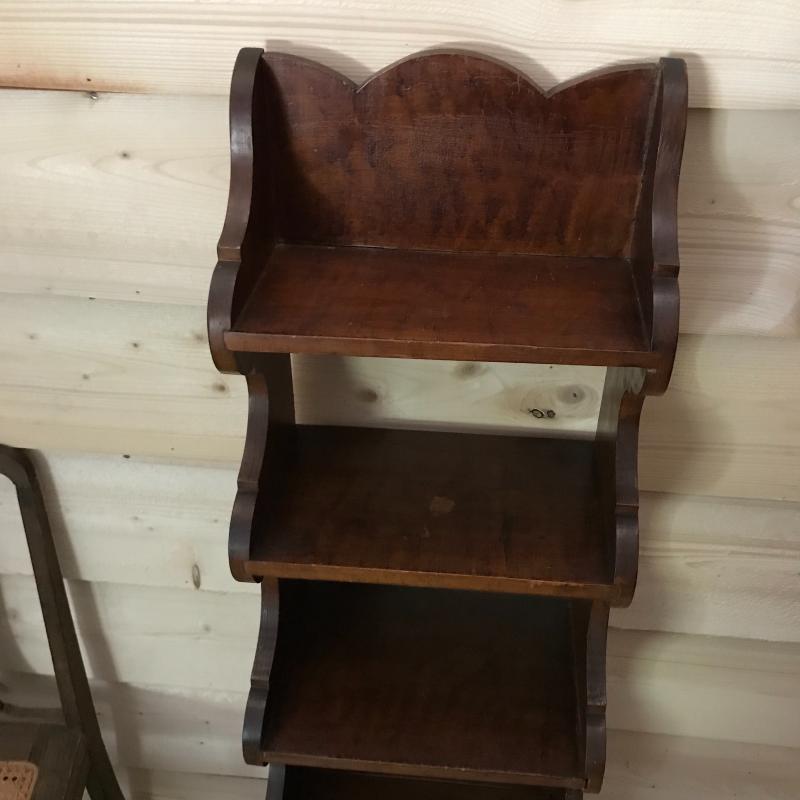 Lot includes wooden shelf (approx. 10” x 15” x 38”), wooden chair with cane bottom (approx. 17” x 15.5” x 38”), and quilt (approx. 82” x 54”). Quilt has some holes and color is faded in some places. No shipping available. Local pickup only in Maggie Valley, NC.