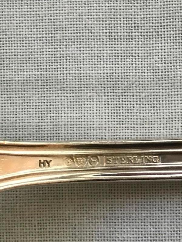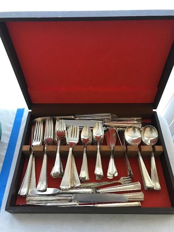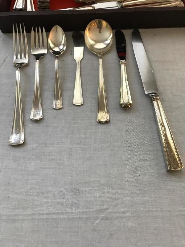 Sterling Solver flatware set with box. 11 Forks, 7 dessert forks, 13 salad forks, 25 teaspoons, 2 spreaders, 10 butter knives, 12 soup spoons, 3 cocktail forks and 12 knives. Monogrammed with a F