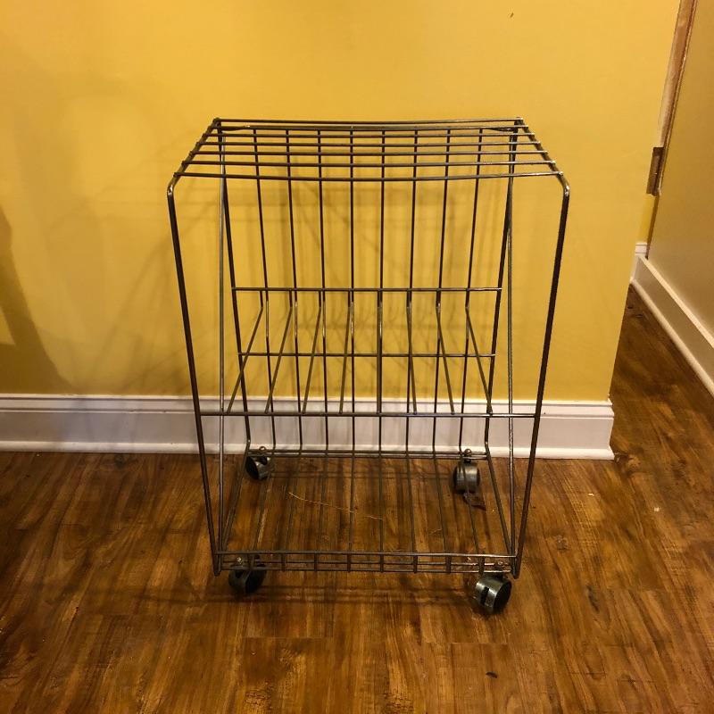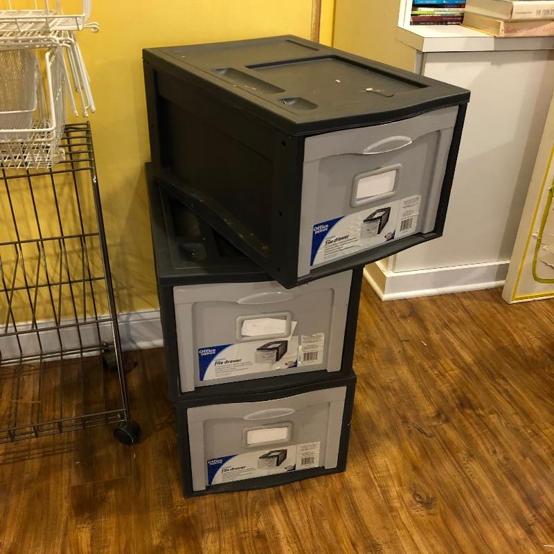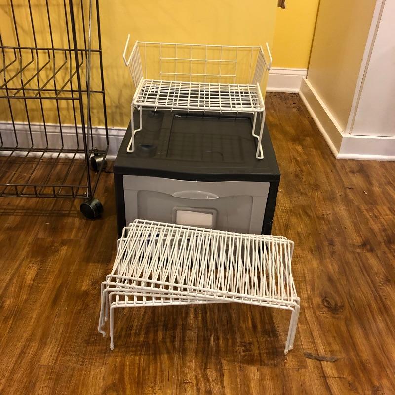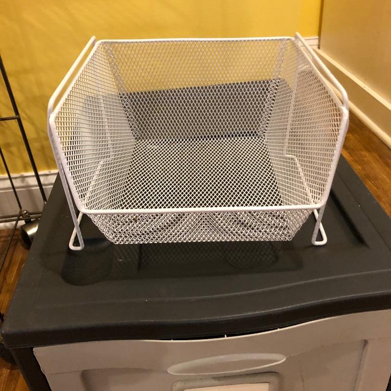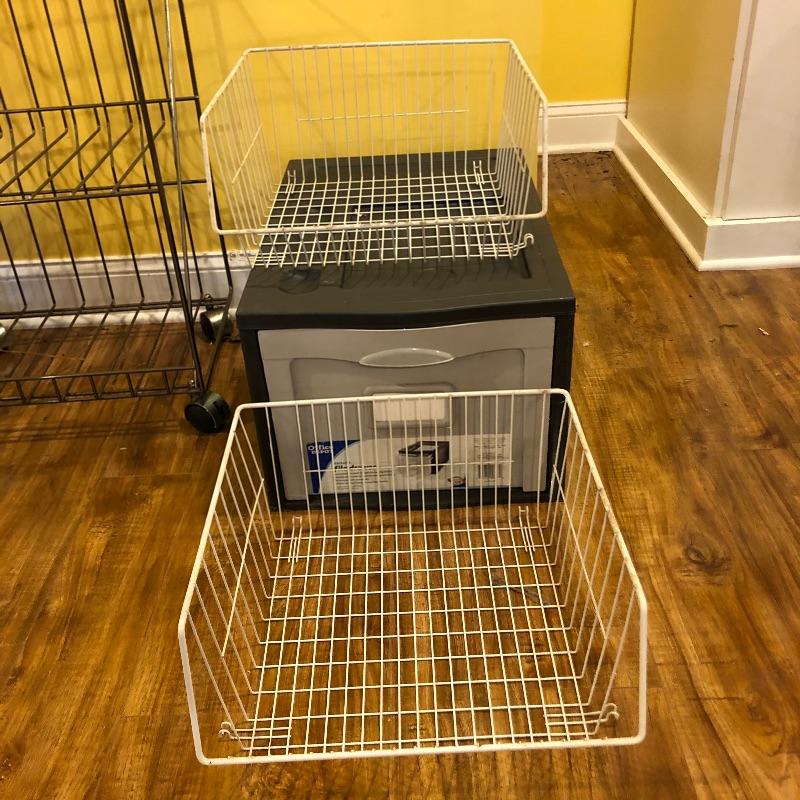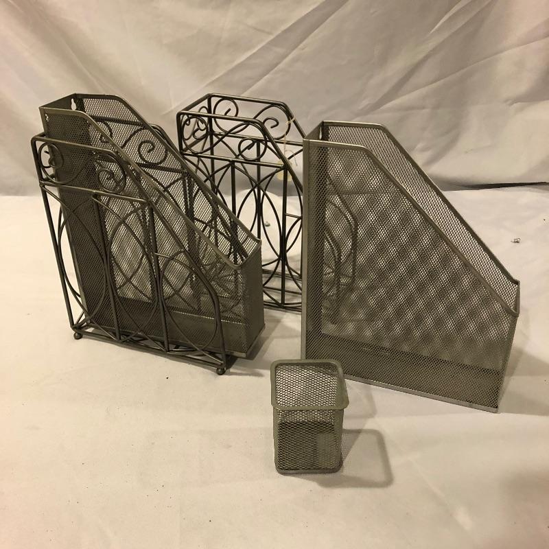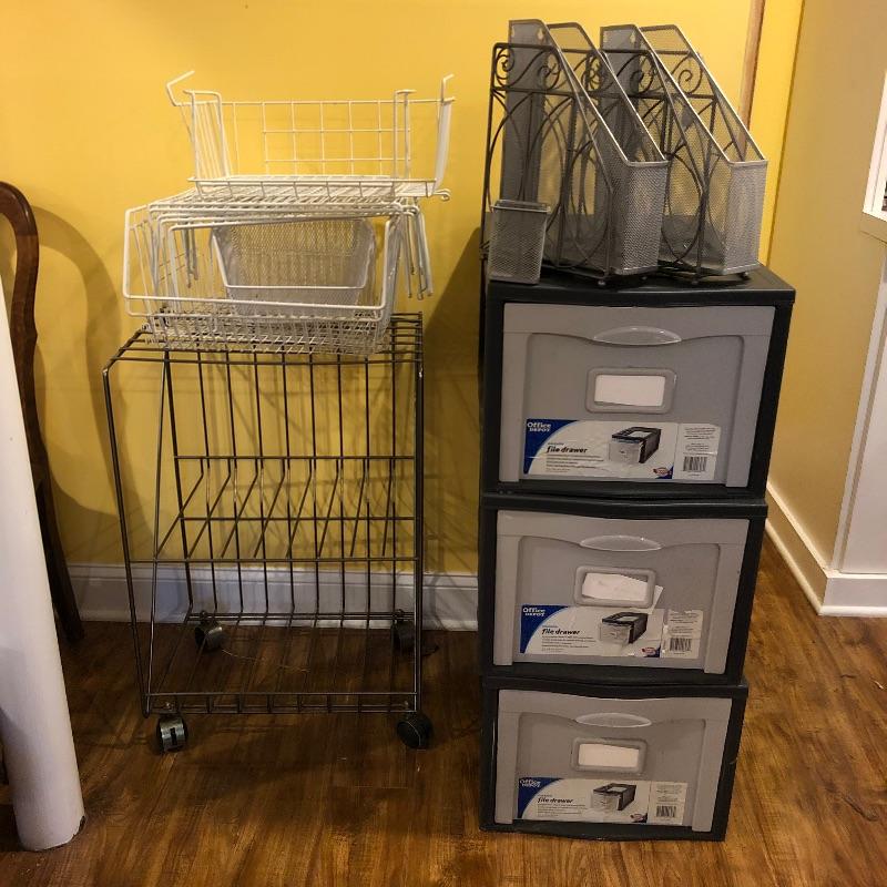 We all need help staying organized and this lot will do just that! Included here are 3 stackable filing drawers, measurements are shown in images, a rolling wire double shelf with lockable wheels, pair of metal desk organizers, 3 white wire baskets and 6 white stands and a metal pen holder.