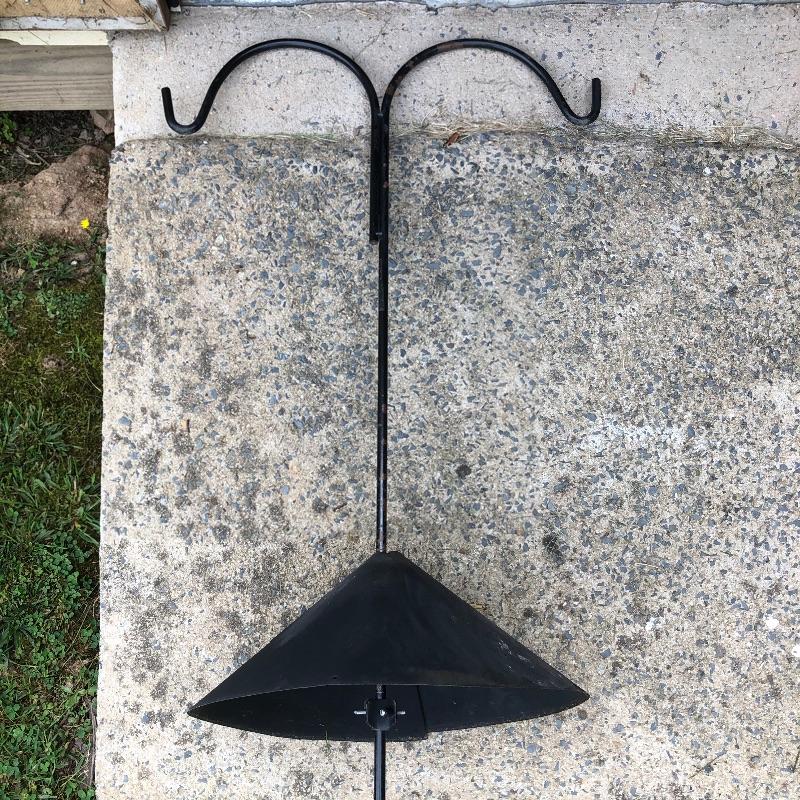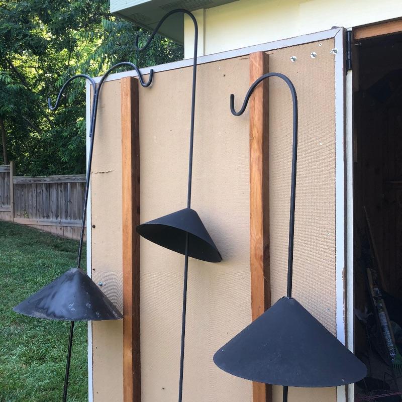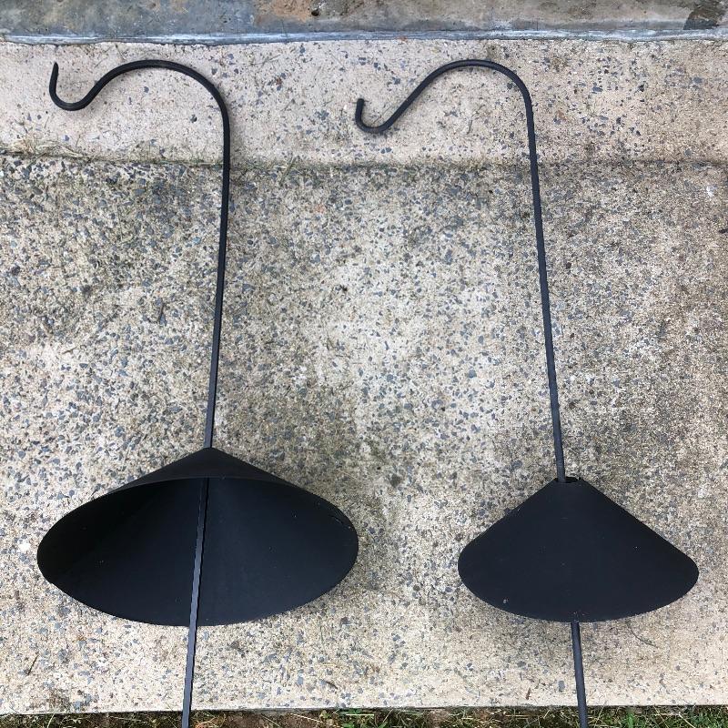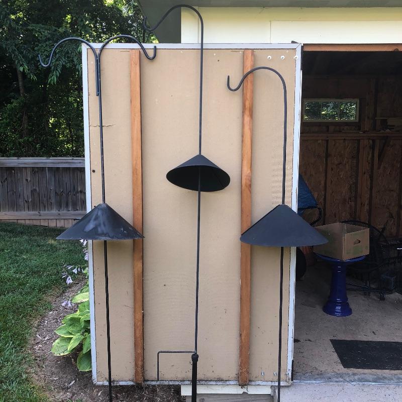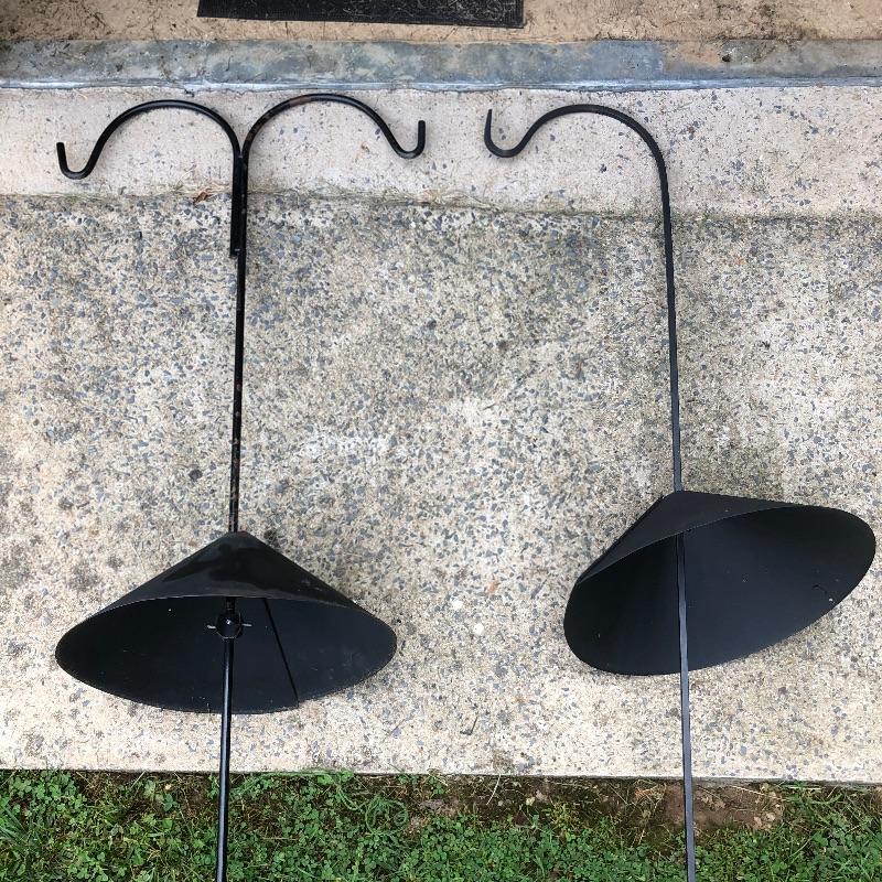 Lot includes 3 black metal bird feeder hooks with baffles. All 3 bird feeders are made to be stuck in the ground. Two of these have a single hook and one has 2 hooks. This lot is great for bird lovers who are looking to keep the squirrels away. Longest bird feeder hook is 101"H. Local pick up only.