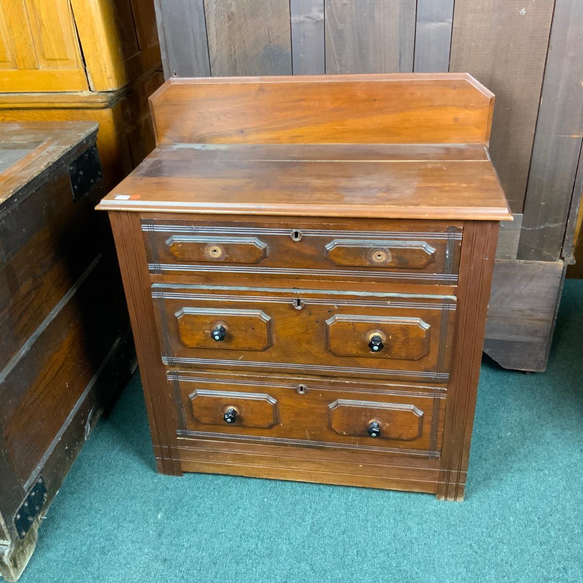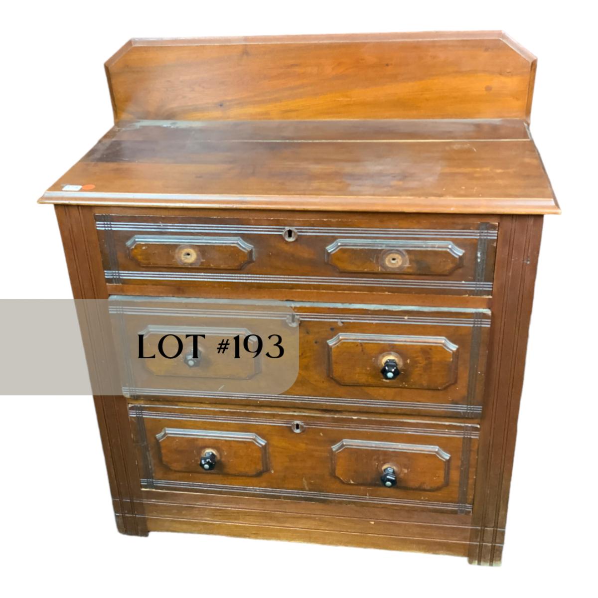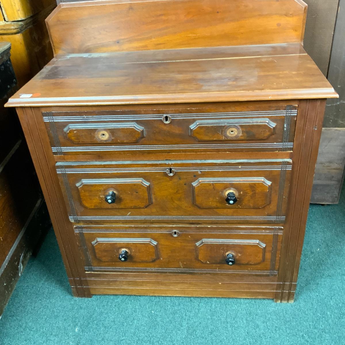 Three Drawer Chest. Attractive piece. Needs new pulls and some restoration work. //::\\ Please see photos for details and condition. No attempt has been made to hide any imperfections. All items listed in this auction are warehouse items, and need to be cleaned. A majority of the items need restoration as well. All items are sold AS IS and WITHOUT GUARANTEE. If you are uncertain about an item, DO NOT BID. Due to the nature of this online auction in-person inspection is HIGHLY recommended. All Sales are FINAL. Pick Up Times are FIRM. Please confirm with your own schedule that you can pick up in the scheduled times listed in the Terms and Conditions. Any questions please message the auctioneer. DO NOT Contact The Harp Gallery.