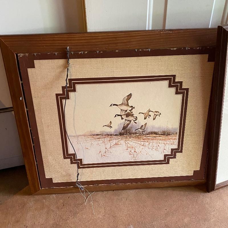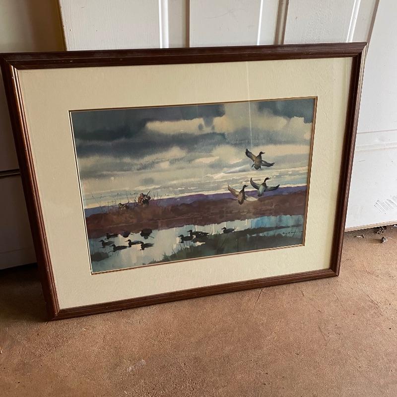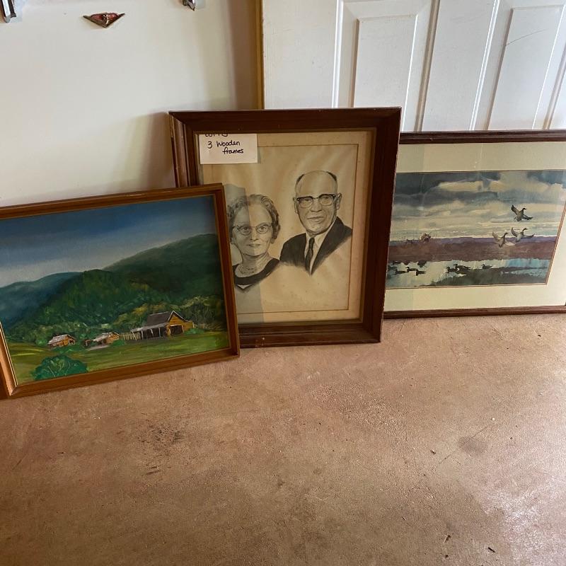 Use this lot for the artwork or for the frames! Included in this lot is a portrait, a canvas painting, and a water color print nature Hunting scene. (See photos for signatures) Enjoy the art or just use the frames for your personal art. . All have wooden frames. The largest wooden frame measures about 25.5in x 20in. No shipping