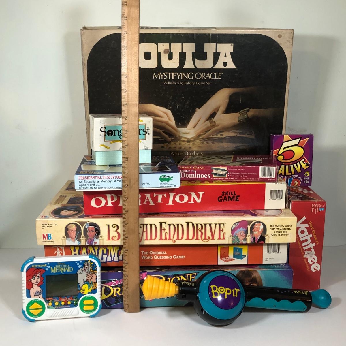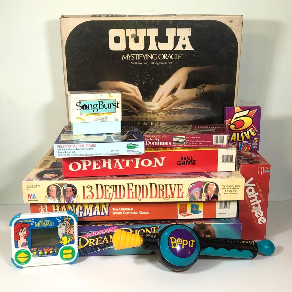 LOT 193L: Vintage Game Collection - Parker Brothers 1972 Ouija Board, Milton Bradley 13 Dead End Drive, Bop It & More