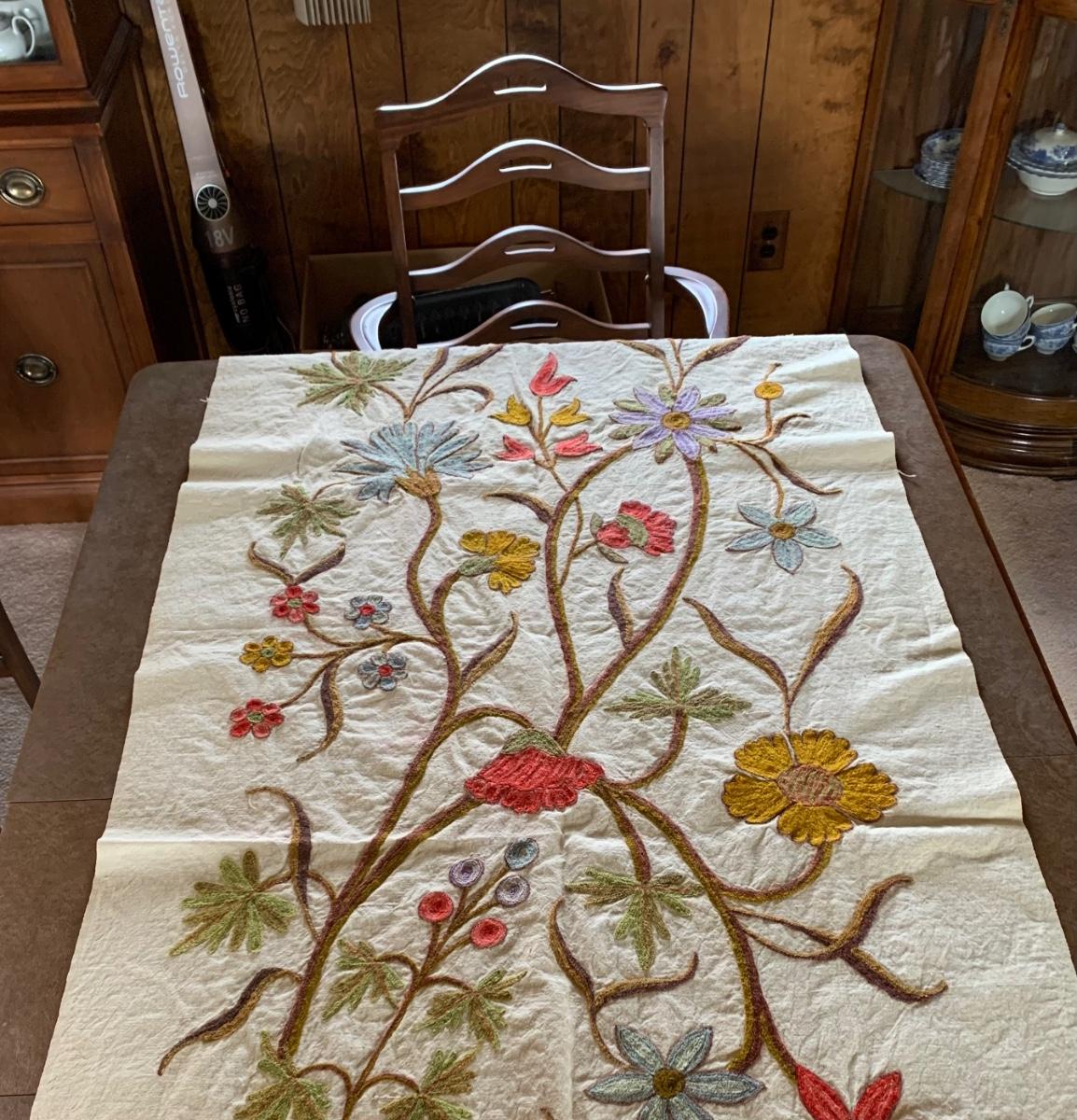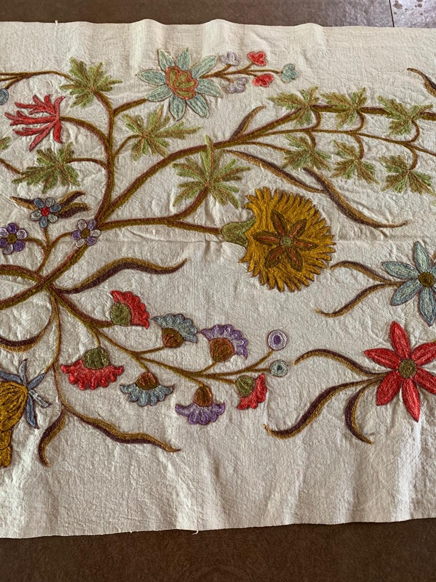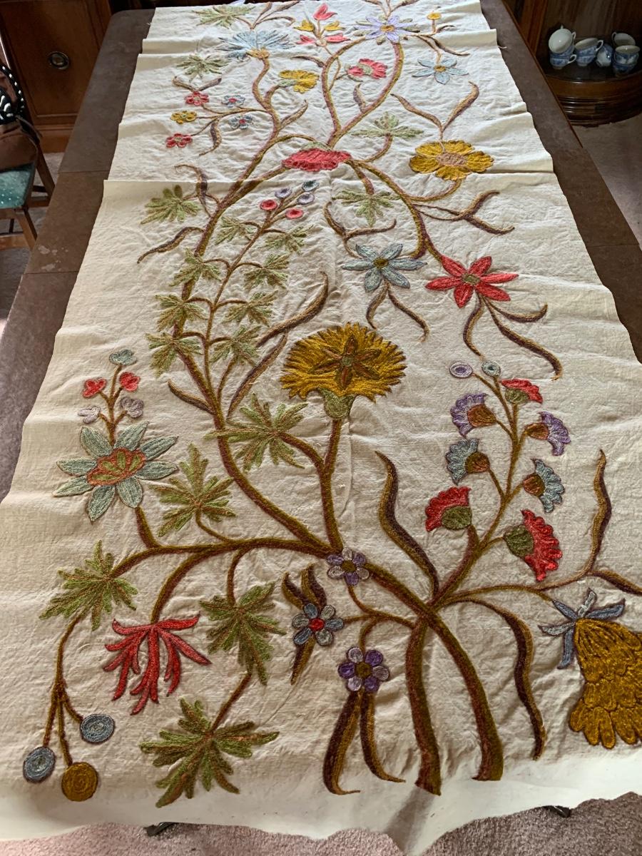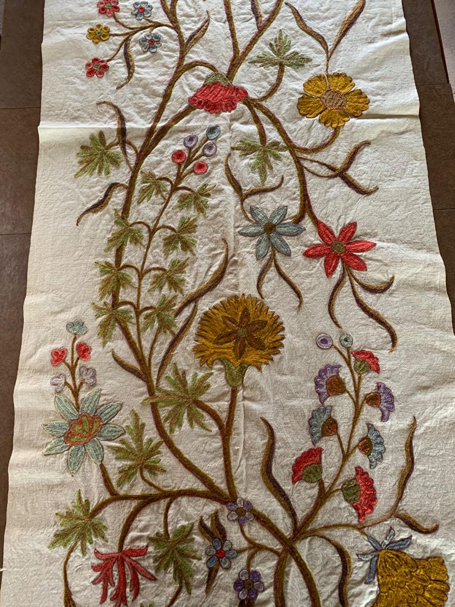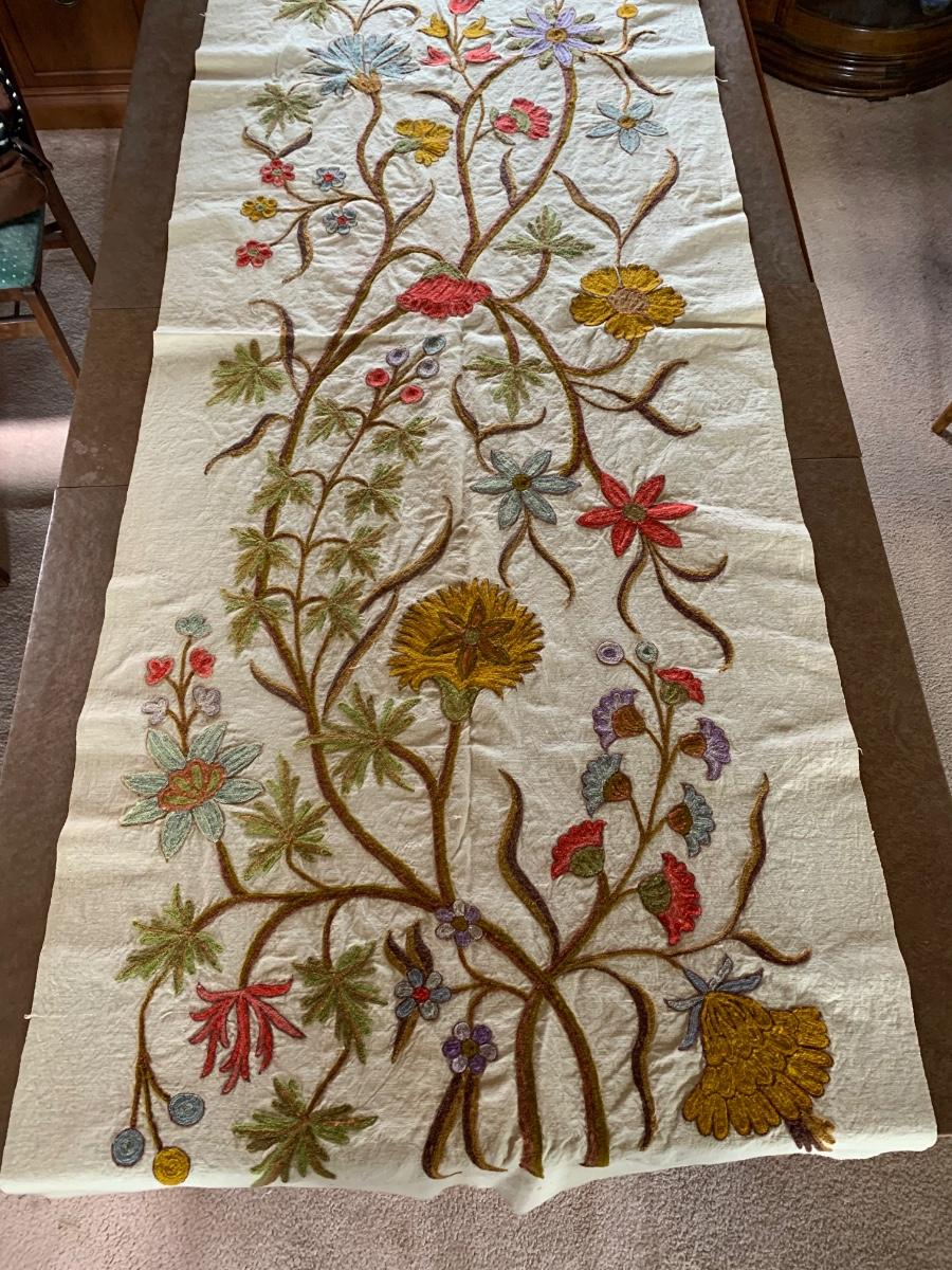 Beautiful tapestry which appear to be Crewel Embroidered. I am unable to determine is it hand stitched or by machine embroidered.