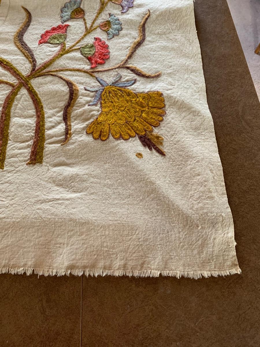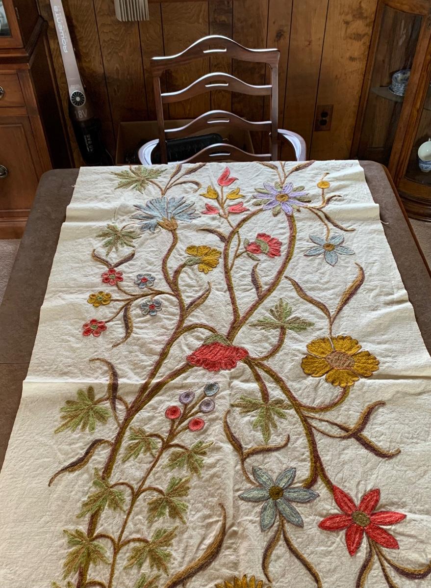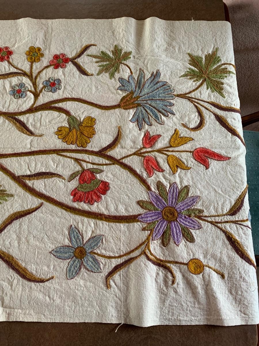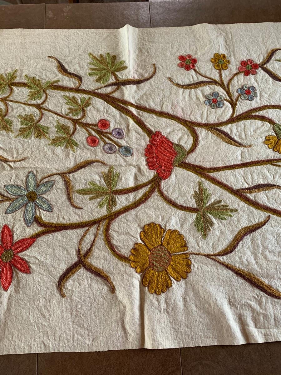 Beautiful tapestry which appear to be Crewel Embroidered. I am unable to determine is it hand stitched or by machine embroidered.