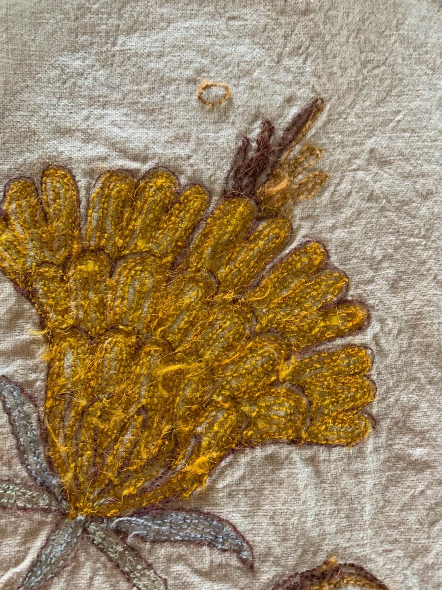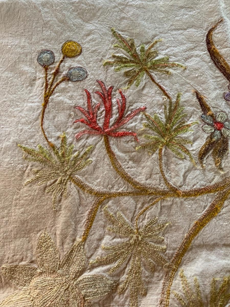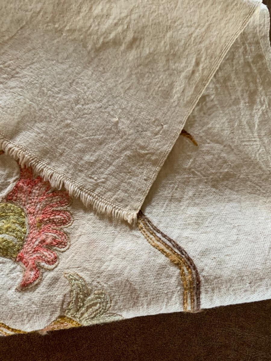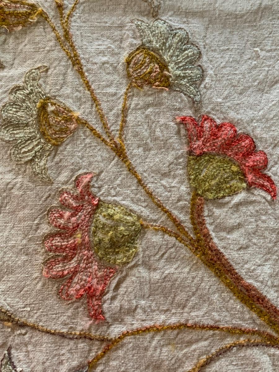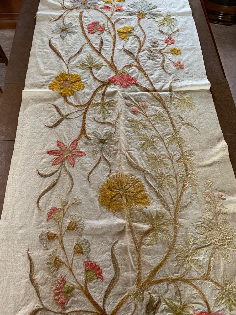 Beautiful tapestry which appear to be Crewel Embroidered. I am unable to determine is it hand stitched or by machine embroidered.