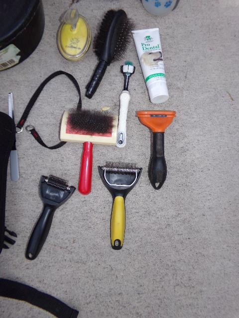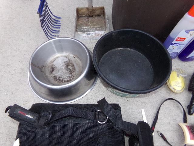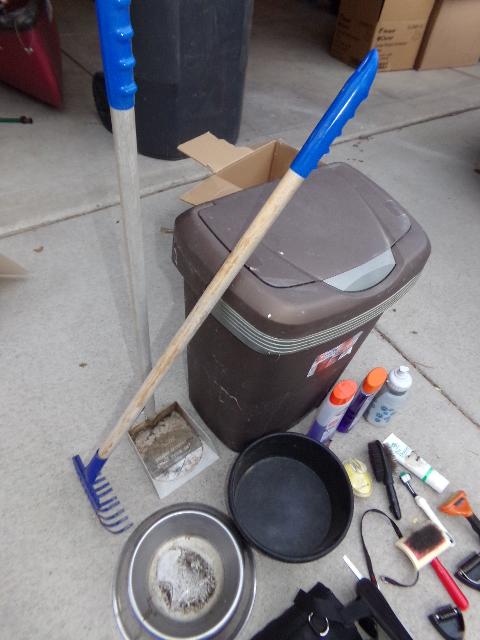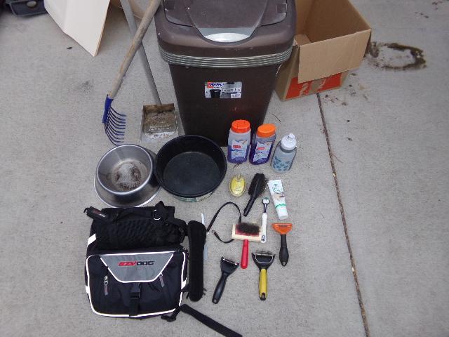 TRASH CAN, DOG WATER/FOOD BOWL, LINT/BRUSHES, SCOOPER WITH RAKE, ETC