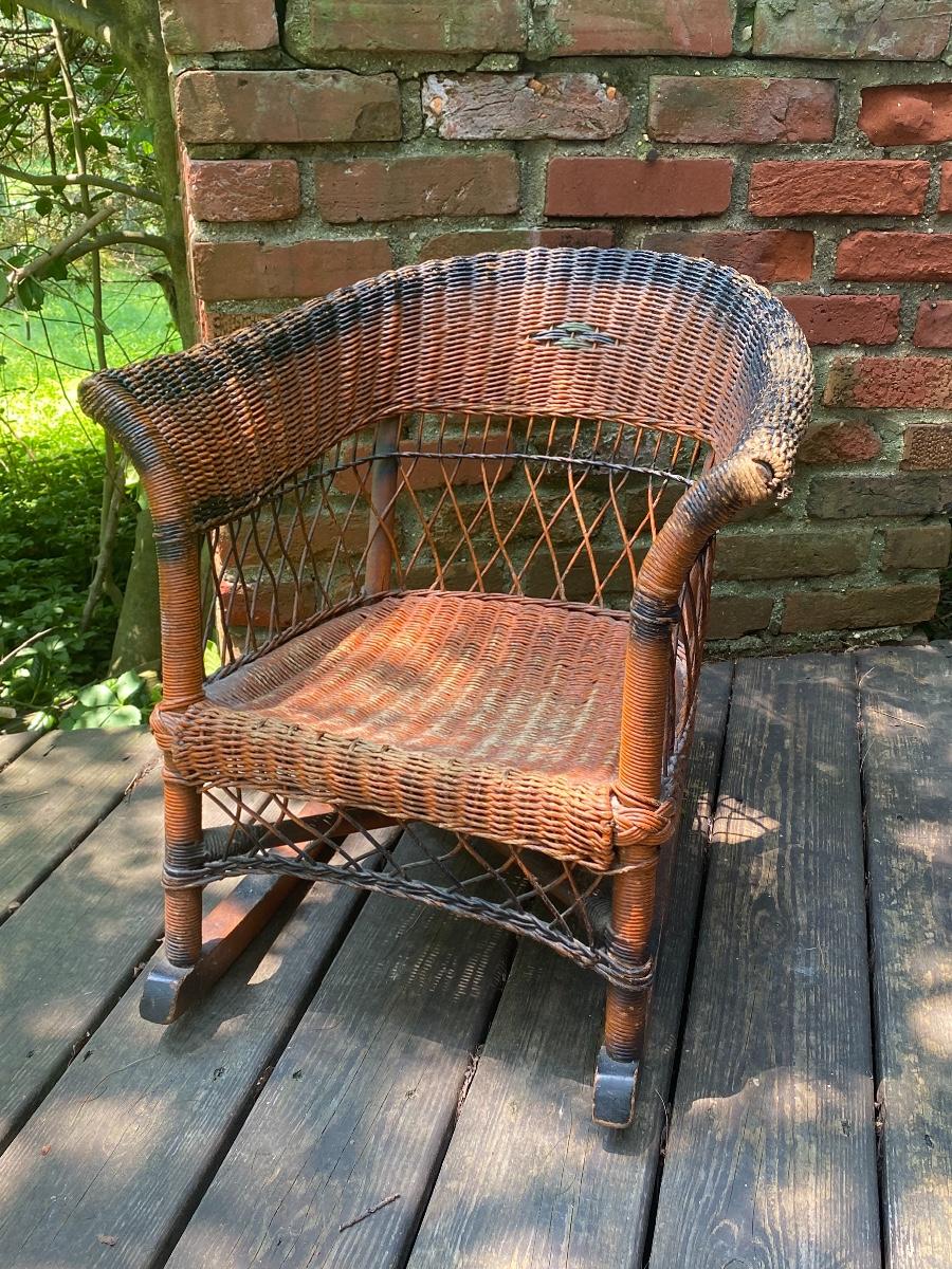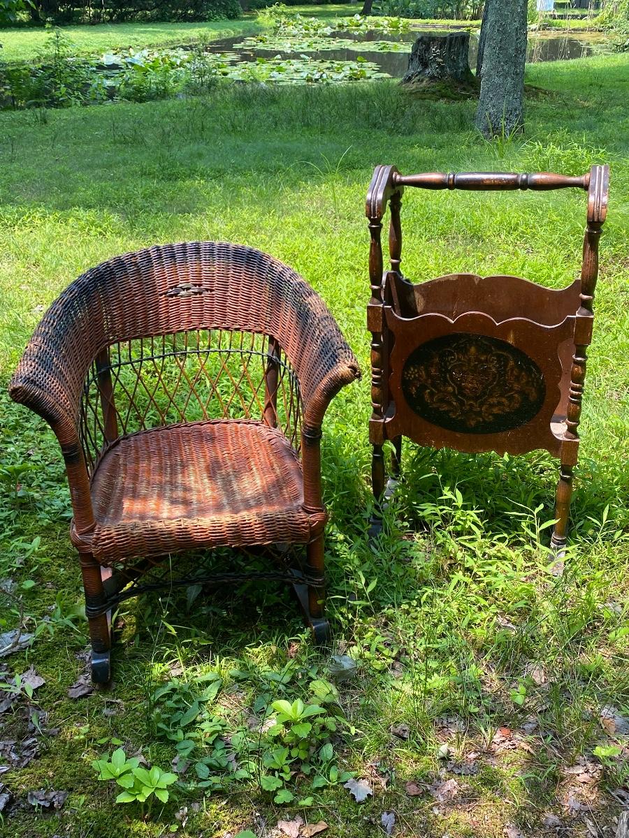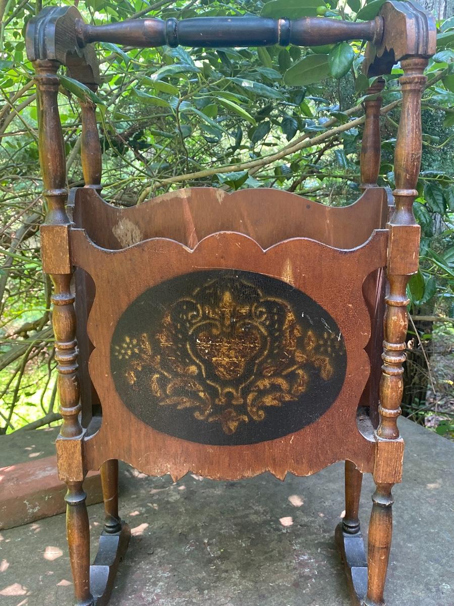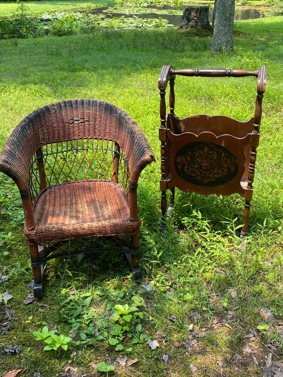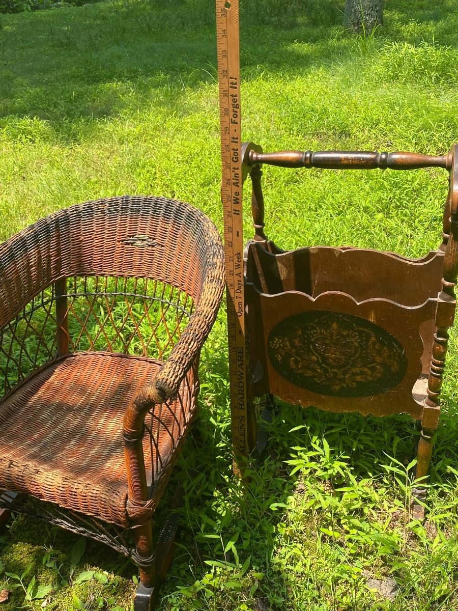 Lot 194: Victorian Wicker Childs Rocker and Wood Carved Magazine Rack