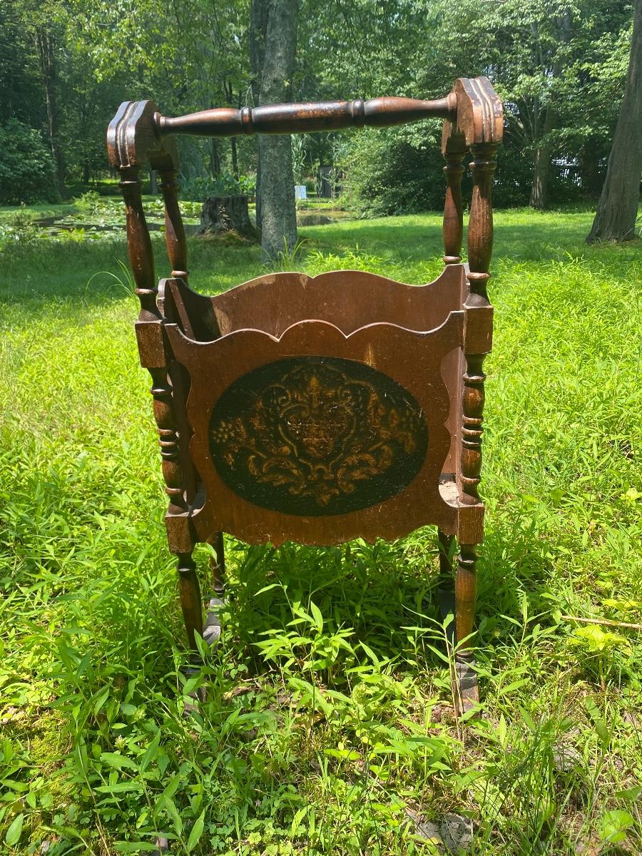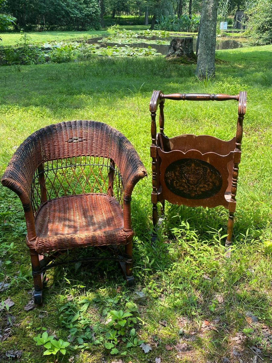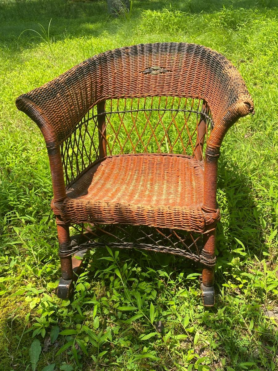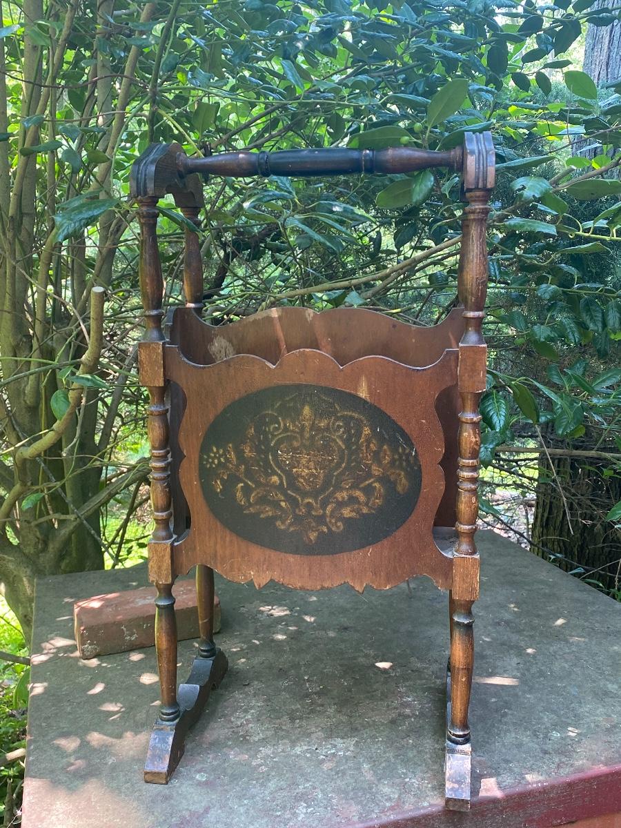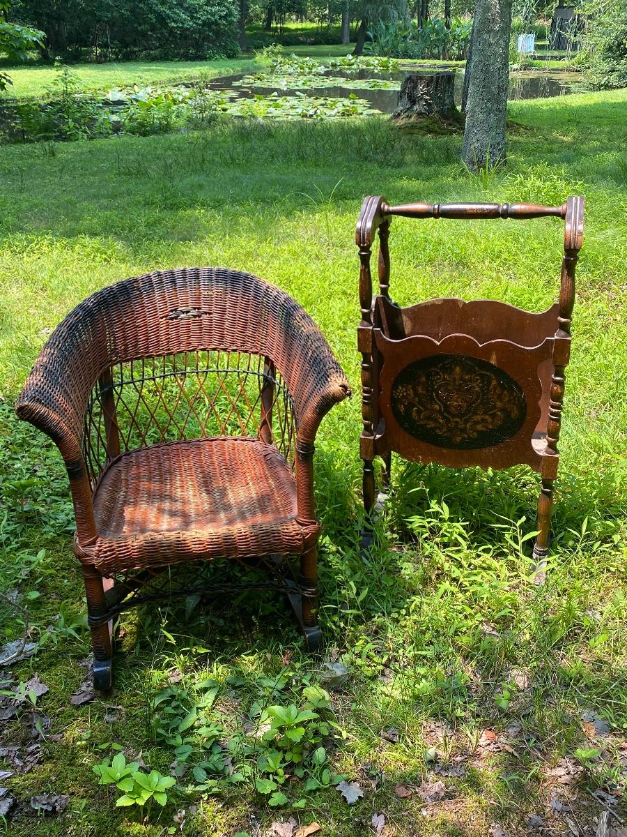 Lot 194: Victorian Wicker Childs Rocker and Wood Carved Magazine Rack
