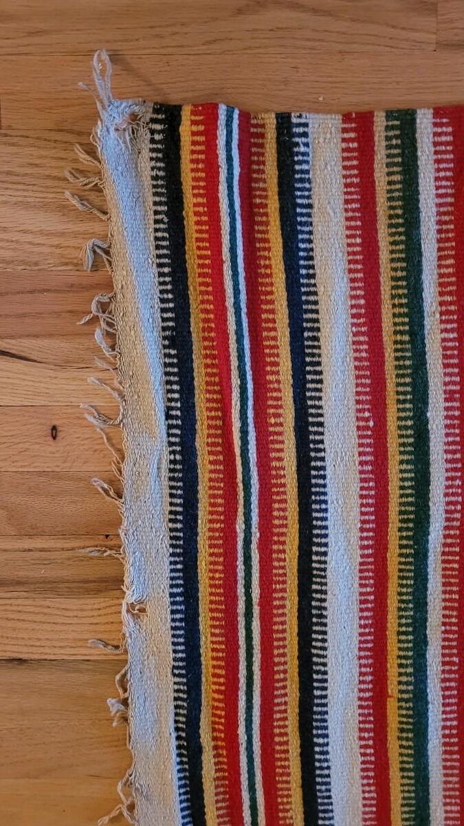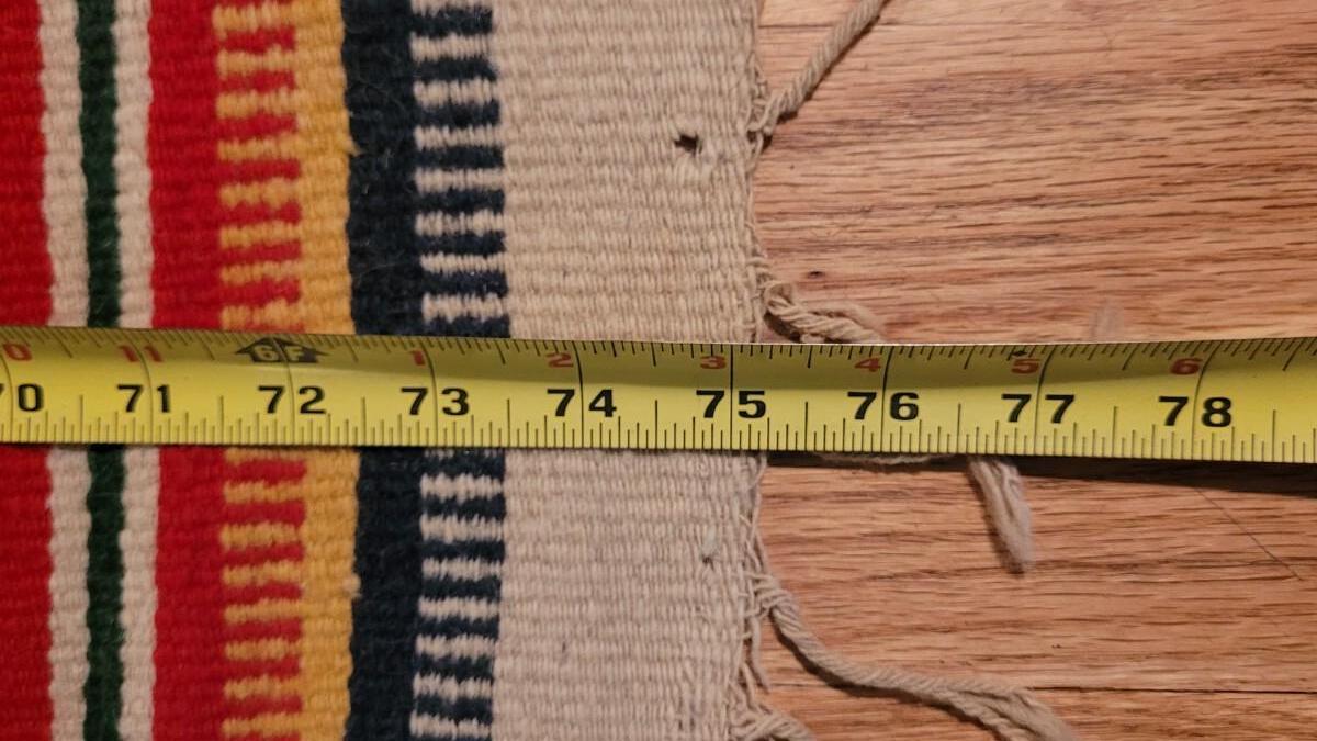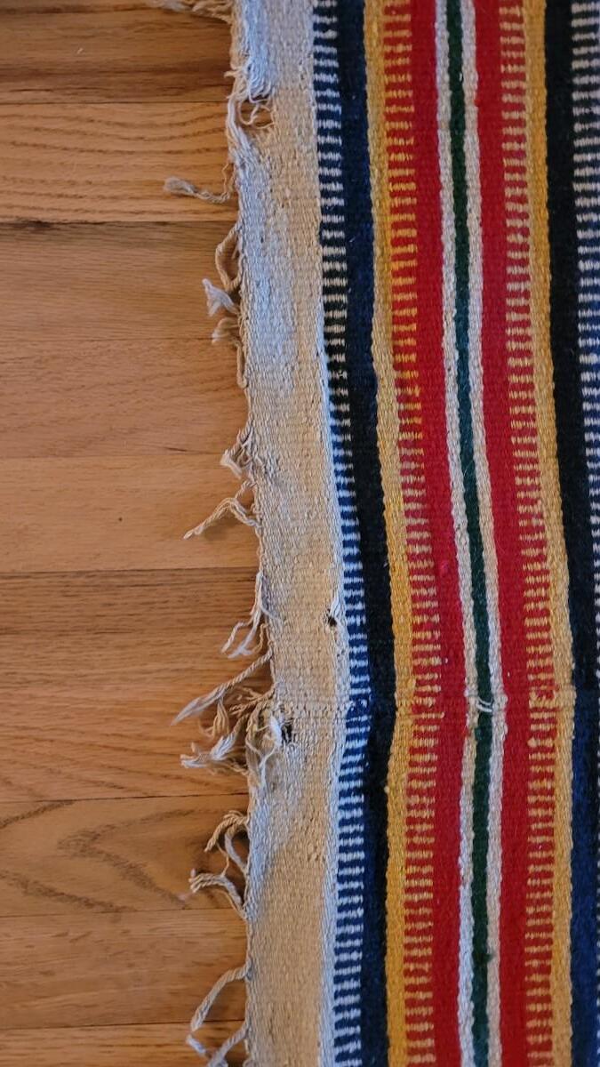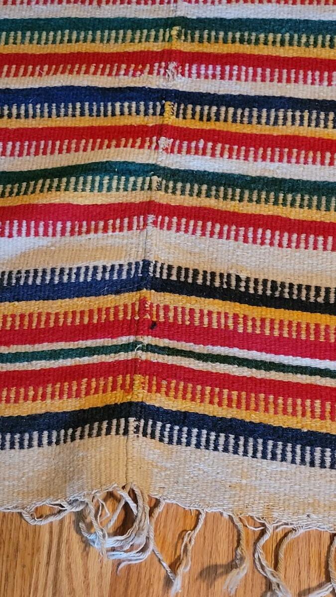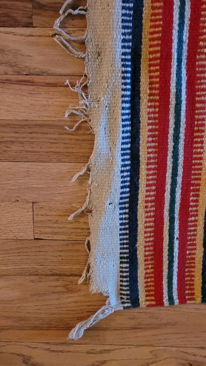 Center hand-sewn seam. Has some holes and color bleeding. Vibrant, beautiful blanket.