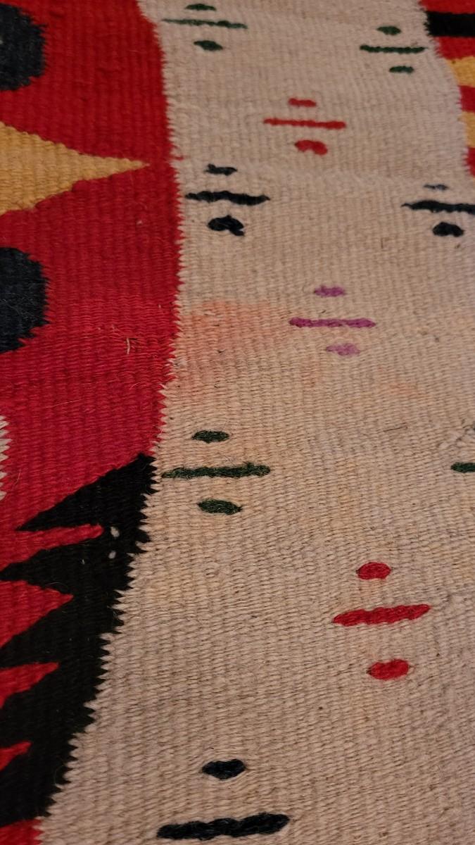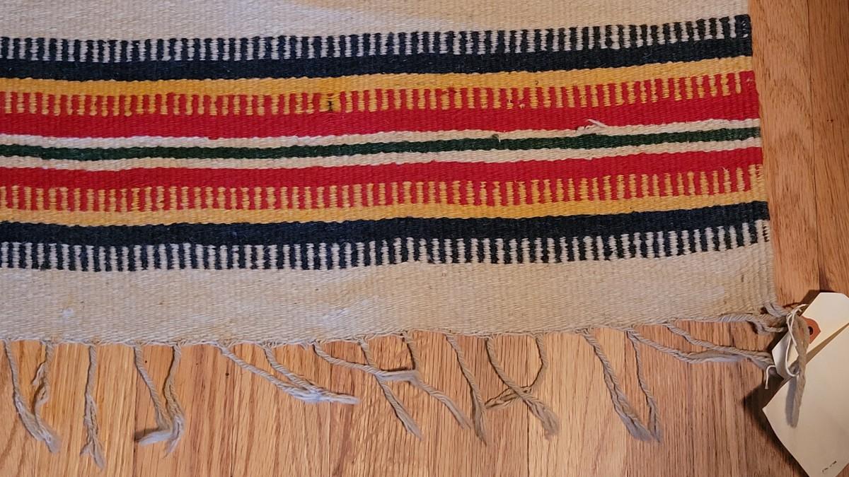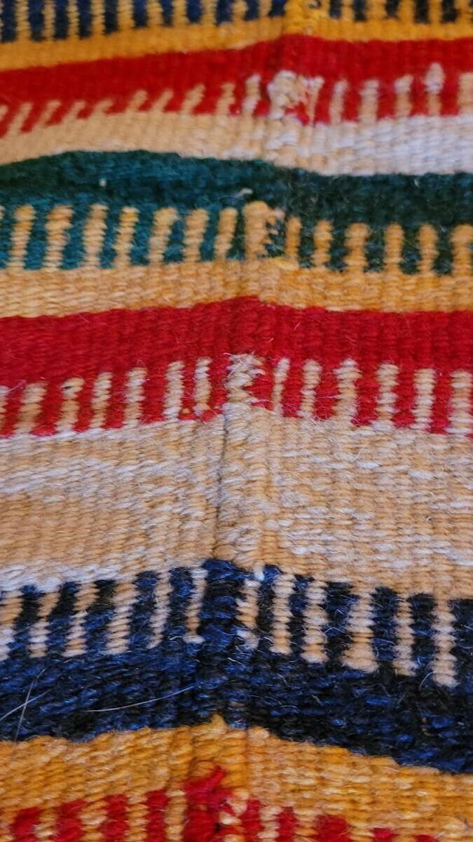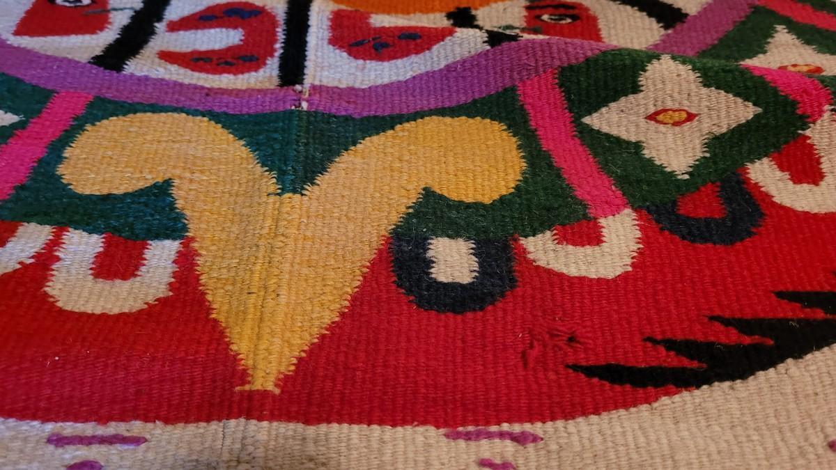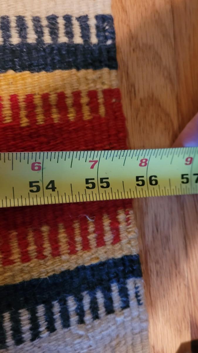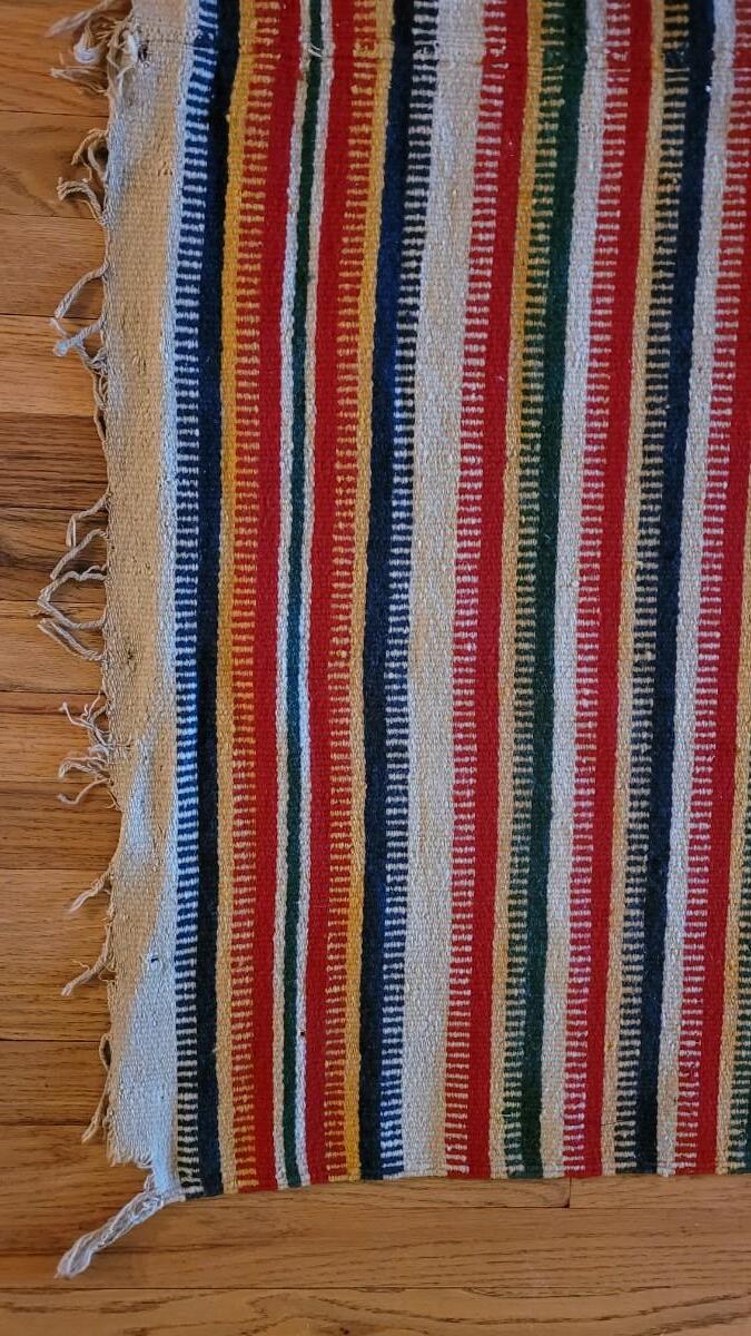 Center hand-sewn seam. Has some holes and color bleeding. Vibrant, beautiful blanket.