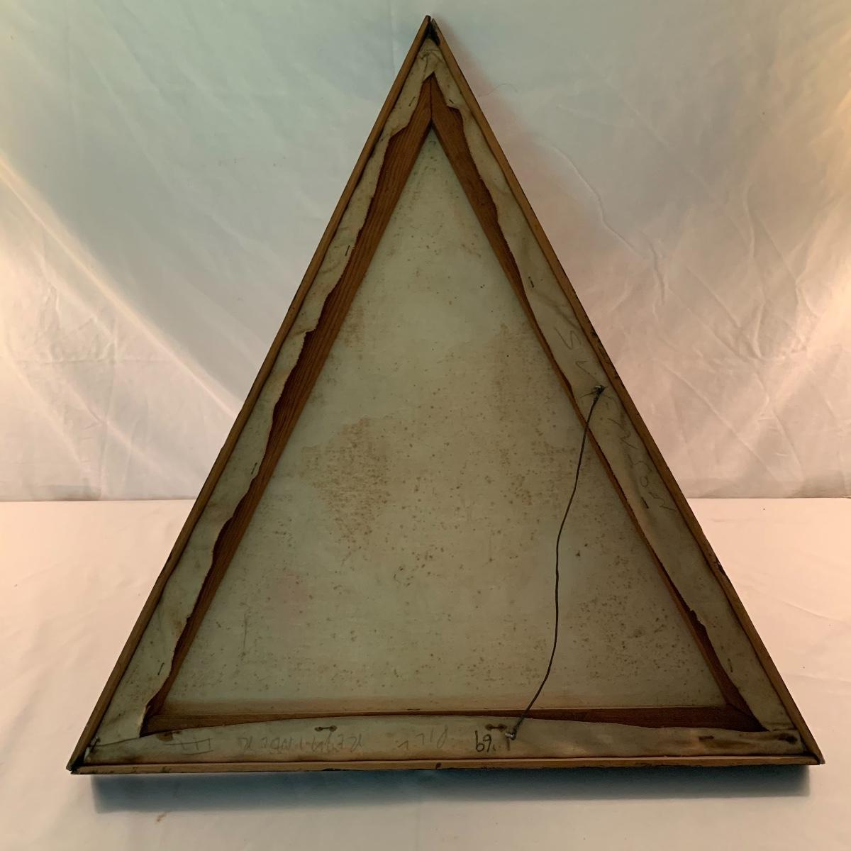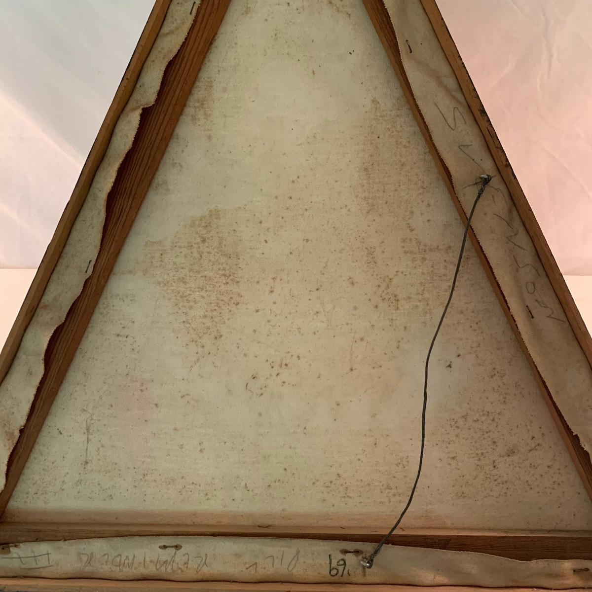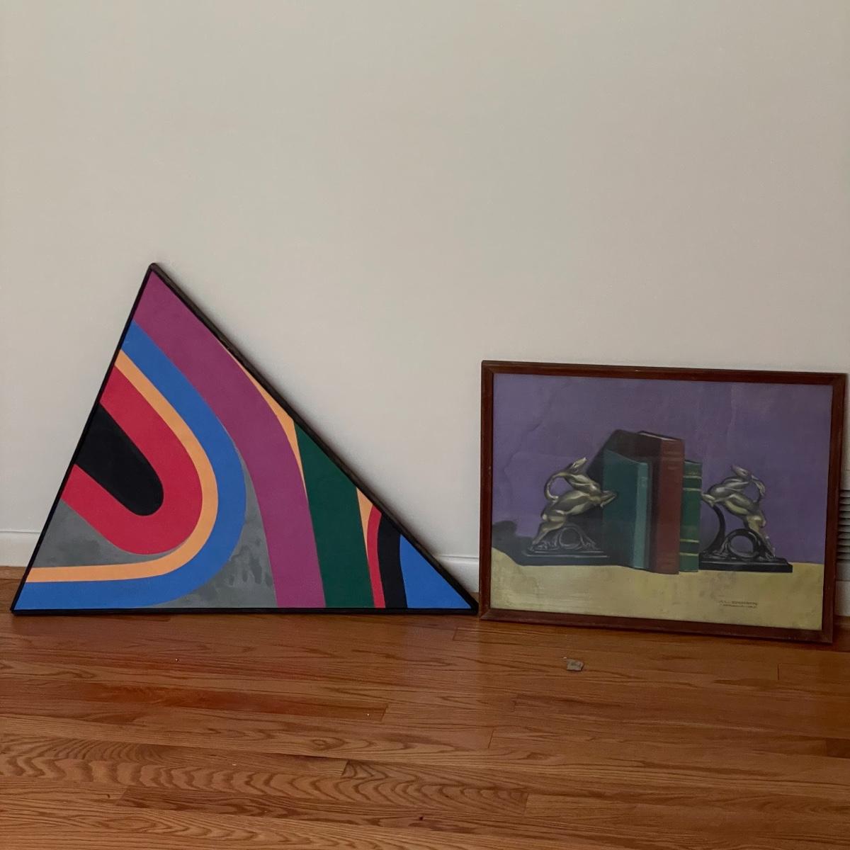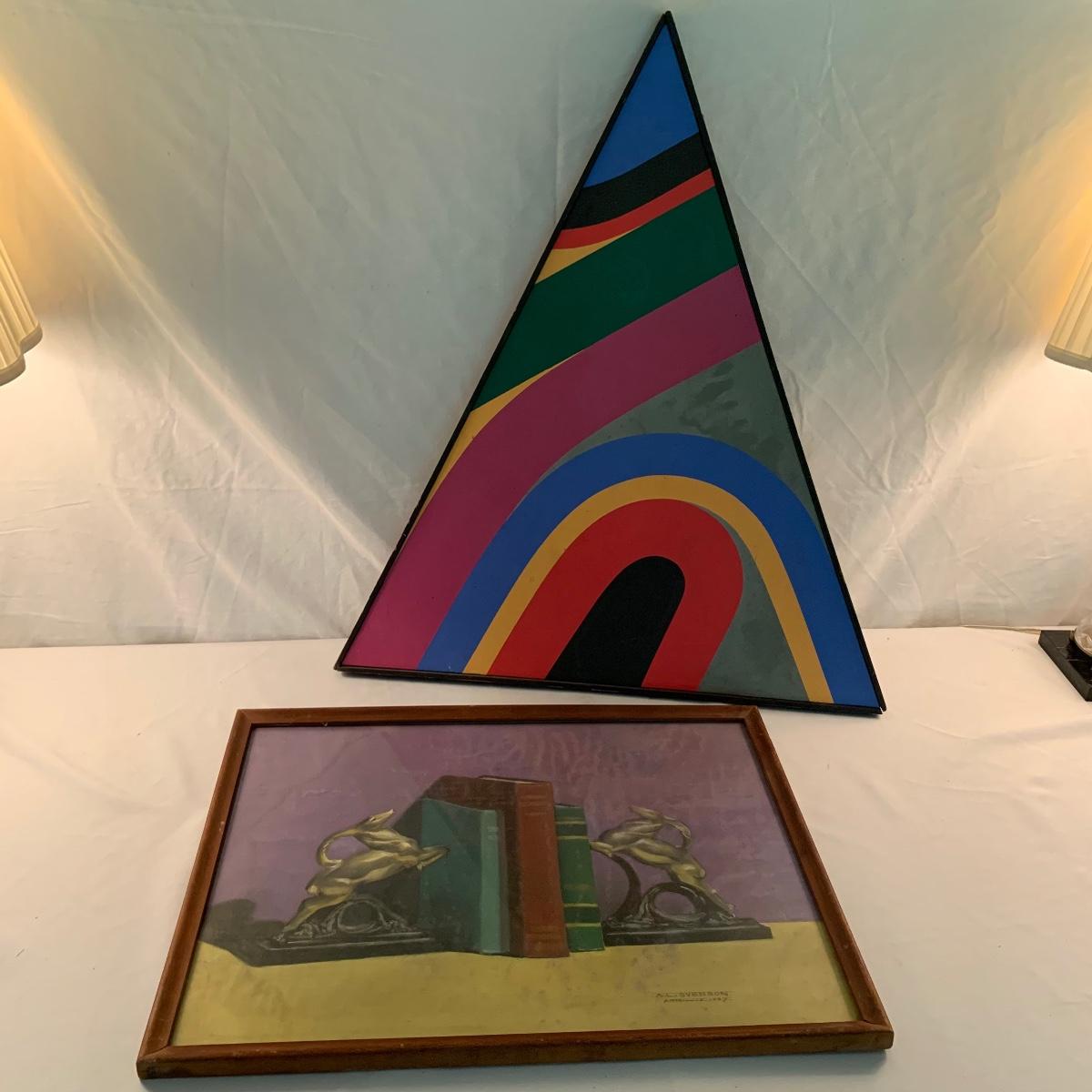 This lot includes one triangular abstract art piece and one pastel art piece. The abstract art piece appears to be painted on a canvas material and is in a wooden frame. The frame needs some tlc as you will see from the images as it has some scratches and loose joins. It measures about 30in x 27in. The other artwork is made using pastels and appears to be signed. The artwork has what appears to be a watermark (see photos). The frame also has some scratches. It measures about 24in x 18in. Shipping available.