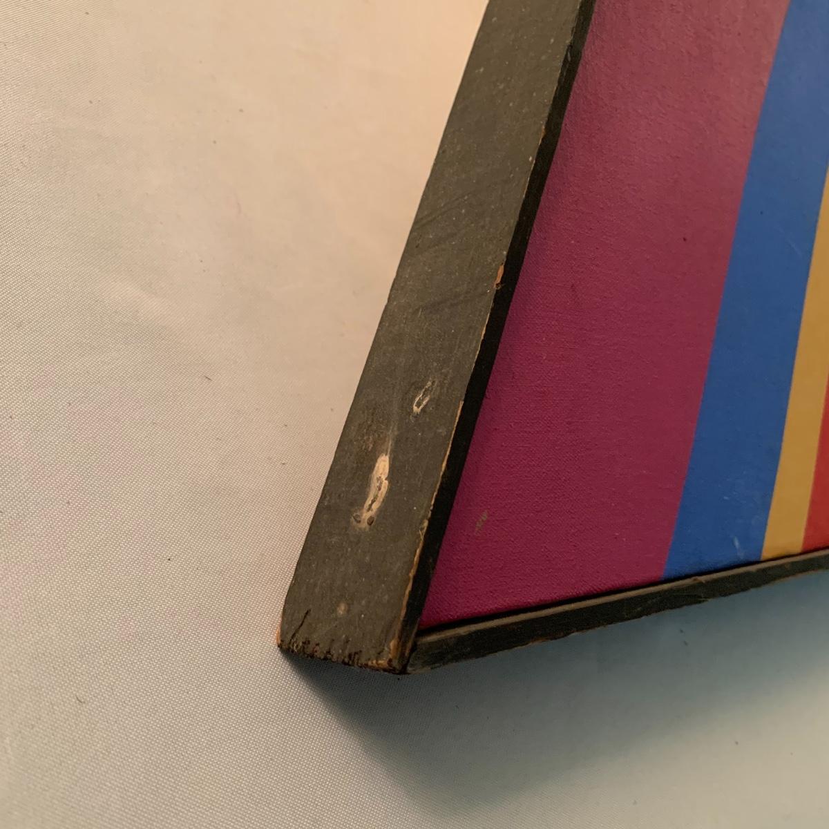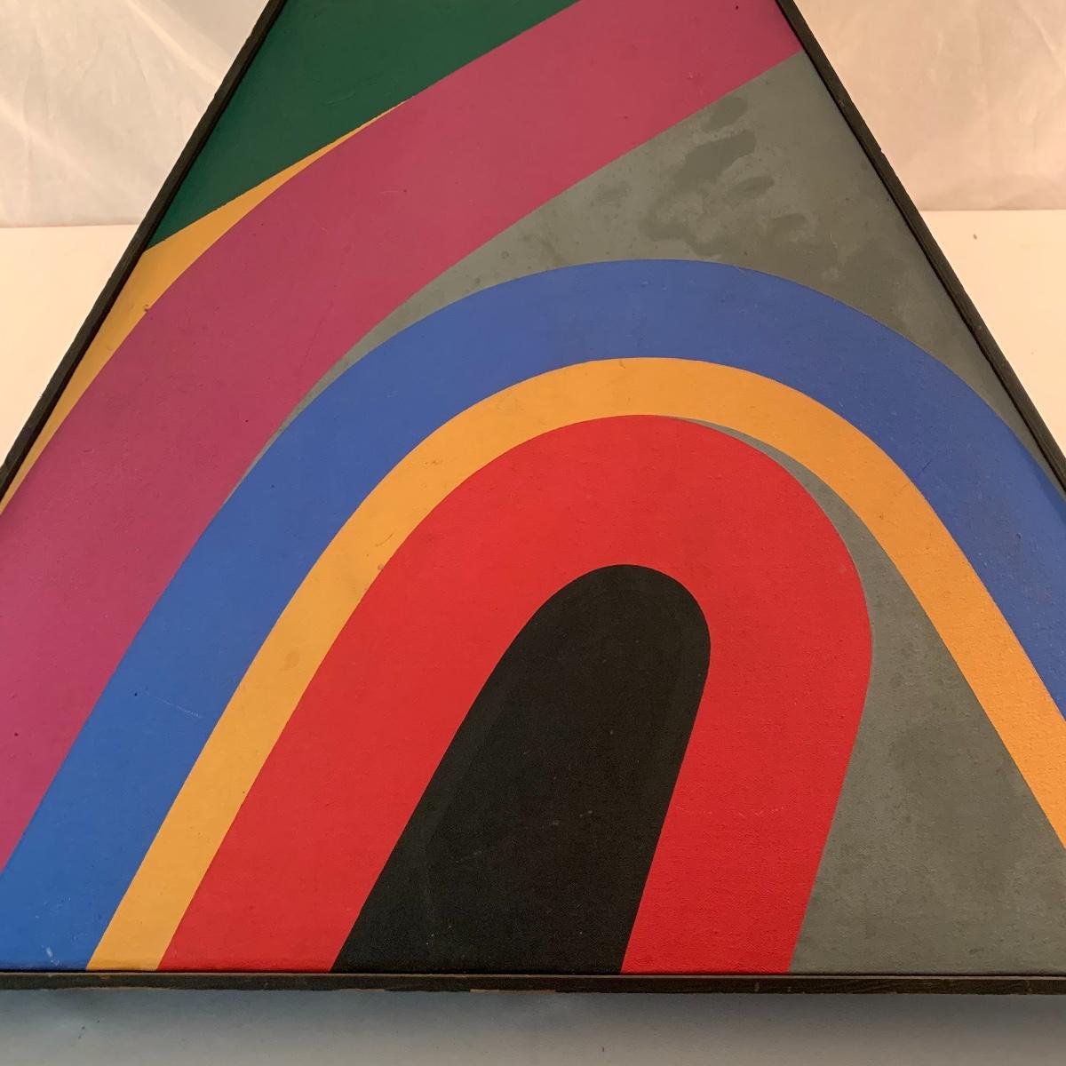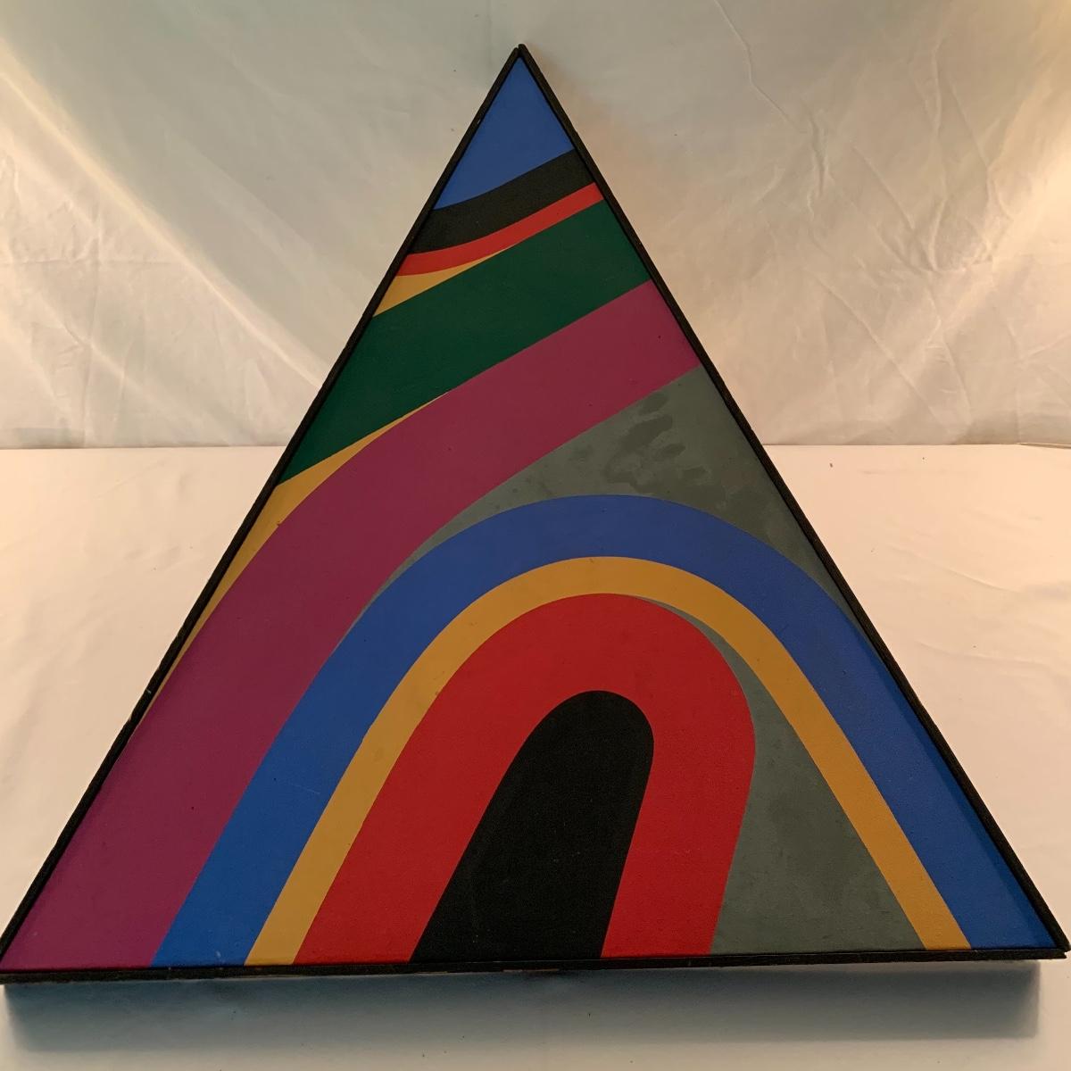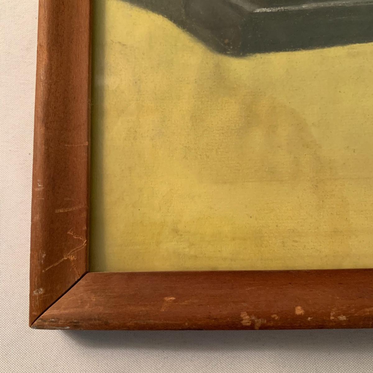 This lot includes one triangular abstract art piece and one pastel art piece. The abstract art piece appears to be painted on a canvas material and is in a wooden frame. The frame needs some tlc as you will see from the images as it has some scratches and loose joins. It measures about 30in x 27in. The other artwork is made using pastels and appears to be signed. The artwork has what appears to be a watermark (see photos). The frame also has some scratches. It measures about 24in x 18in. Shipping available.