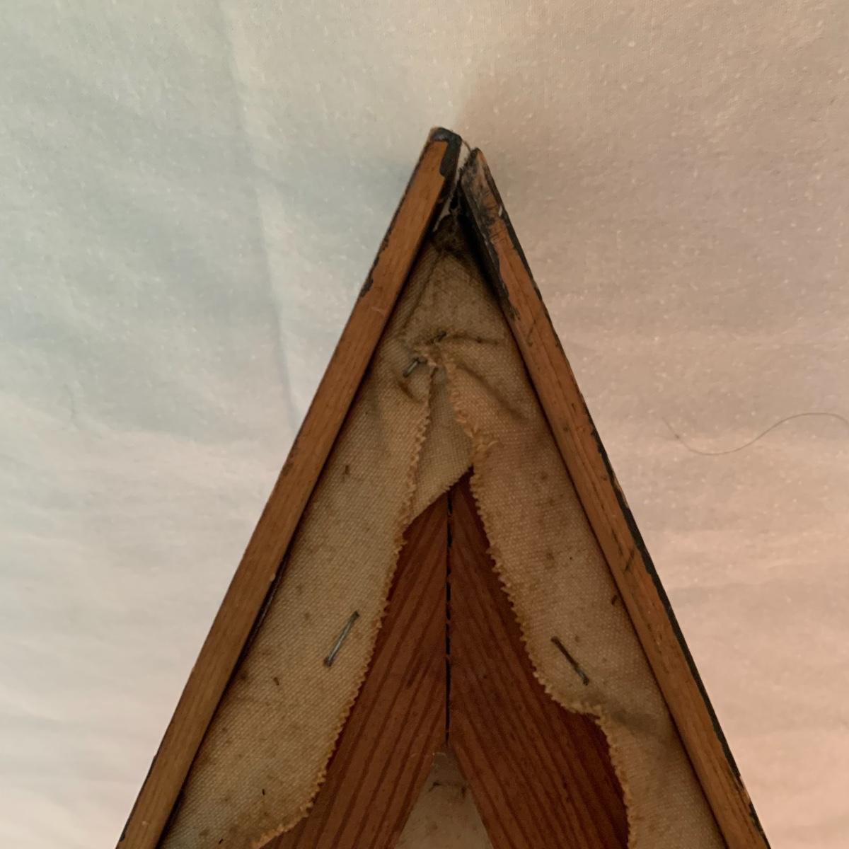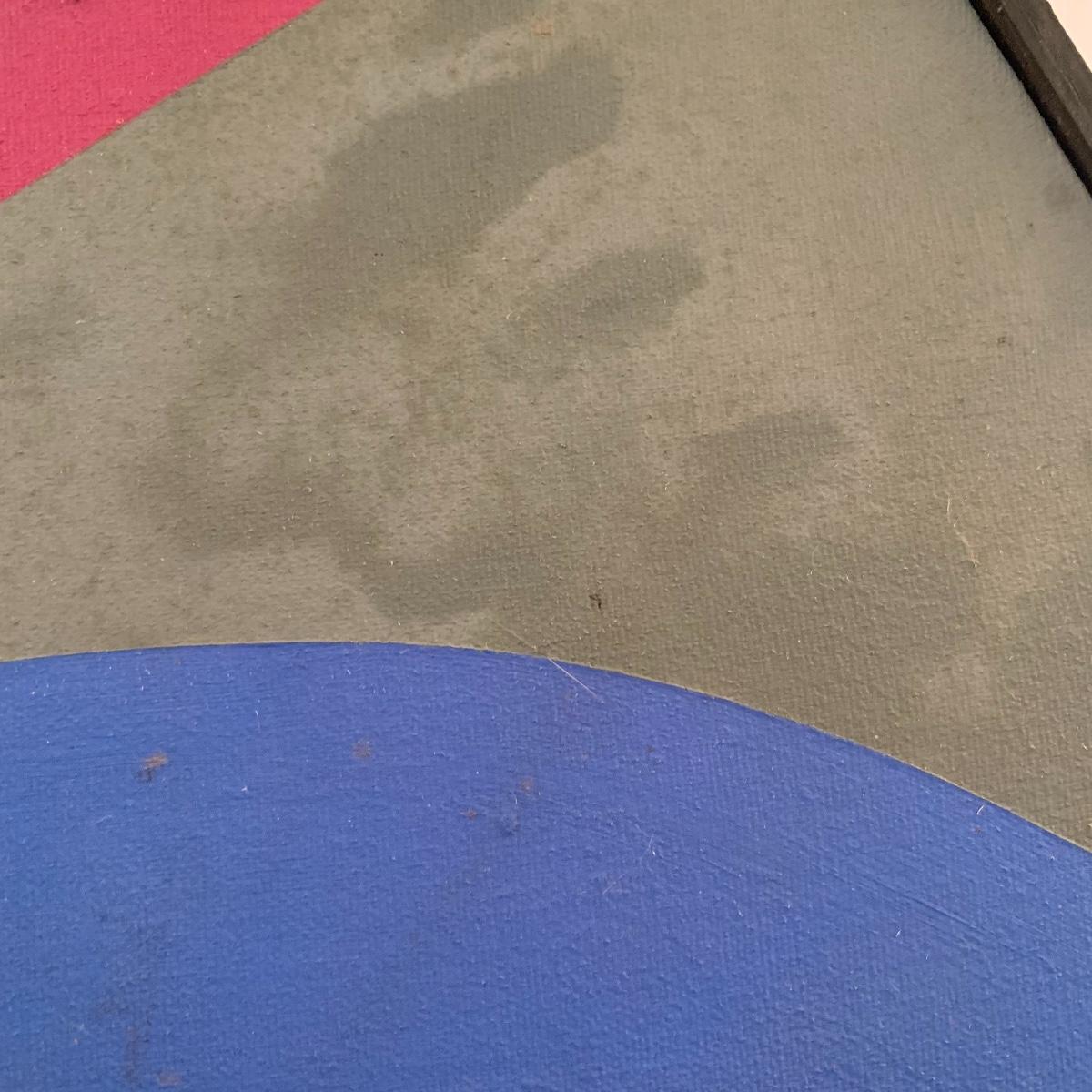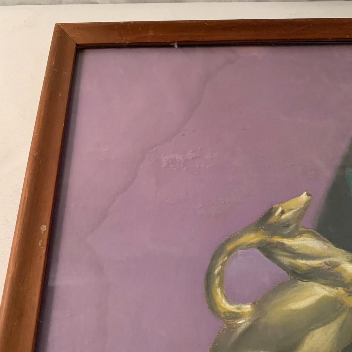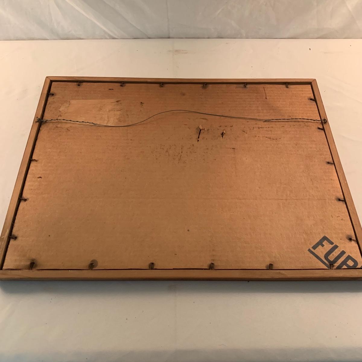 This lot includes one triangular abstract art piece and one pastel art piece. The abstract art piece appears to be painted on a canvas material and is in a wooden frame. The frame needs some tlc as you will see from the images as it has some scratches and loose joins. It measures about 30in x 27in. The other artwork is made using pastels and appears to be signed. The artwork has what appears to be a watermark (see photos). The frame also has some scratches. It measures about 24in x 18in. Shipping available.