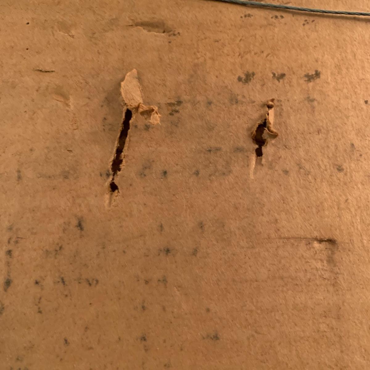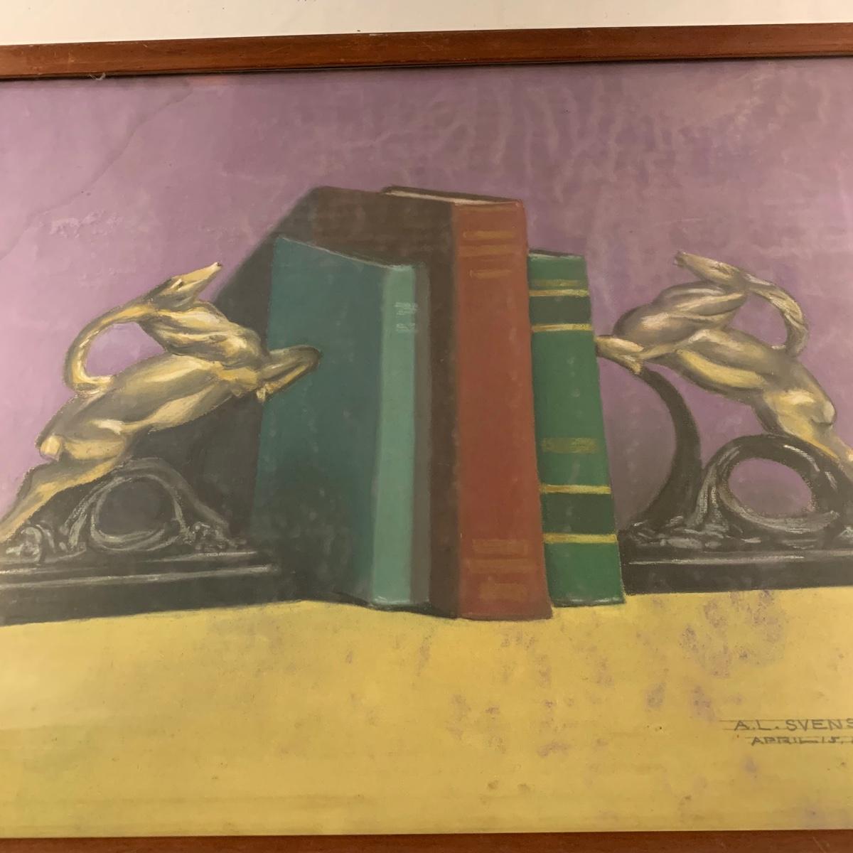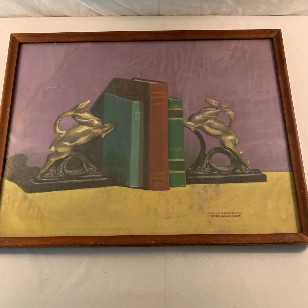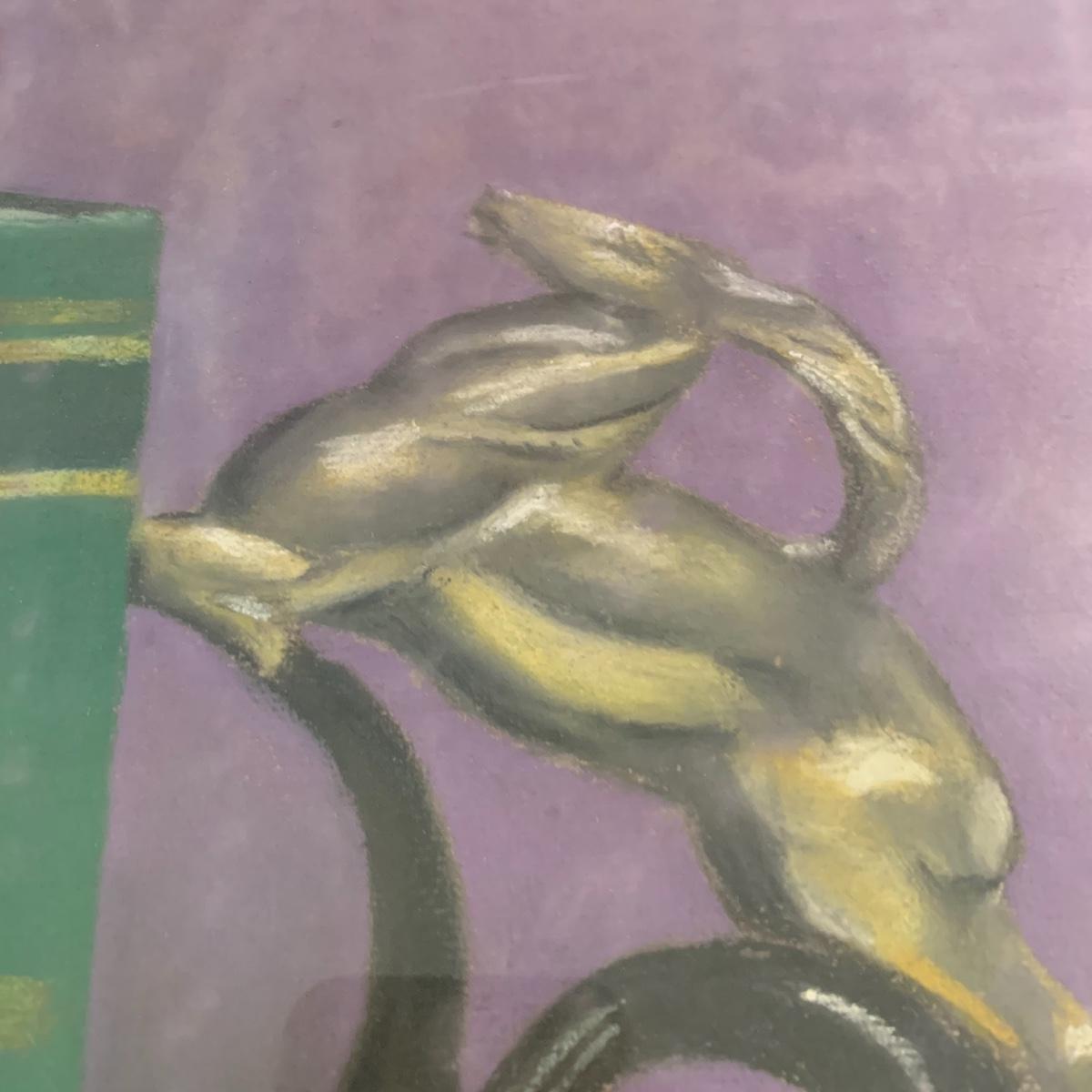 This lot includes one triangular abstract art piece and one pastel art piece. The abstract art piece appears to be painted on a canvas material and is in a wooden frame. The frame needs some tlc as you will see from the images as it has some scratches and loose joins. It measures about 30in x 27in. The other artwork is made using pastels and appears to be signed. The artwork has what appears to be a watermark (see photos). The frame also has some scratches. It measures about 24in x 18in. Shipping available.