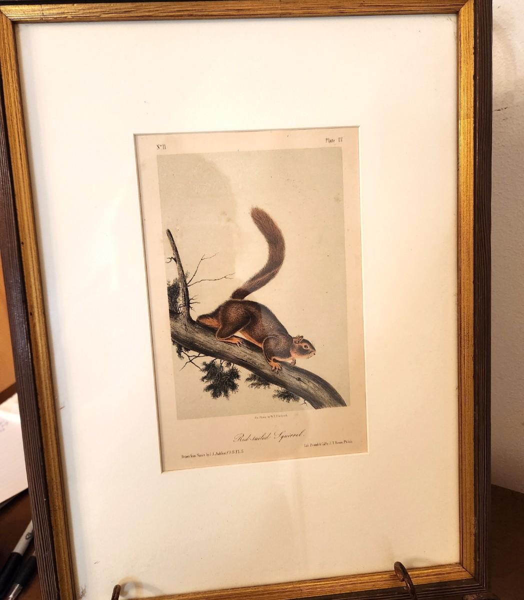 Antique 19th century hand-colored JJ Audubon Print "Red Tailed Squirrel" - part of a series of prints depicting North American mammals that was his last major project. Nicely framed.