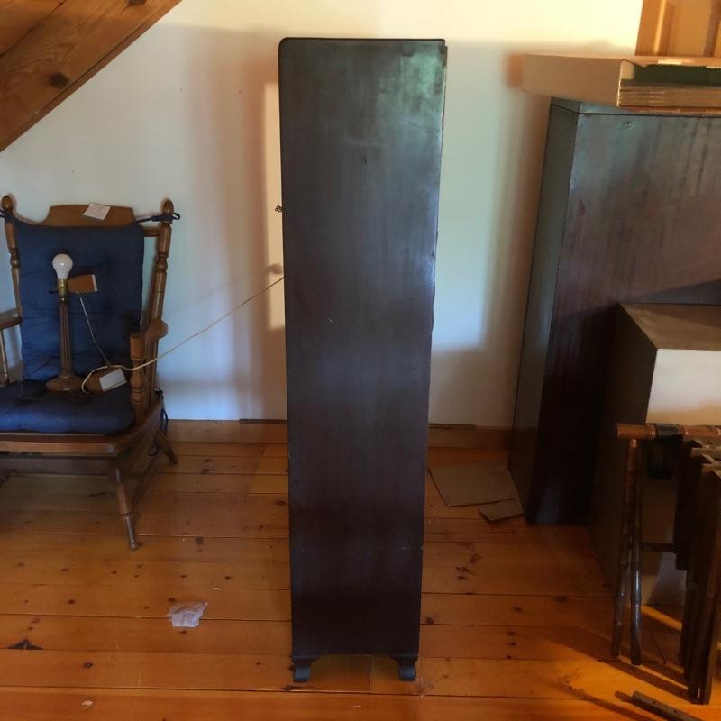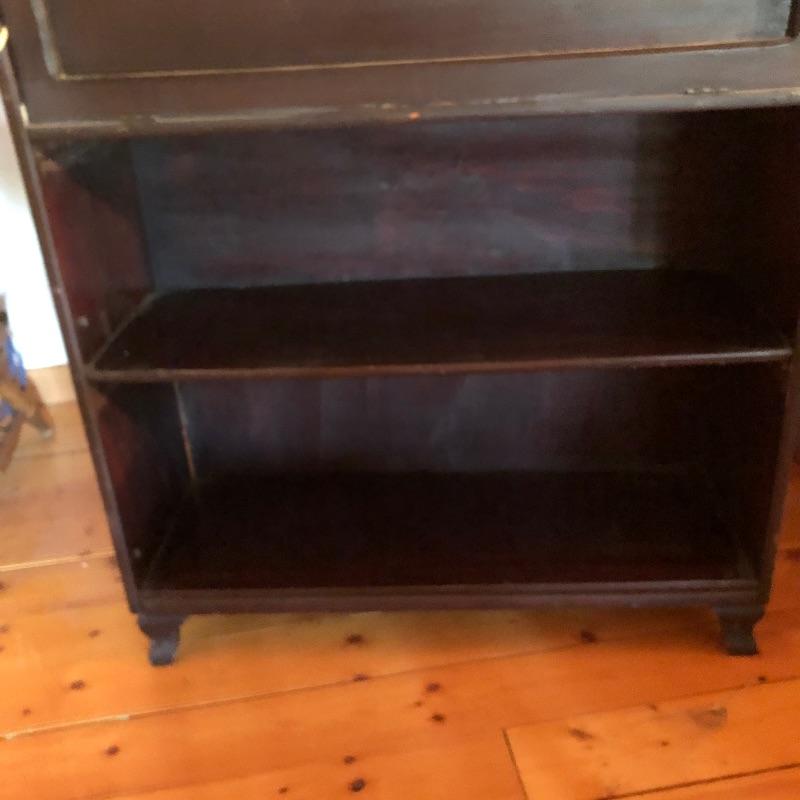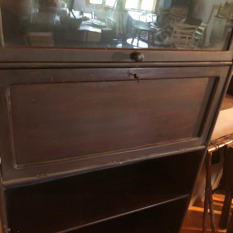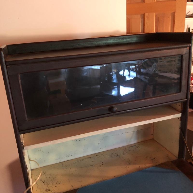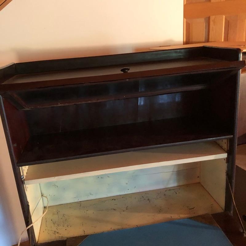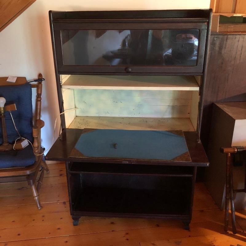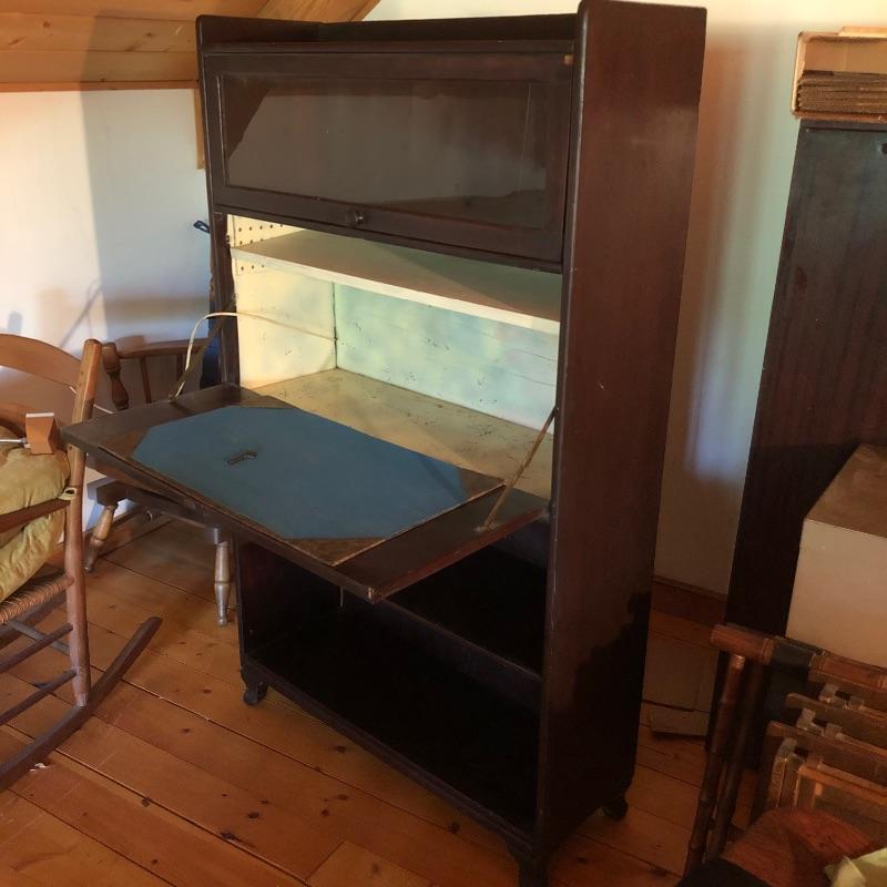 This unique desk is a dark mahogany colored wood. It is a secretary desk style with its drop down door that comes complete with key. It also has two shelves in the bottom half and a third shelf in the writing cabinet and a lawyer bookcase style top cabinet with glass front that opens up and folds into the unit. It’s a wonderful antique desk that is in good shape. Also included is a vintage retro lamp by Underwriters laboratories. see images.