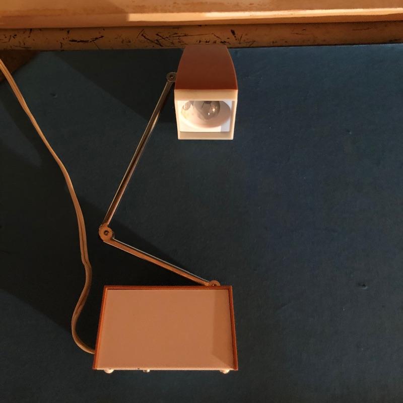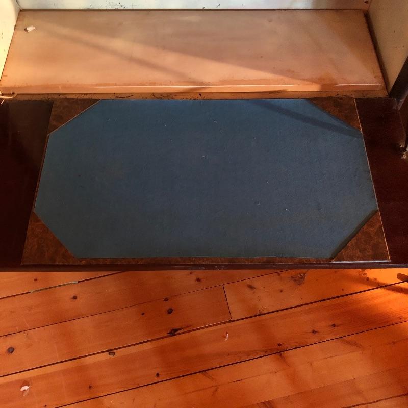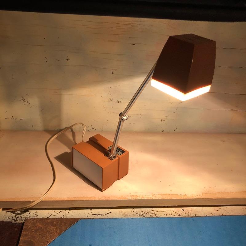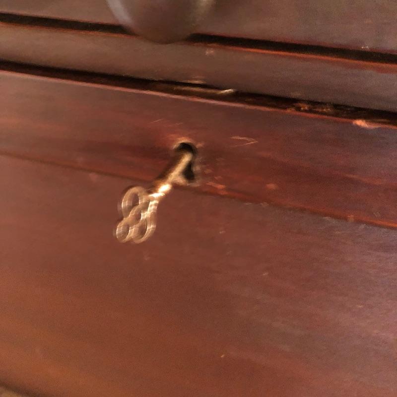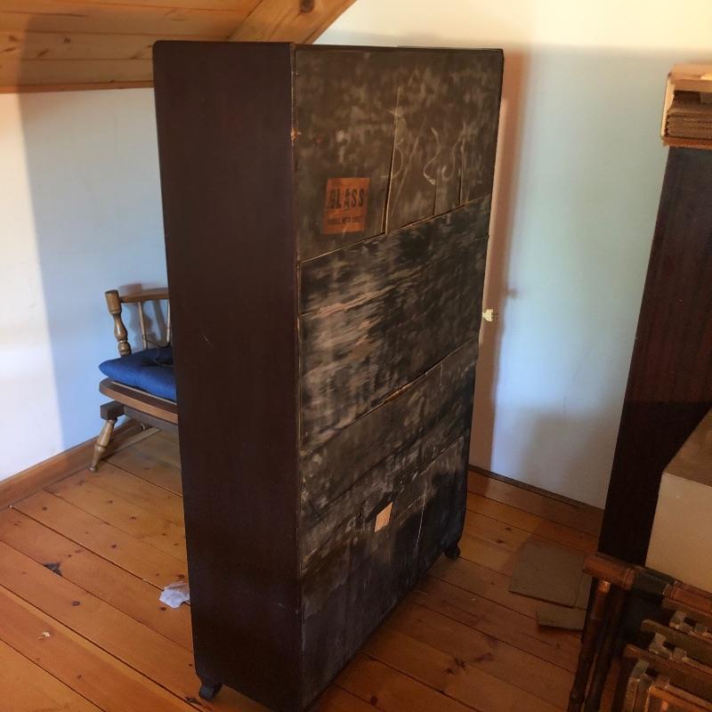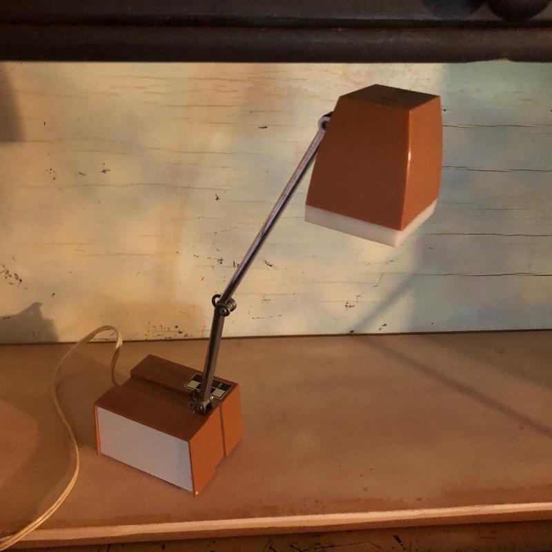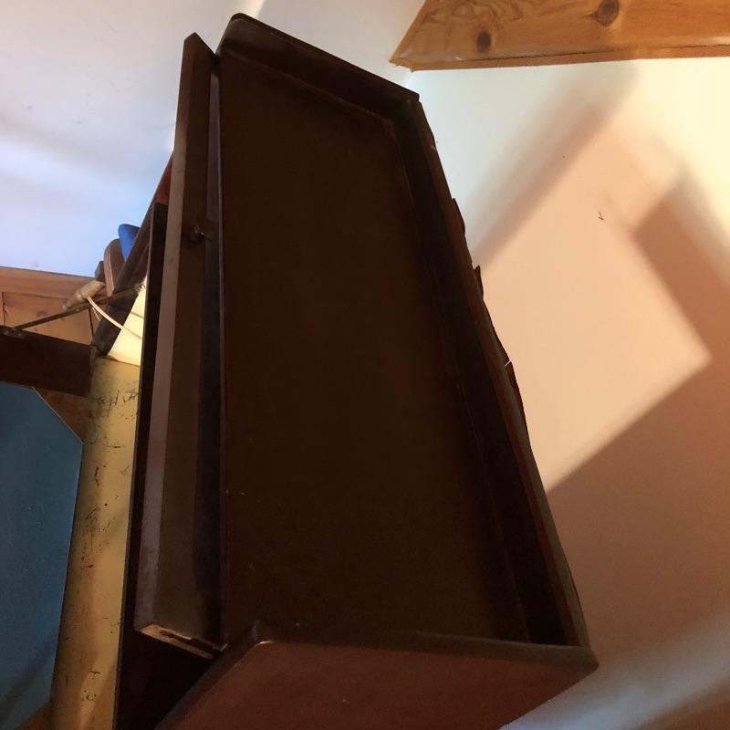 This unique desk is a dark mahogany colored wood. It is a secretary desk style with its drop down door that comes complete with key. It also has two shelves in the bottom half and a third shelf in the writing cabinet and a lawyer bookcase style top cabinet with glass front that opens up and folds into the unit. It’s a wonderful antique desk that is in good shape. Also included is a vintage retro lamp by Underwriters laboratories. see images.