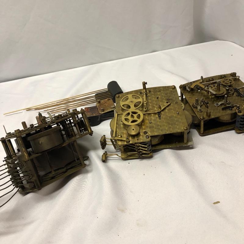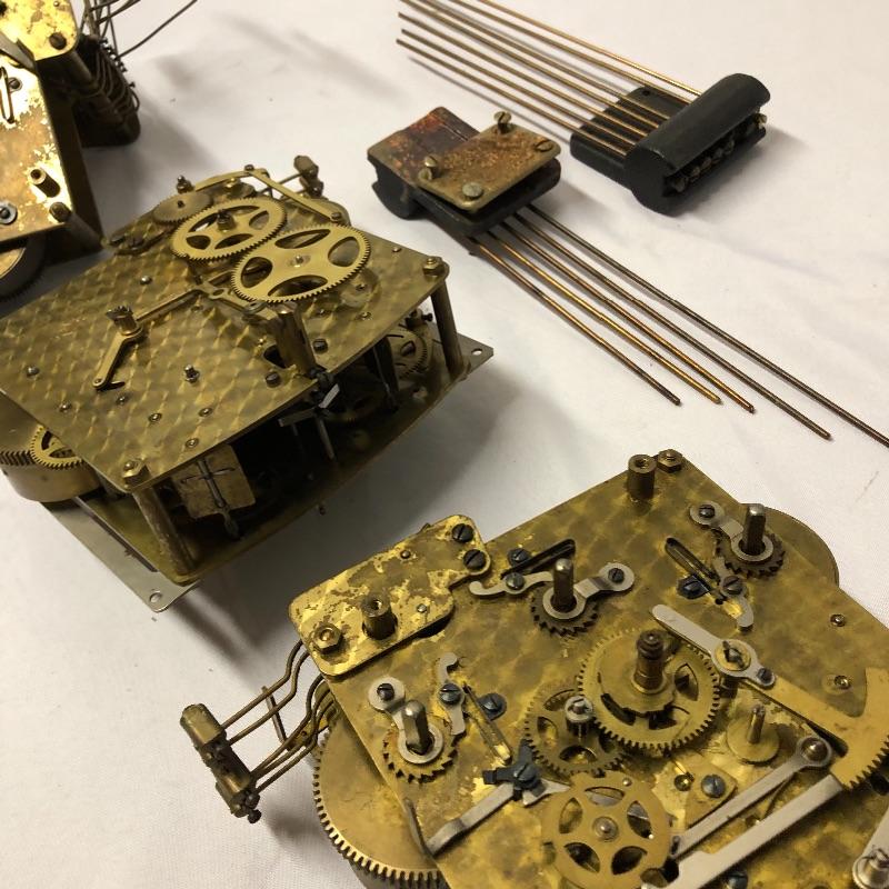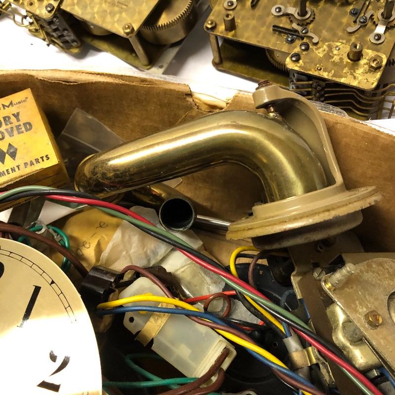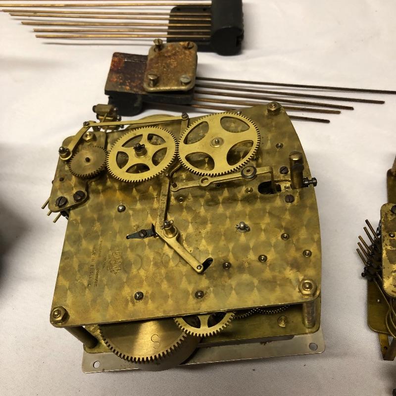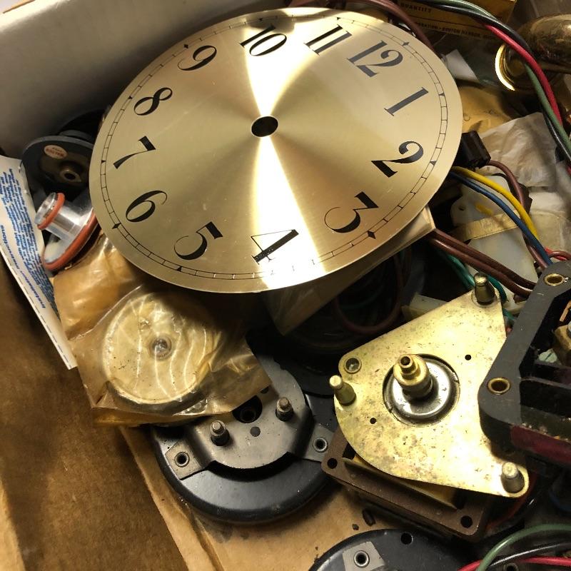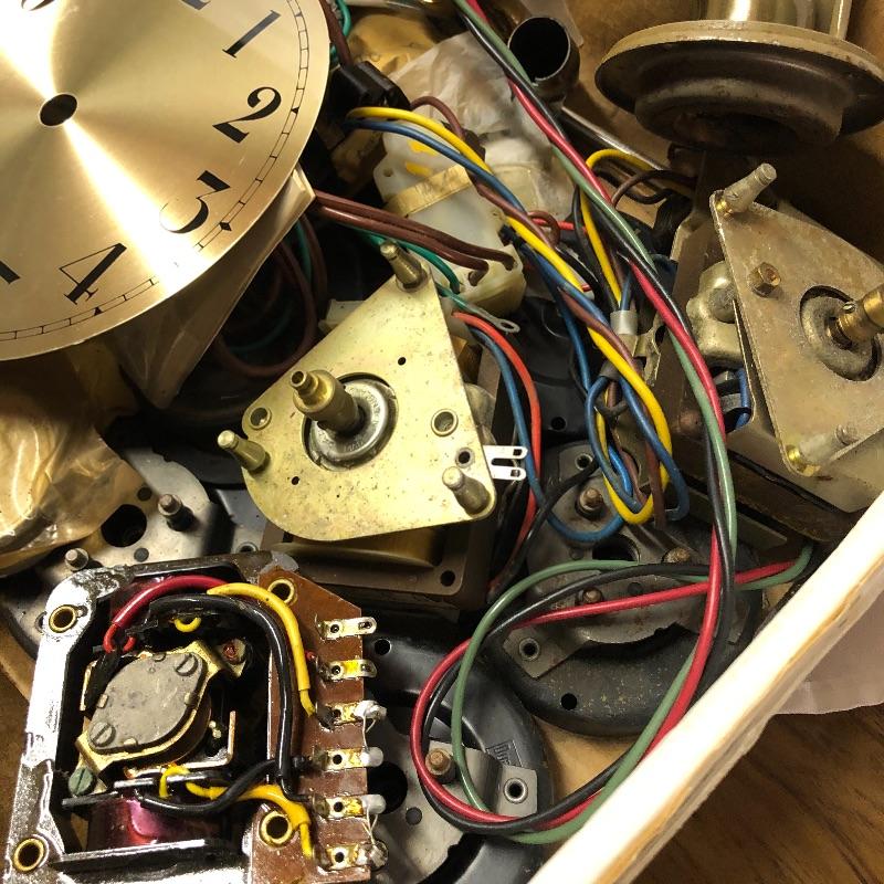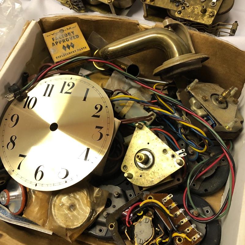 This lot include three internal clock mechanisms and other clock parts. It also likely includes some radio/turntable parts.