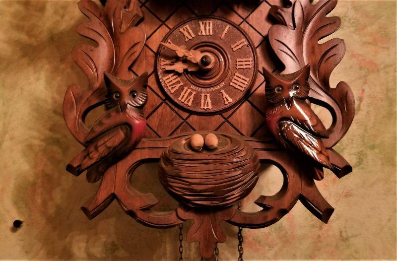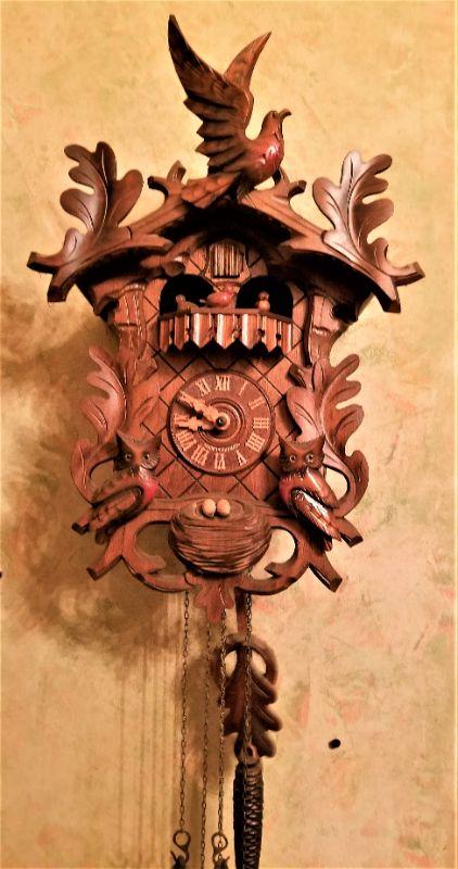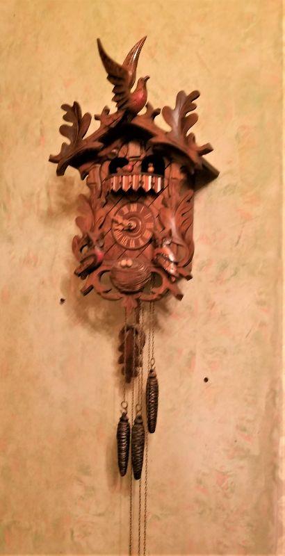 This carved "made in Germany" cuckoo clock has little moving figures that come out to the tune of "Edelweiss' on the hour and two carved owls on the side that also move when the little cuckoo bird comes out. Appears to be in decent working condition. I love this one. Measures 19" long, not counting the pendulum.