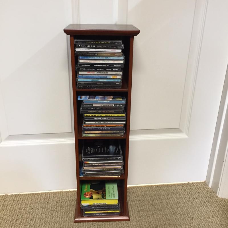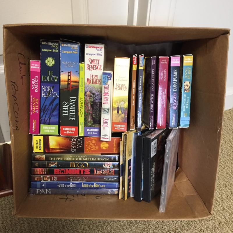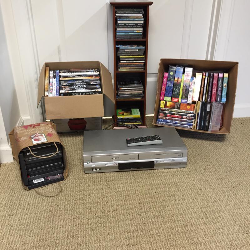 DVD /VHS Player by Toshiba includes remote control. Lot also includes DVDs, CDs (with stand) and a collection of Books on CD. The CD Tower measures 25” Tall. This is a great entertainment collection. Local Pickup Only