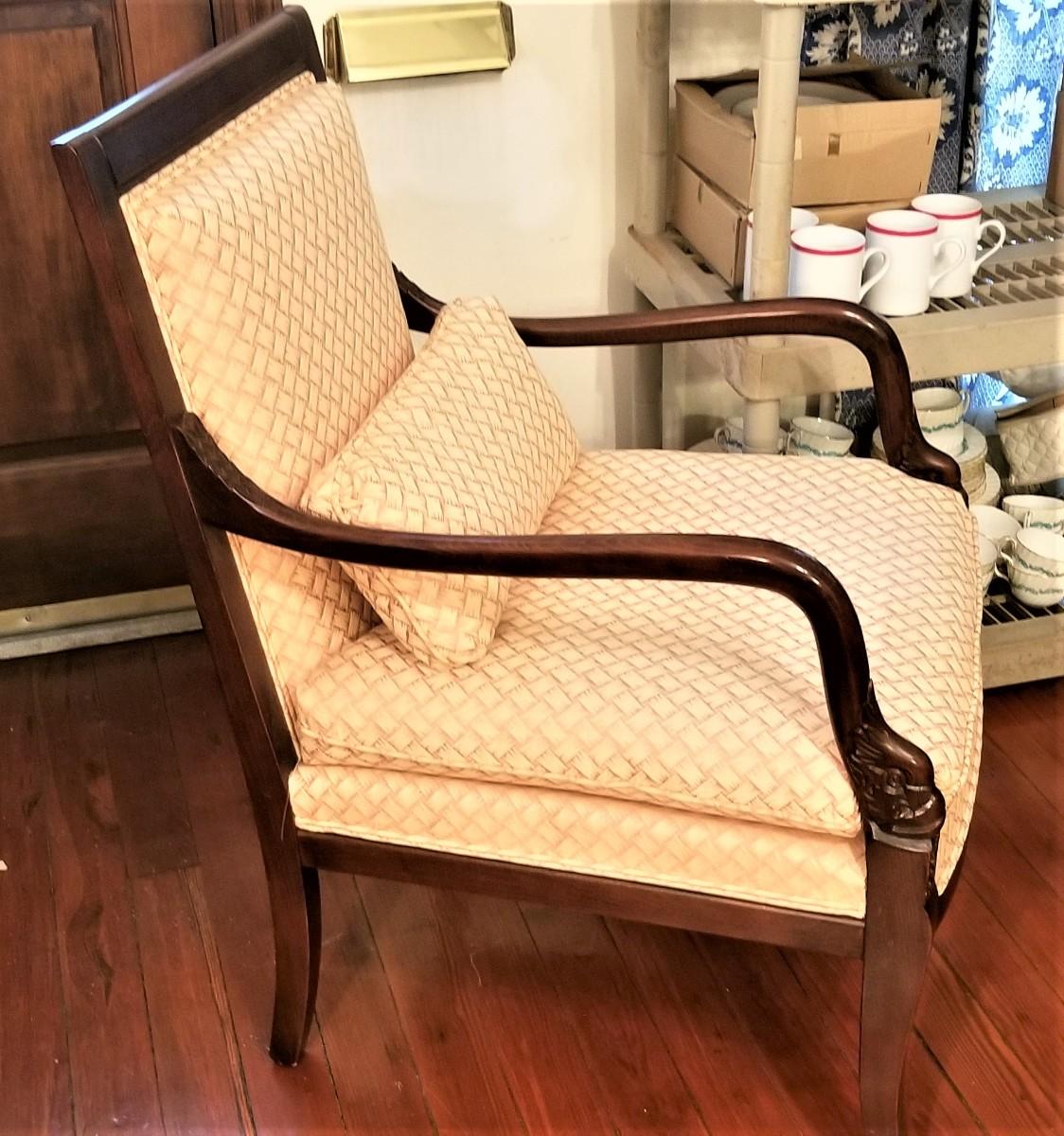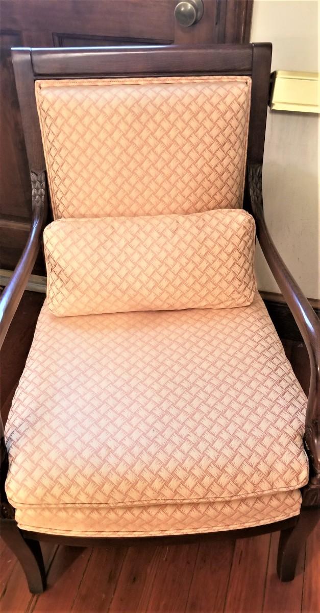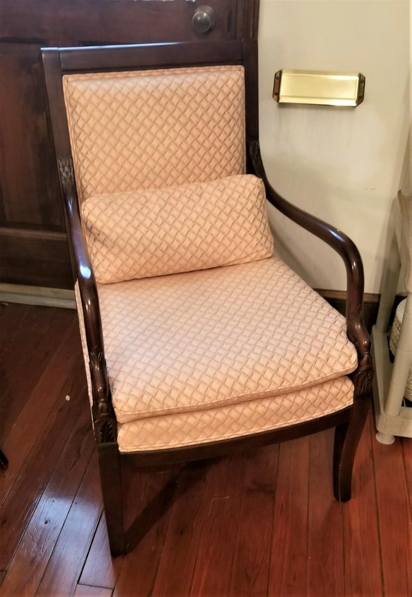 Nice Ethan Allen Arm Chair - bolster pillow - good condition. Measures 24" across, 24" deep, 37" tall.