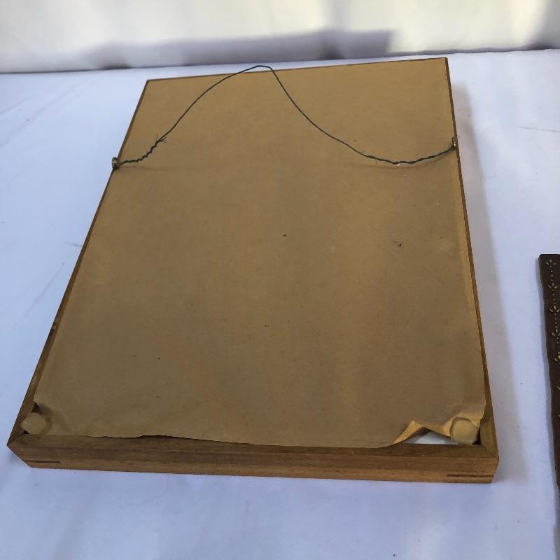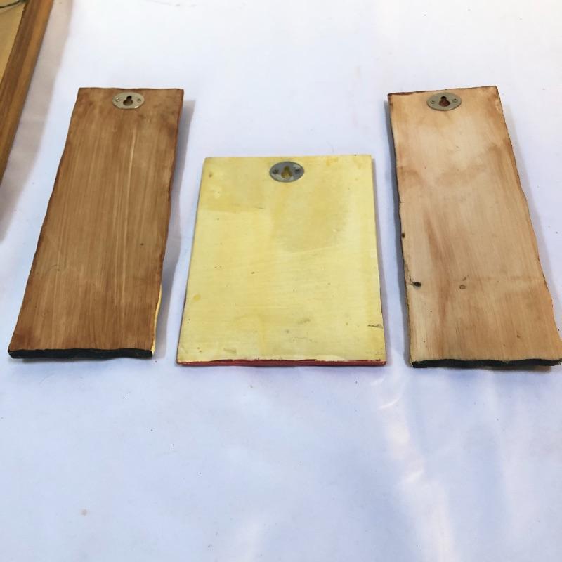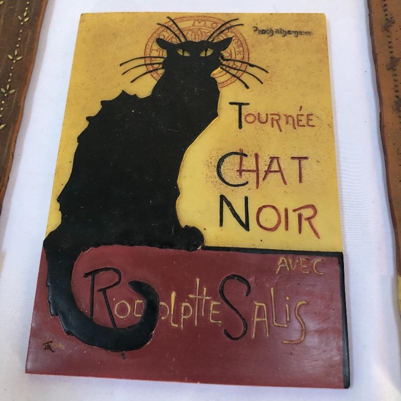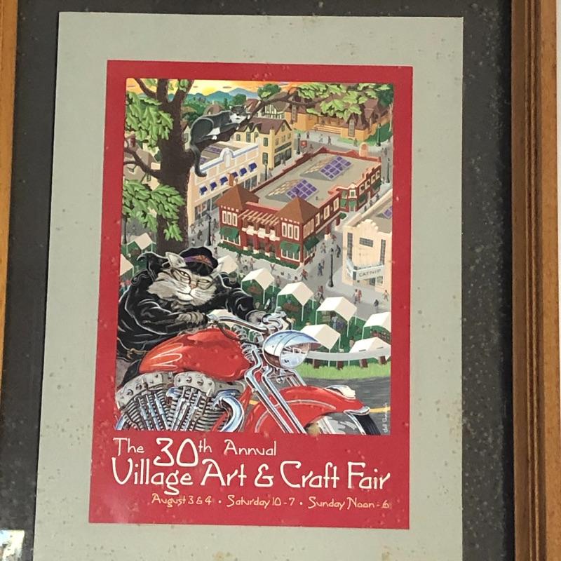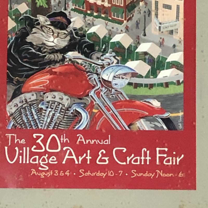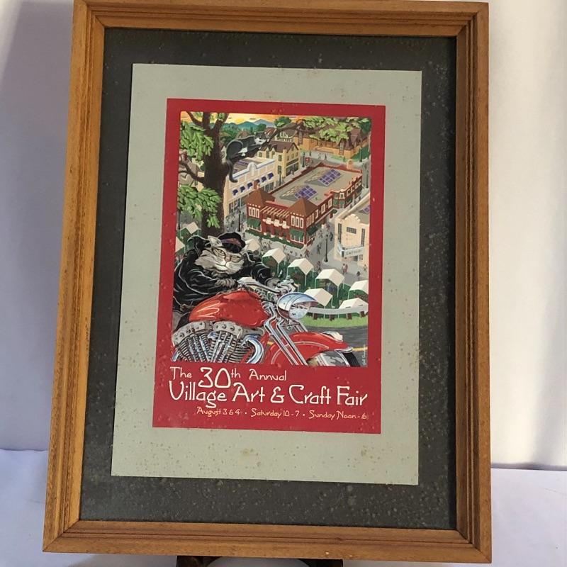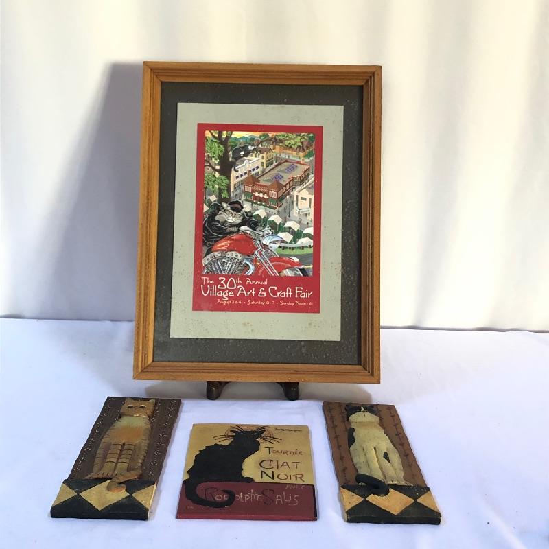 A celebration of cats, this lot includes a framed Village Art & Craft Fair poster and 3 hanging ceramic plaques. The frame is a nice wooden frame with matting that measures 11” x 15”.