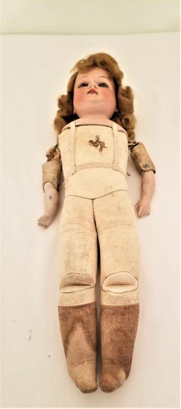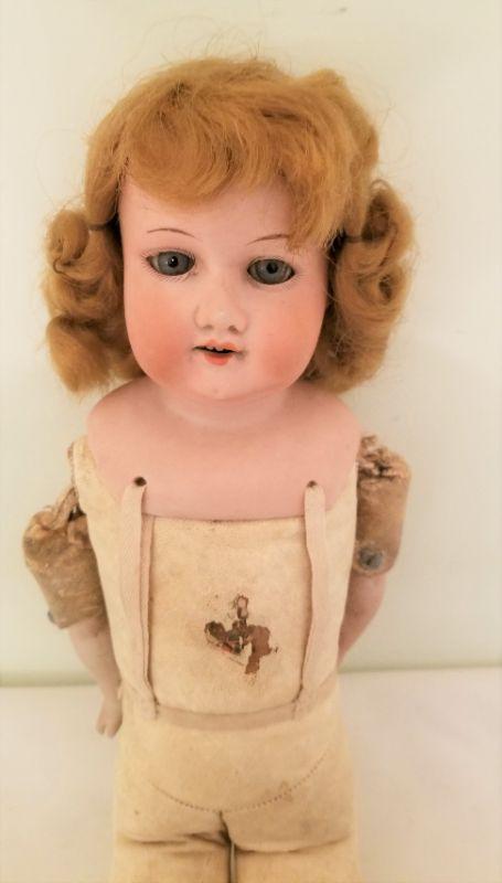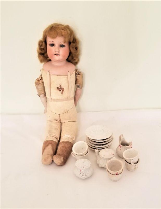 Antique (19th century) bisque china head doll with Kid leather body - open mouth with little teeth, beautiful blue eyes. Newish wig. Head marked "Germany". Comes with a little 19th century doll tea set - paste porcelain.
