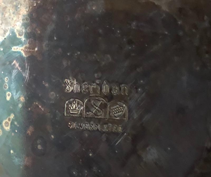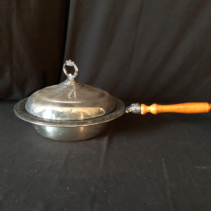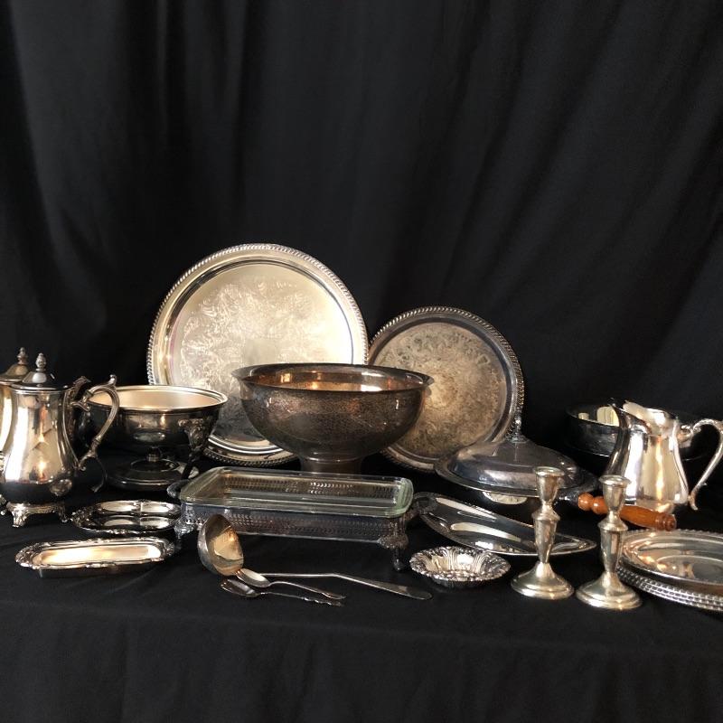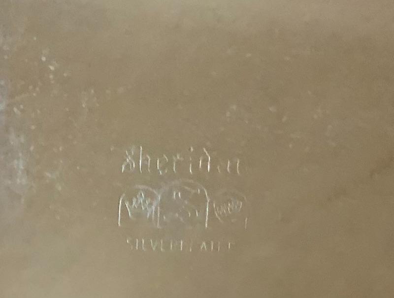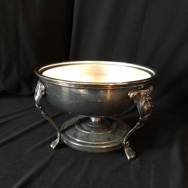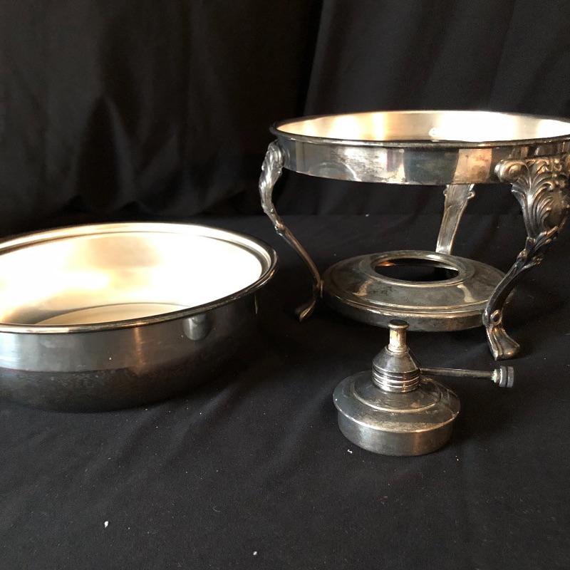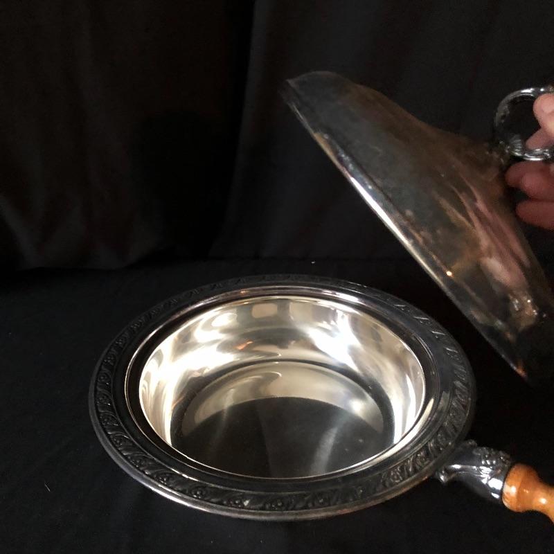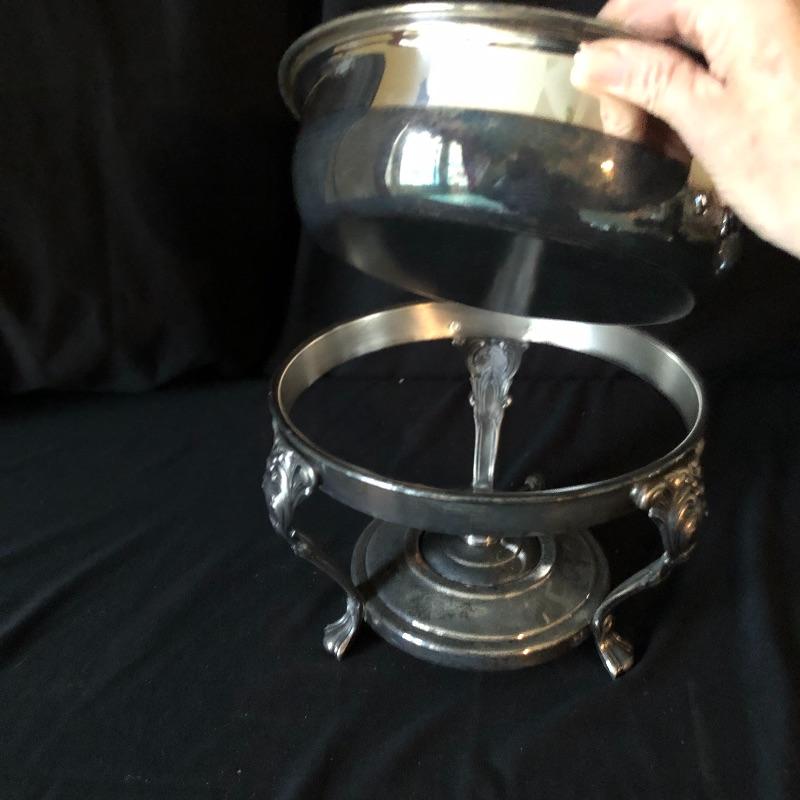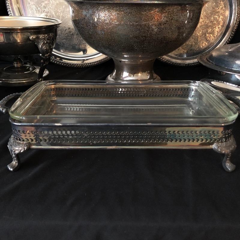 Included is a Pyrex casserole dish that comes in a W.M Rogers silver plate holder with handles, a pair of Empire candle holders that are sterling, a Sheridan silver plate chafing dish, a Gorham large and a small bowl and much more. See images for all pieces and markings. No marks were found on the largest plate, largest bowl or wooden handled server.