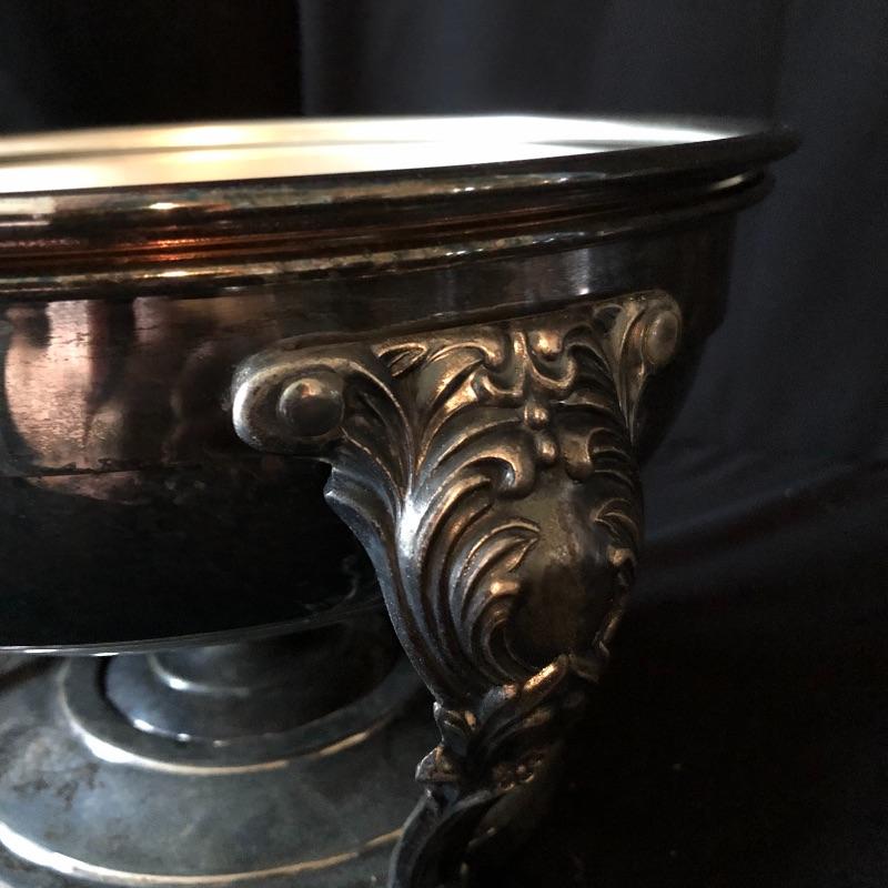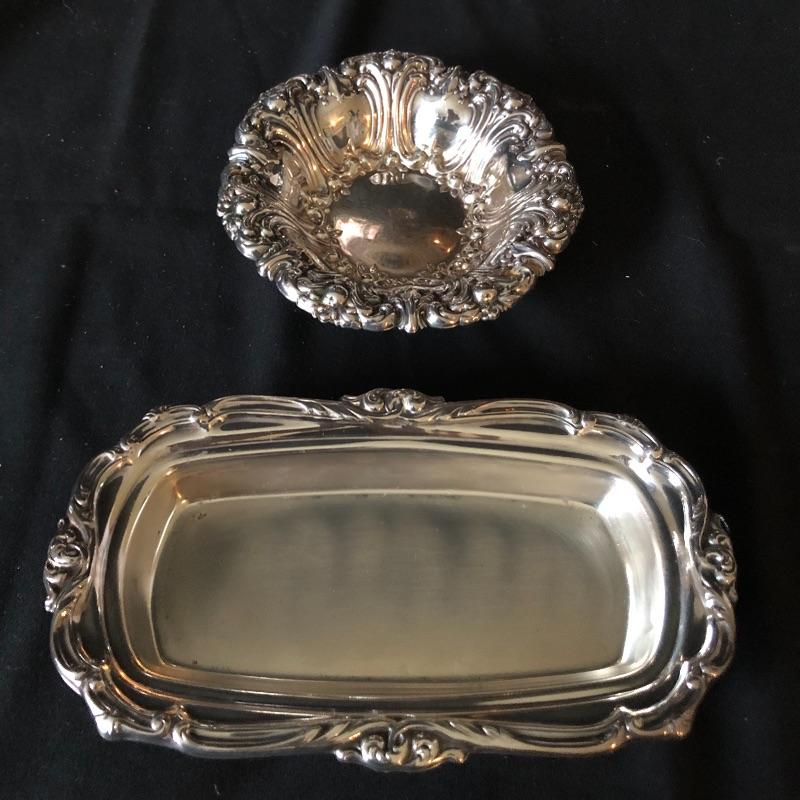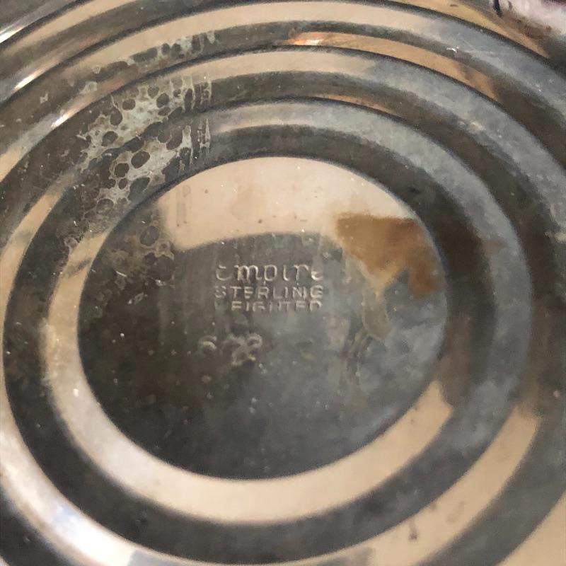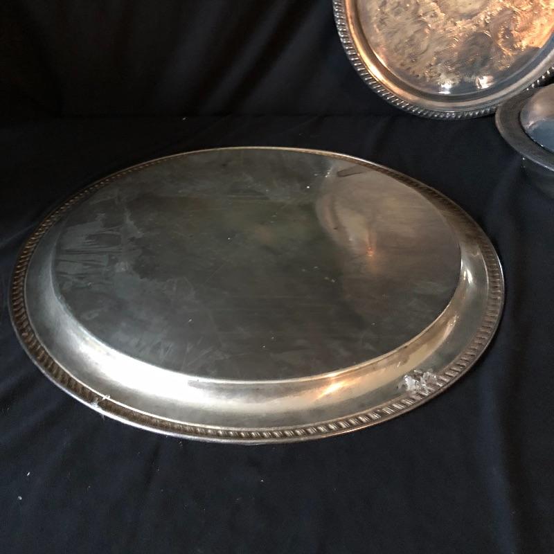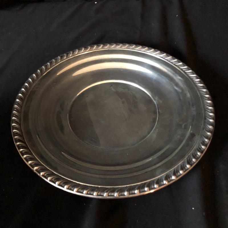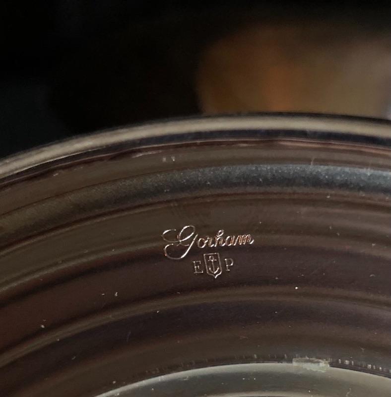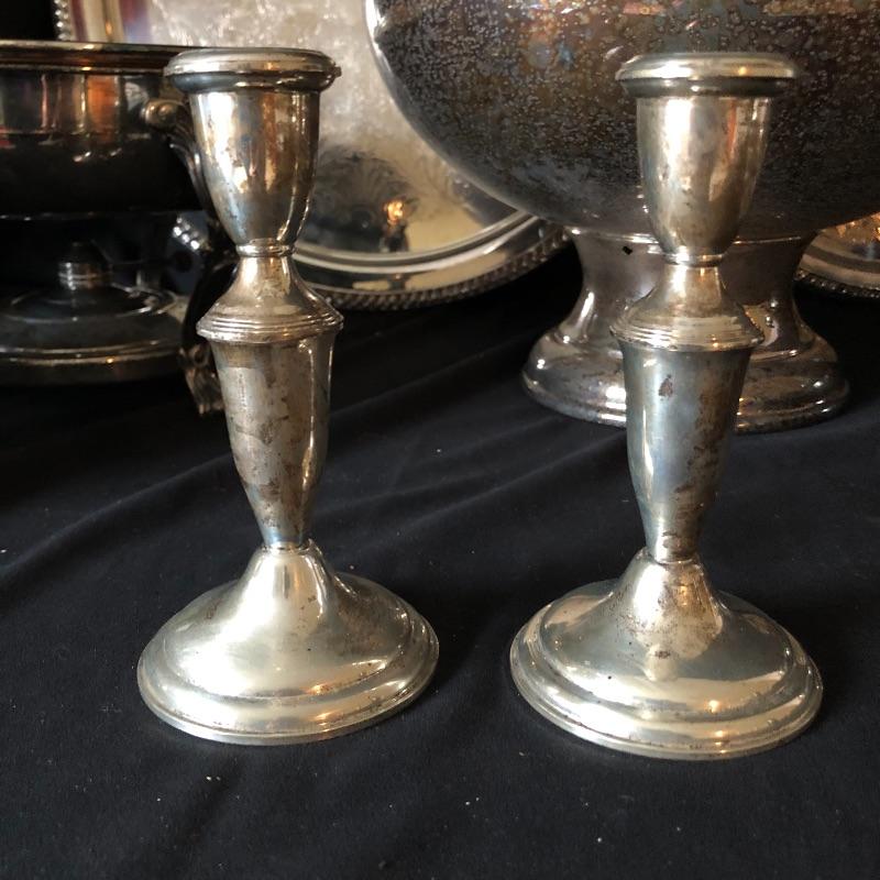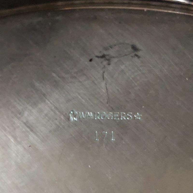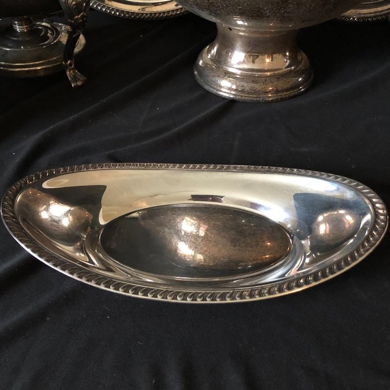 Included is a Pyrex casserole dish that comes in a W.M Rogers silver plate holder with handles, a pair of Empire candle holders that are sterling, a Sheridan silver plate chafing dish, a Gorham large and a small bowl and much more. See images for all pieces and markings. No marks were found on the largest plate, largest bowl or wooden handled server.