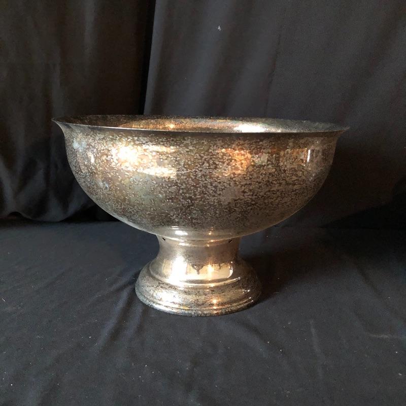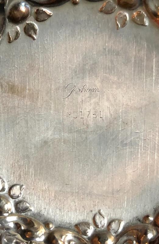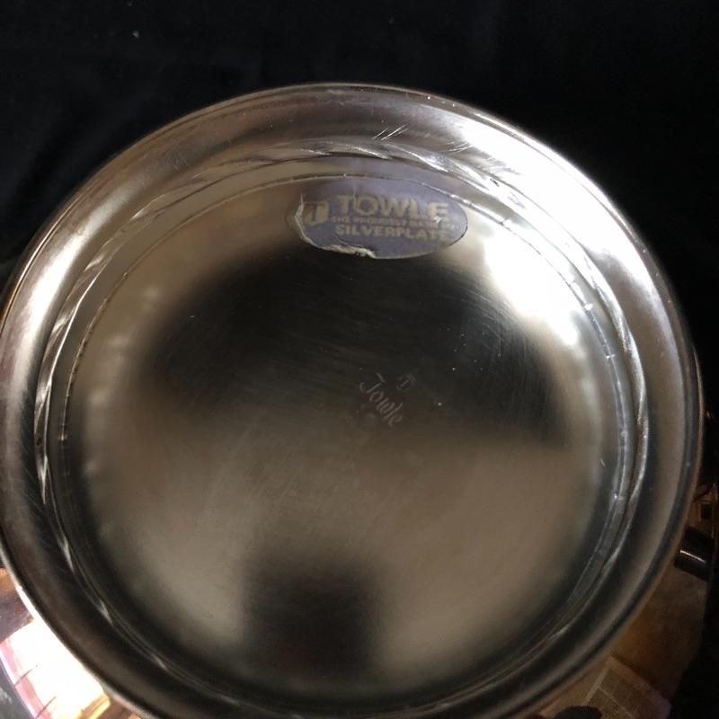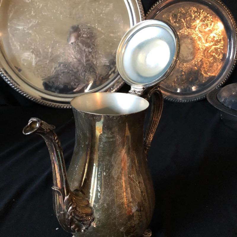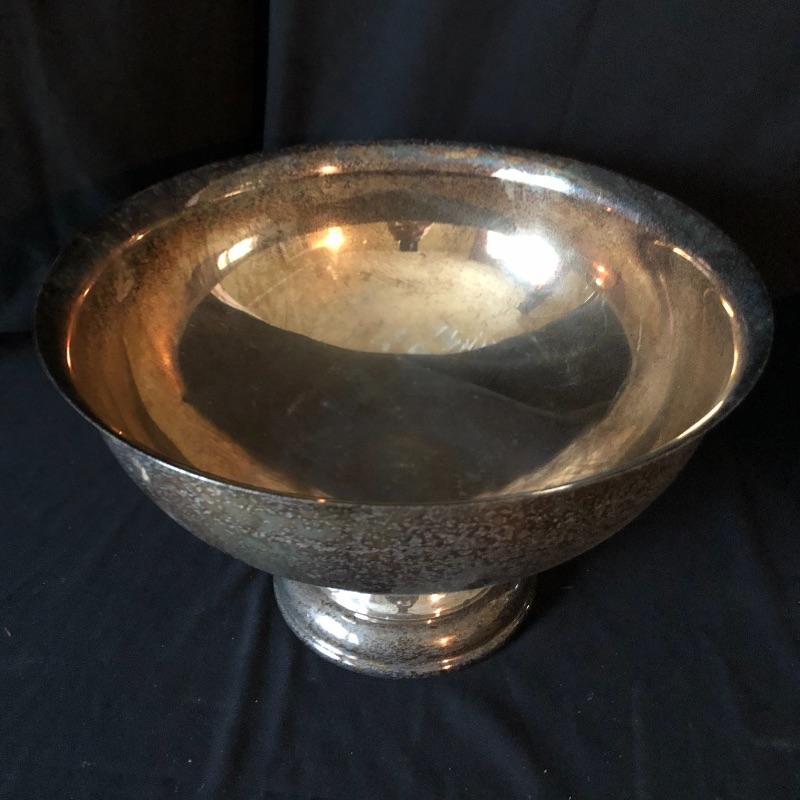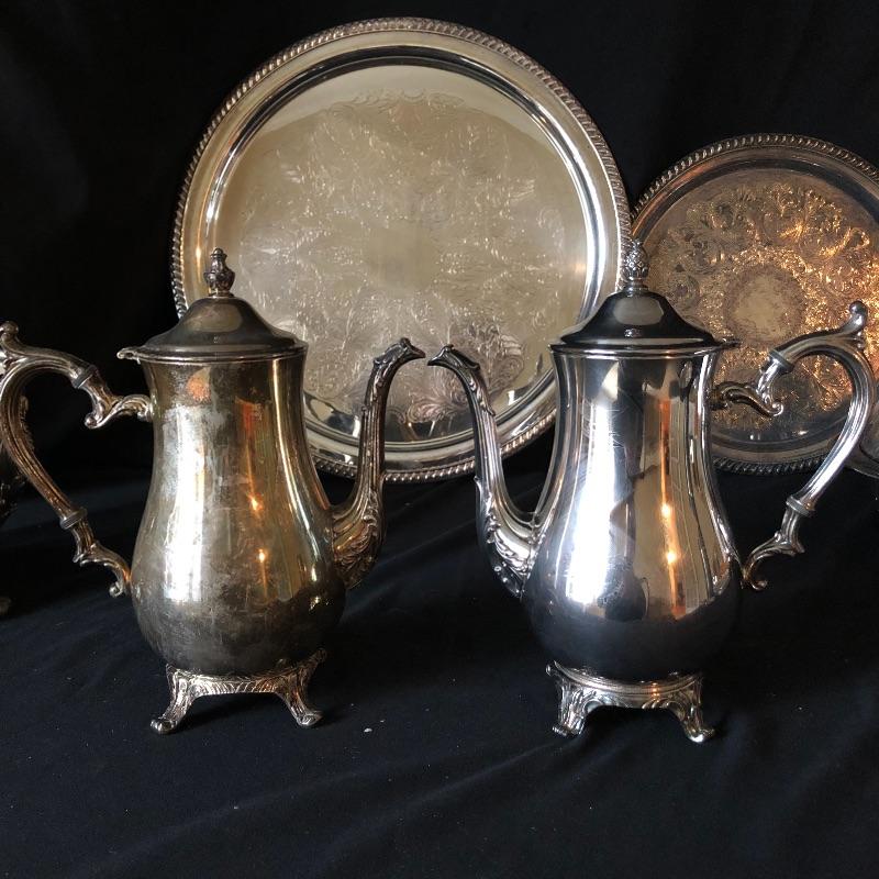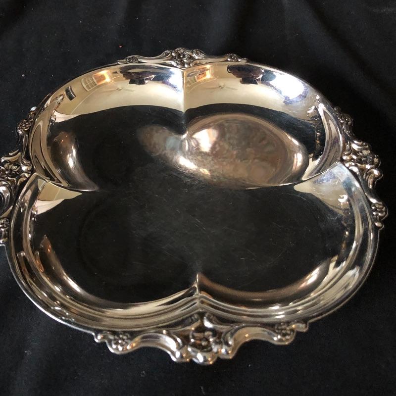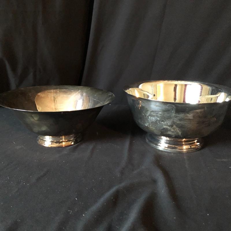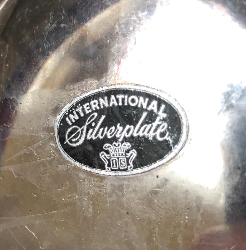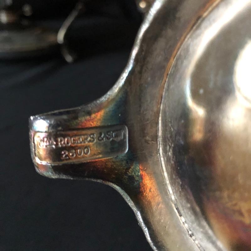 Included is a Pyrex casserole dish that comes in a W.M Rogers silver plate holder with handles, a pair of Empire candle holders that are sterling, a Sheridan silver plate chafing dish, a Gorham large and a small bowl and much more. See images for all pieces and markings. No marks were found on the largest plate, largest bowl or wooden handled server.