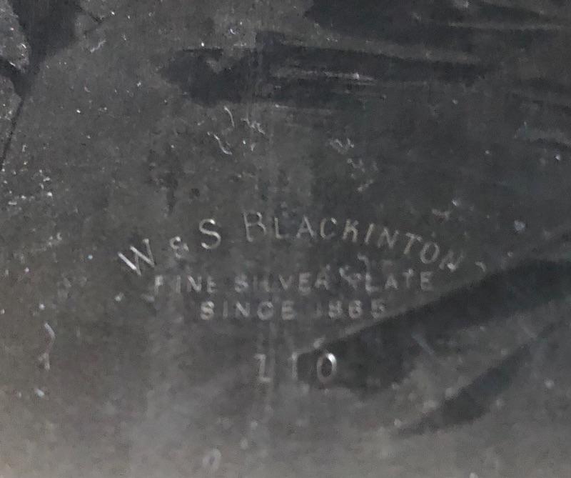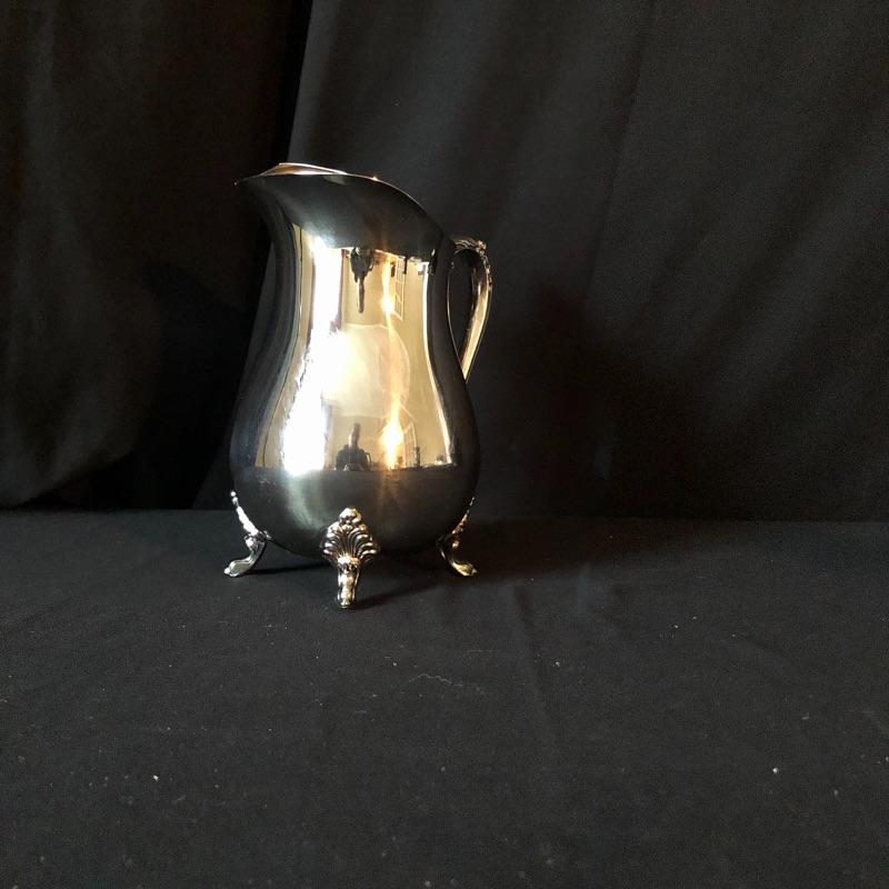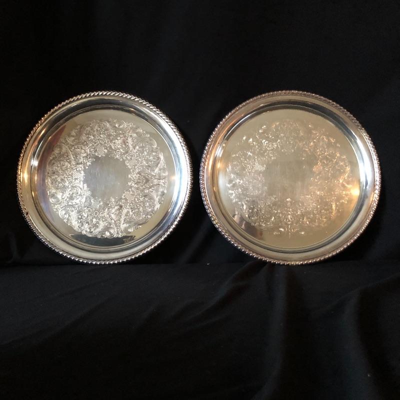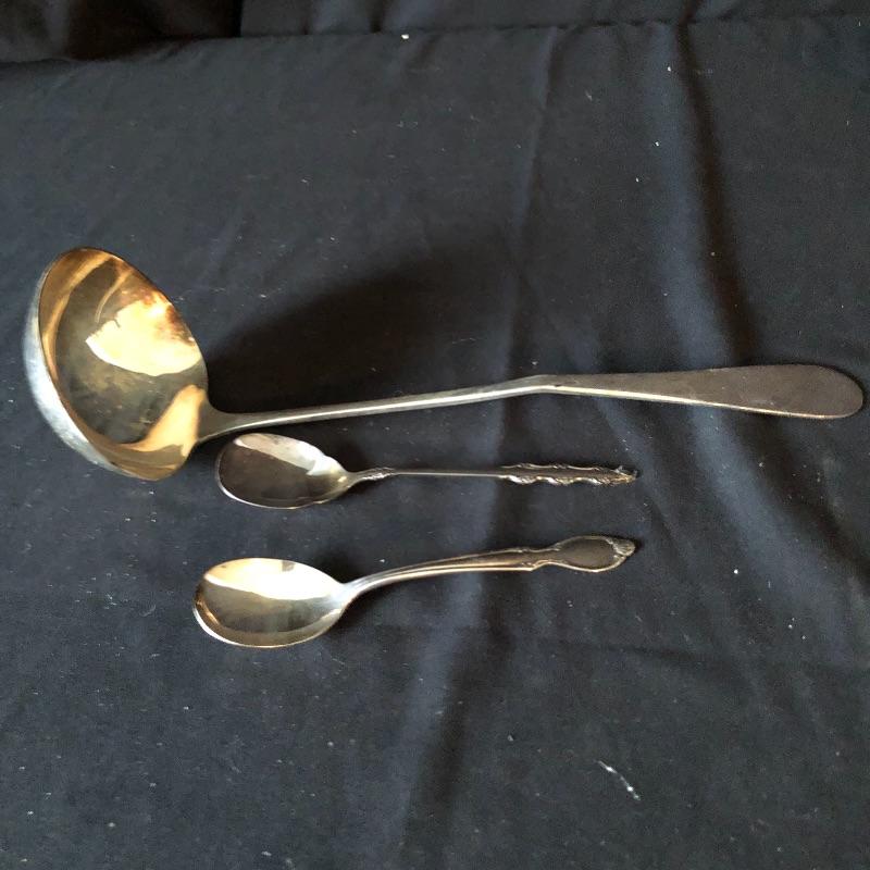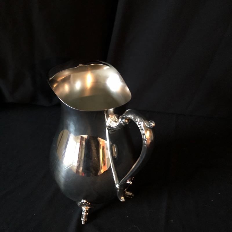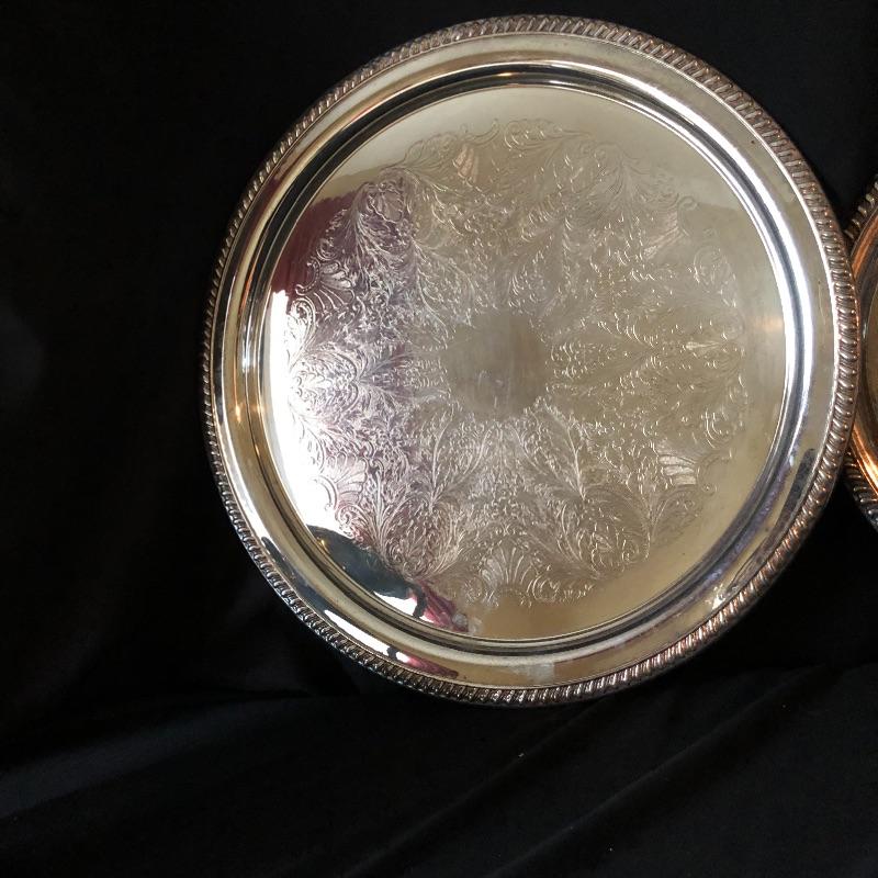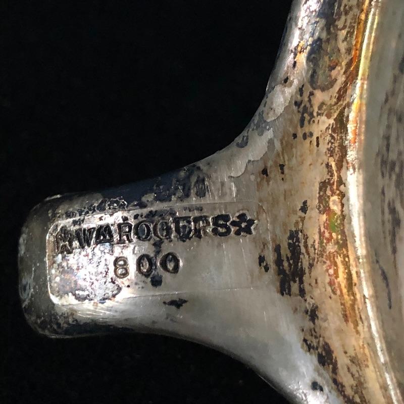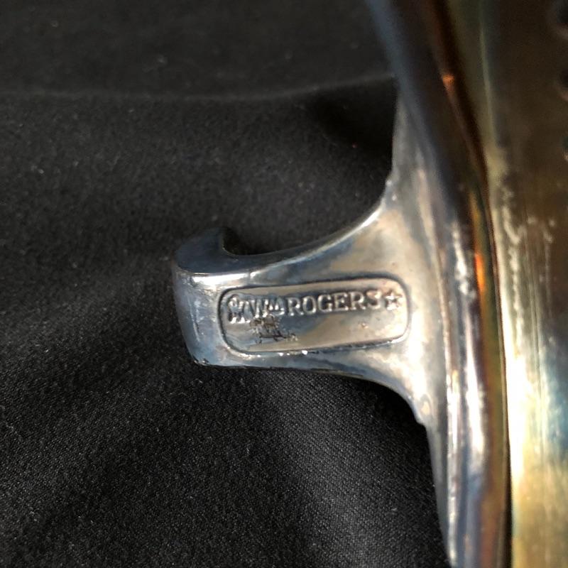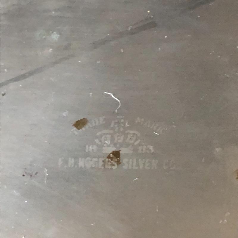 Included is a Pyrex casserole dish that comes in a W.M Rogers silver plate holder with handles, a pair of Empire candle holders that are sterling, a Sheridan silver plate chafing dish, a Gorham large and a small bowl and much more. See images for all pieces and markings. No marks were found on the largest plate, largest bowl or wooden handled server.