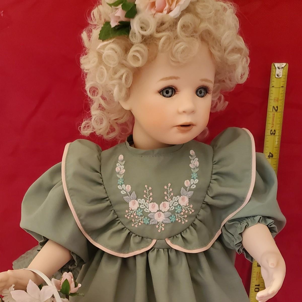 Doll Named "Heidi" By Rose Pinkul with Blue Dress White-Blonde Hair Holding Flower Basket