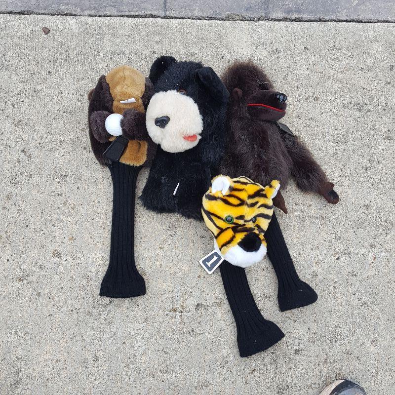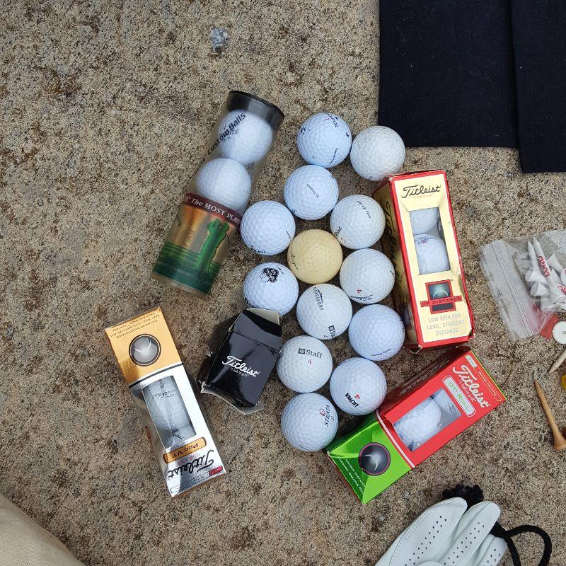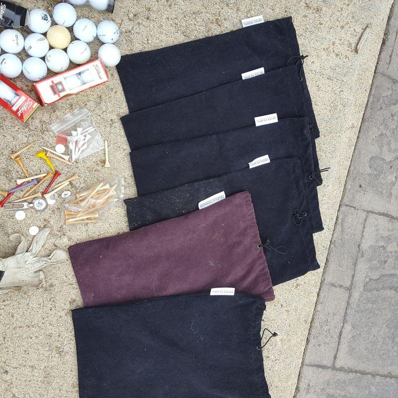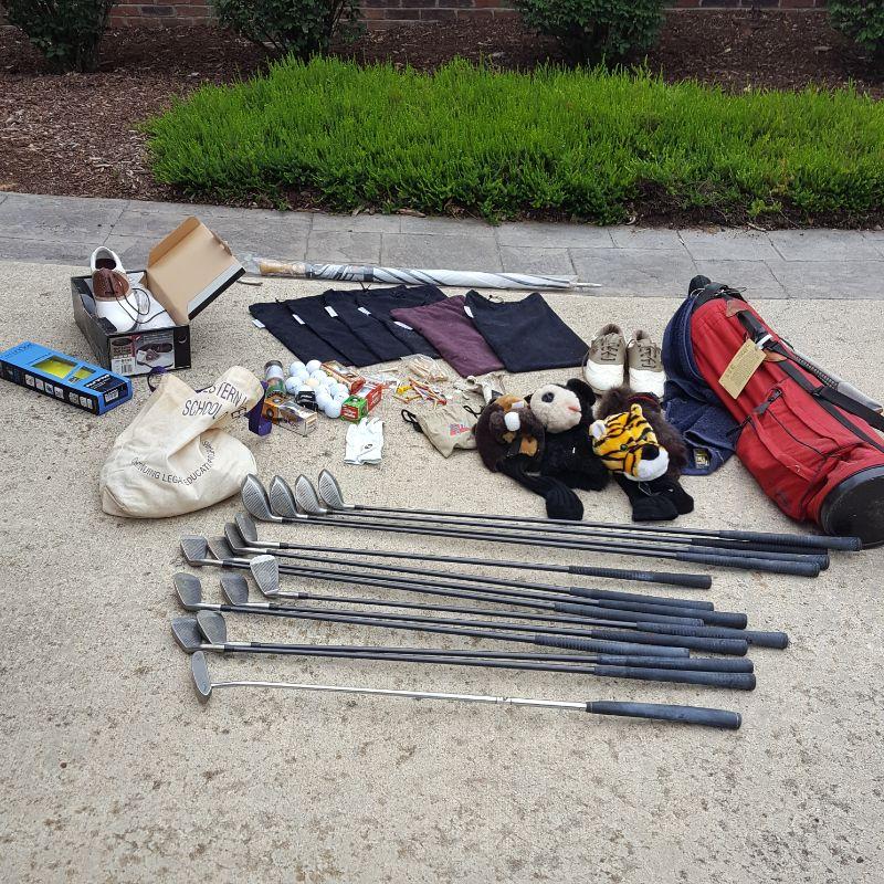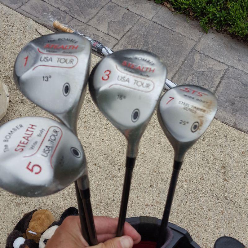 Everything she needs to start the game of golf! A set of clubs with some mixed clubs but includes Stealth USA Tour Woods and King Oversize Irons. Lot also includes a brand new pair of size 9 1/2 Etonic golf shoes, and a second pair of 9.5 shoes. And of course there are tons of golf balls and tees, as well as animal driver covers and a red bag to hold everything. Yep, Everything you need. No shipping.