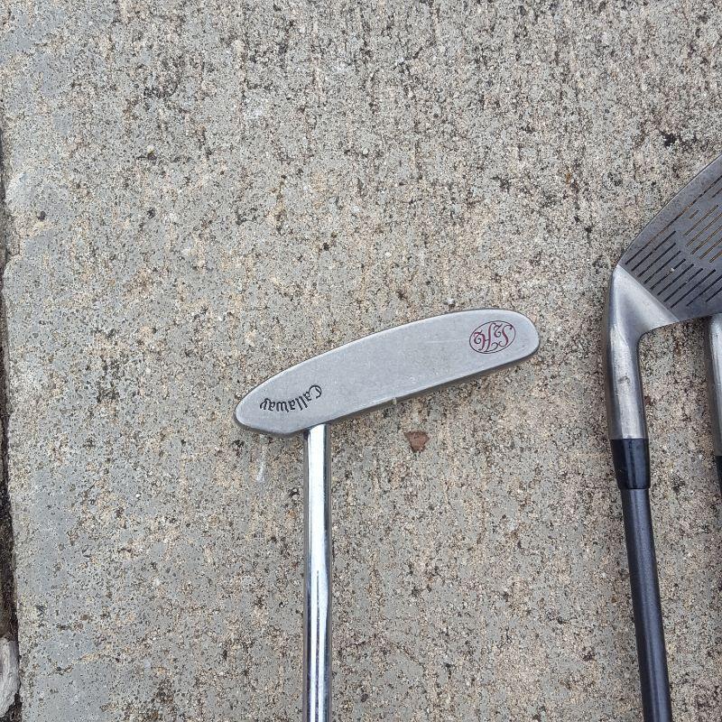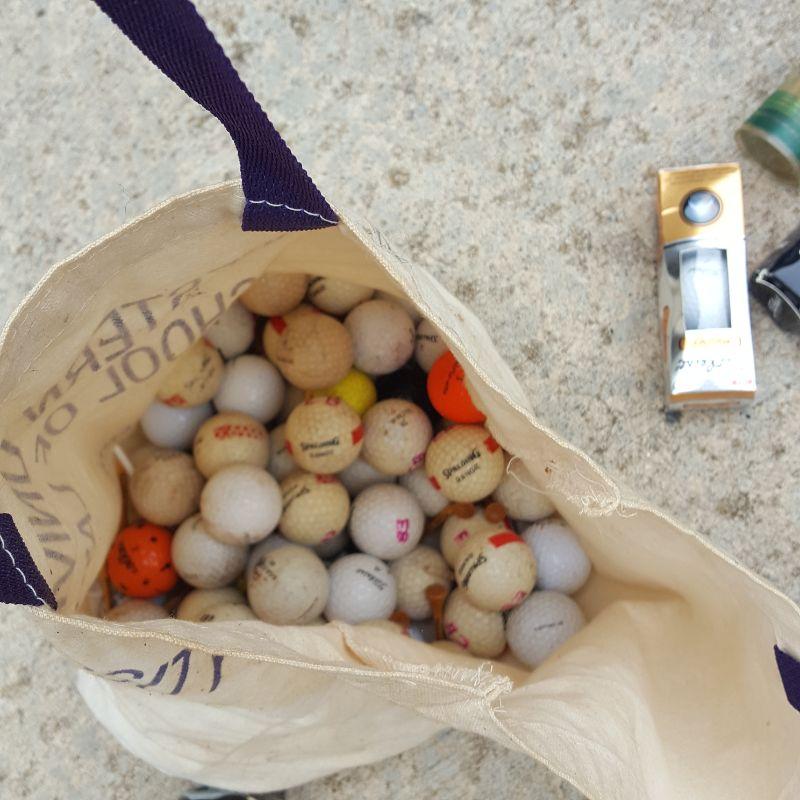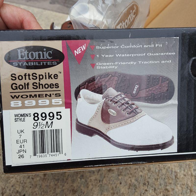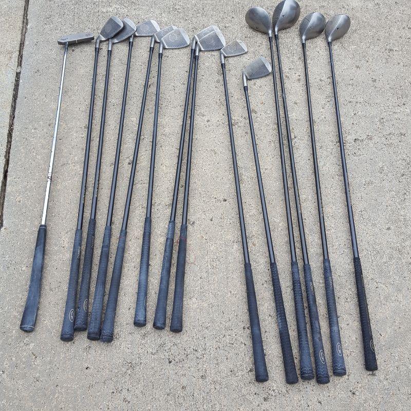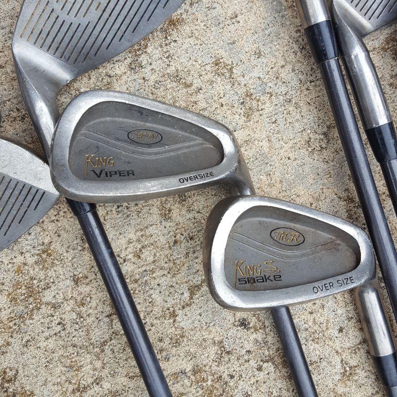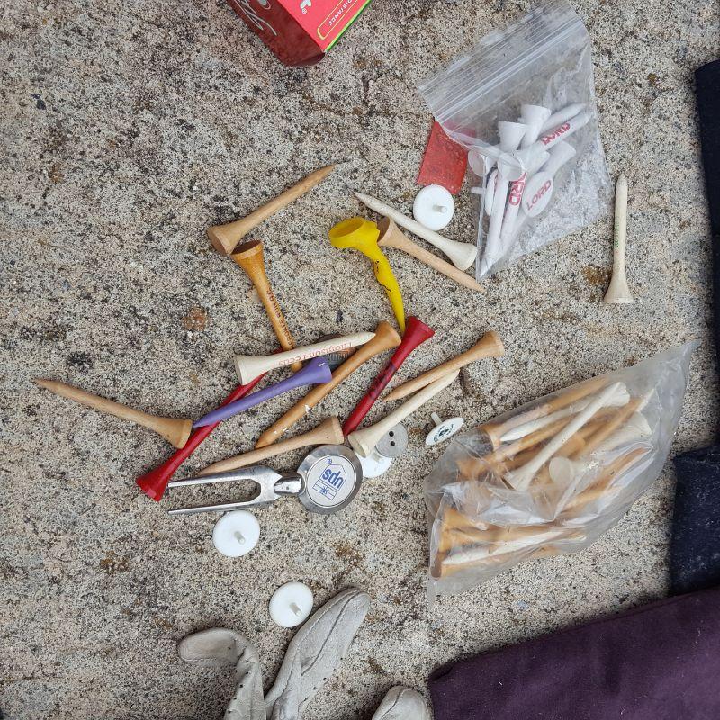 Everything she needs to start the game of golf! A set of clubs with some mixed clubs but includes Stealth USA Tour Woods and King Oversize Irons. Lot also includes a brand new pair of size 9 1/2 Etonic golf shoes, and a second pair of 9.5 shoes. And of course there are tons of golf balls and tees, as well as animal driver covers and a red bag to hold everything. Yep, Everything you need. No shipping.
