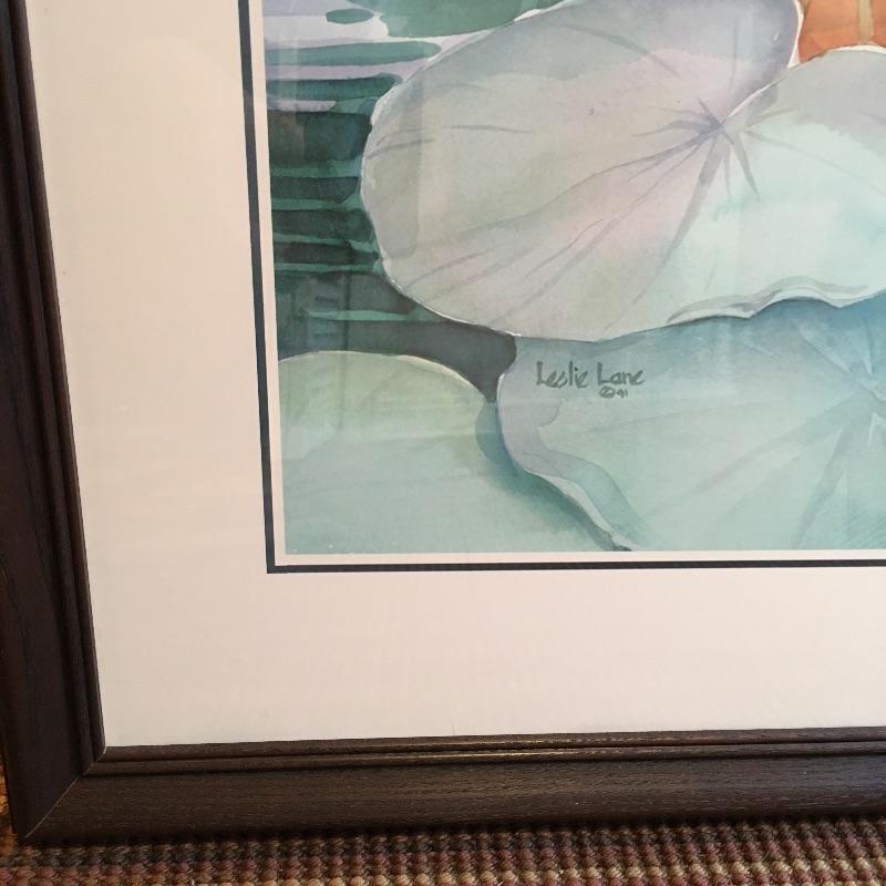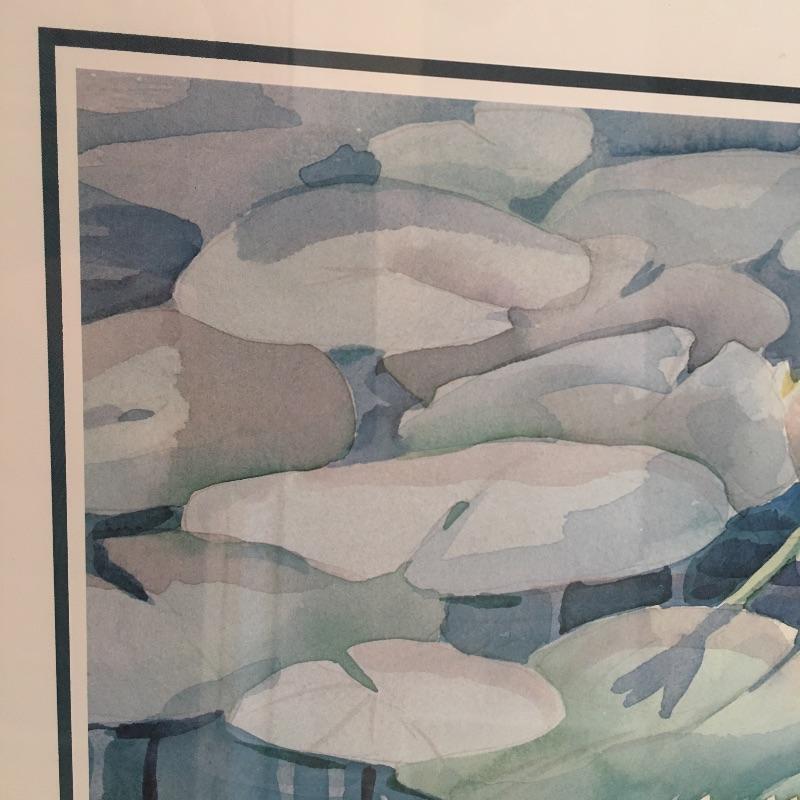 Leslie Lane framed print of a watercolor depicting lily pads with fish swimming underneath. Lovely pastel colors add serenity to your home with this large piece.