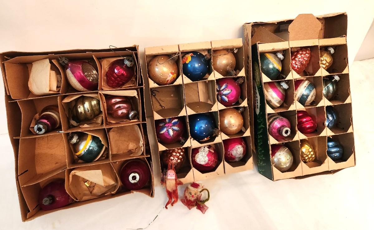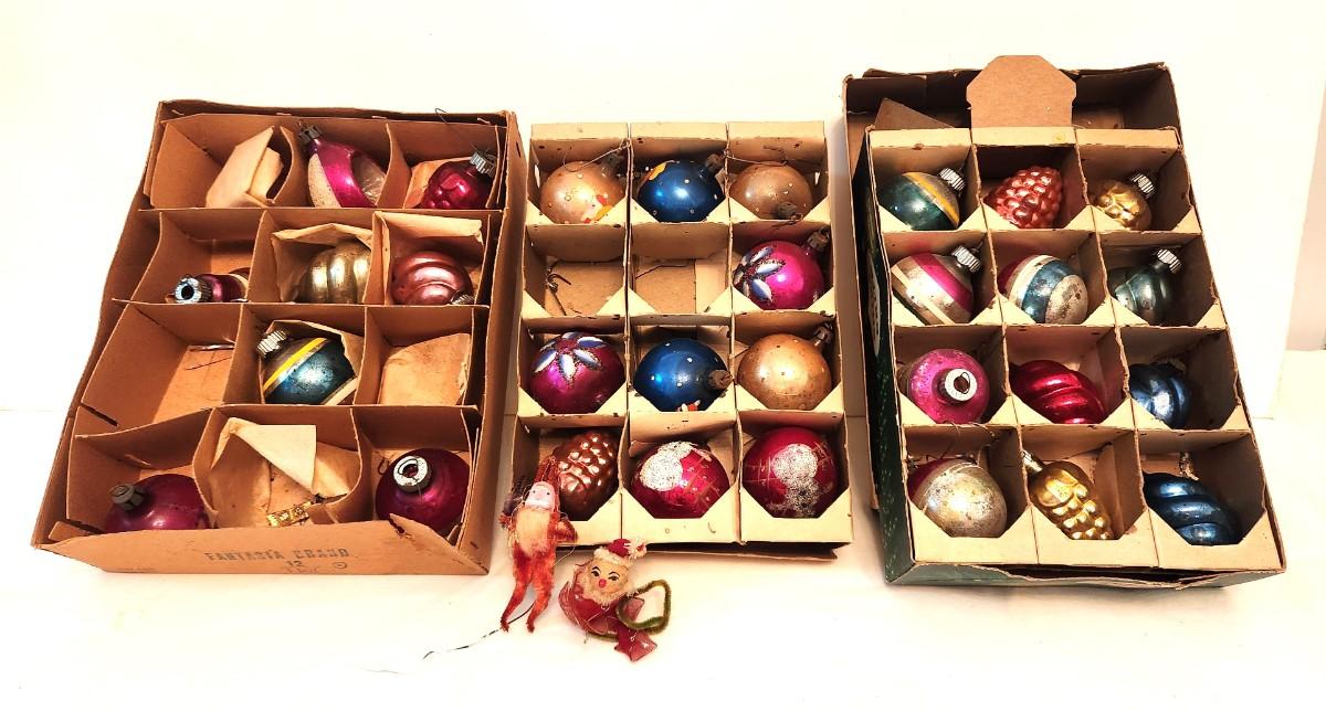 Attic Find! This is how we found them - bottoms of boxes are kind of brittle, but there - no lids. There are about 30 ornaments in this lot. As is.