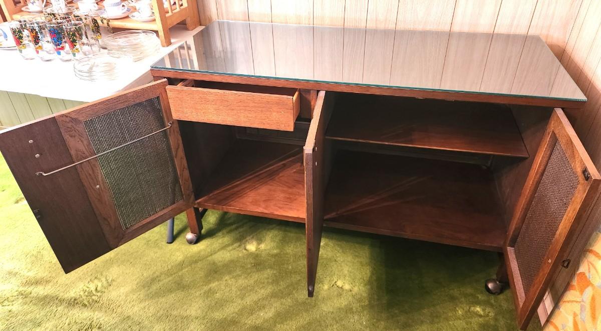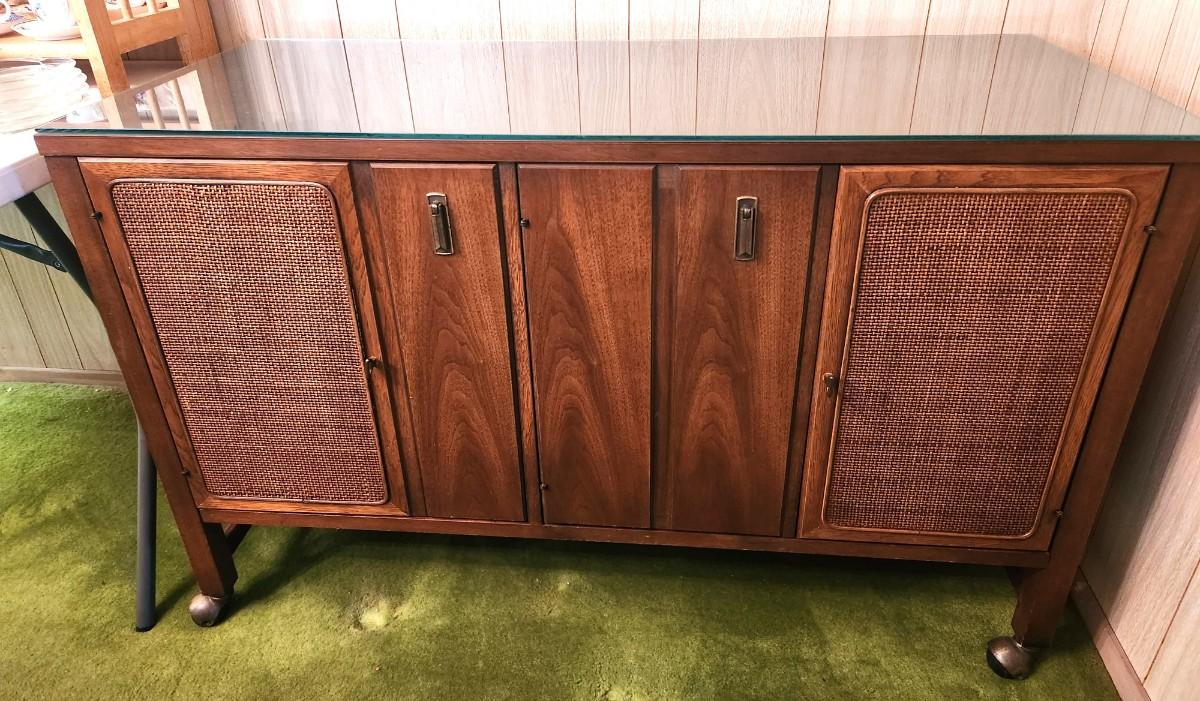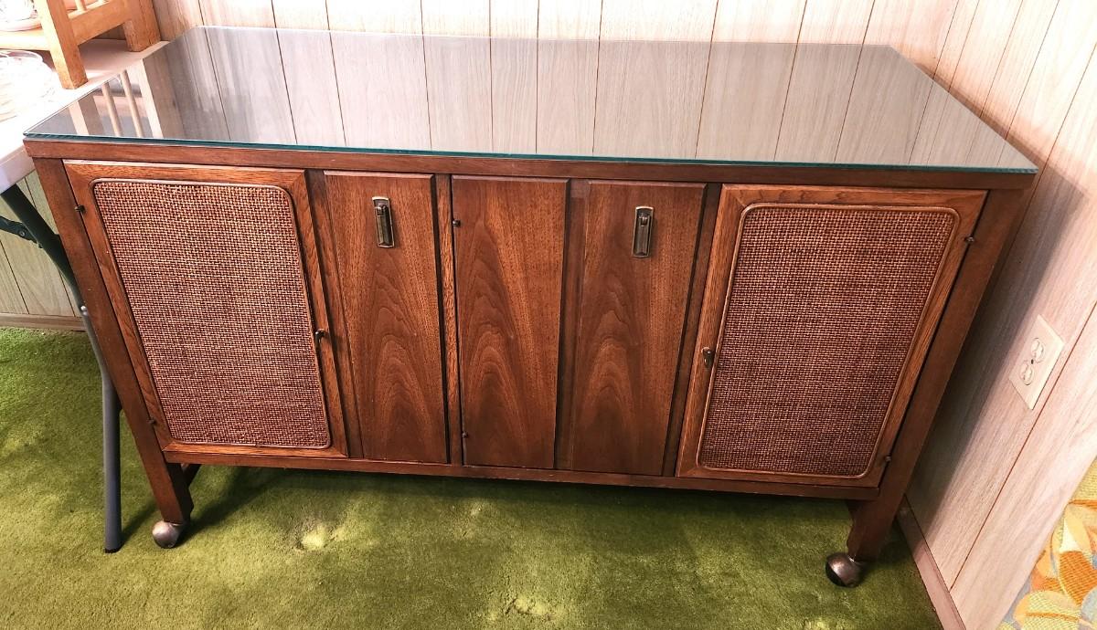 Good looking Mid Century Modern Broyhill Premier Server/Bar. Glass top. Rattan front - 4 feet across, 20" deep, 30" tall. Lots of storage here. Excellent condition.