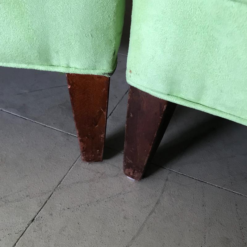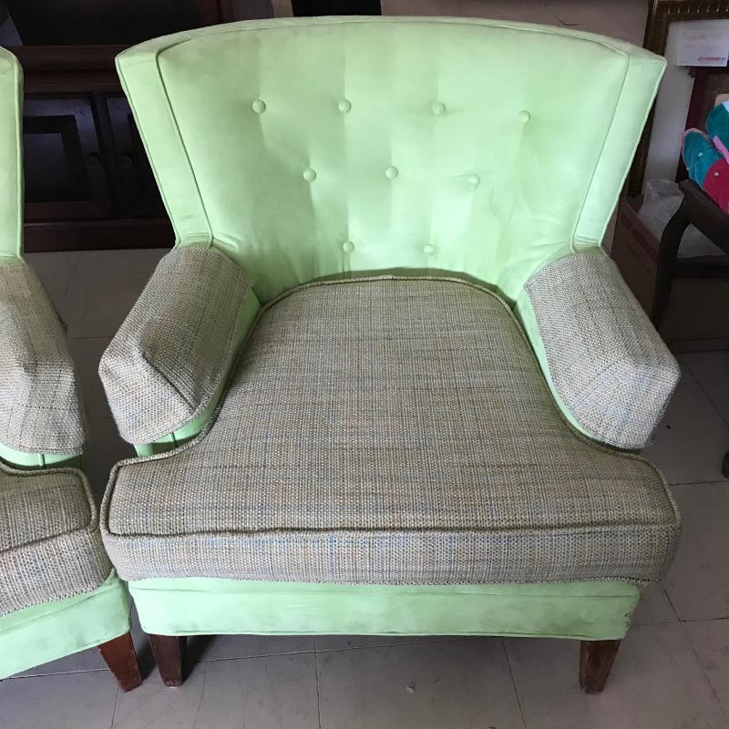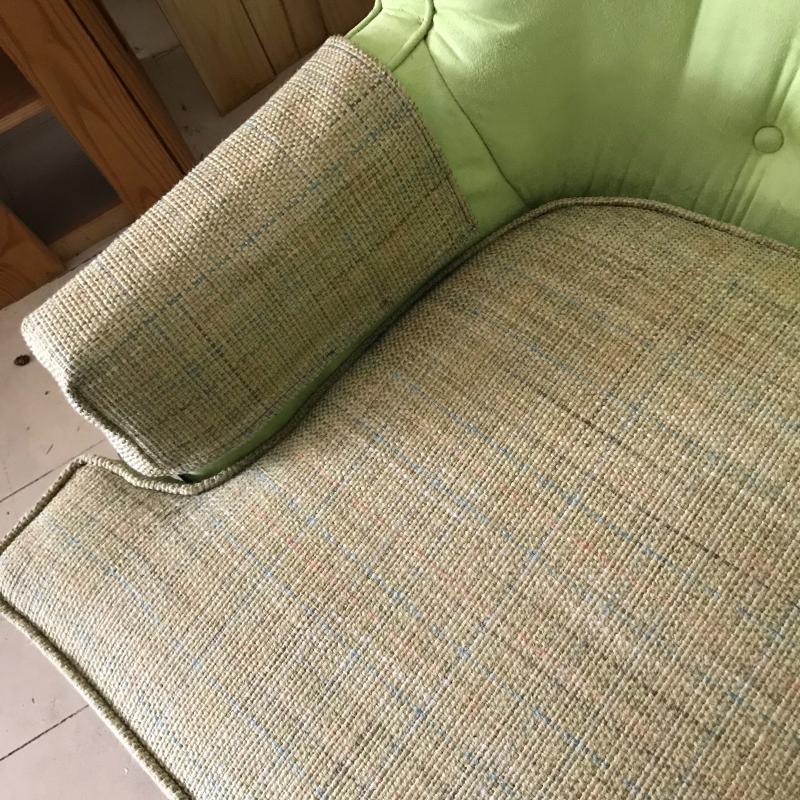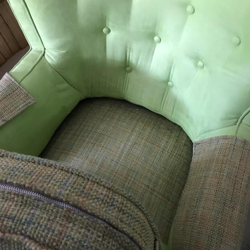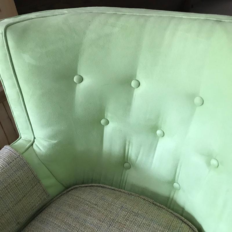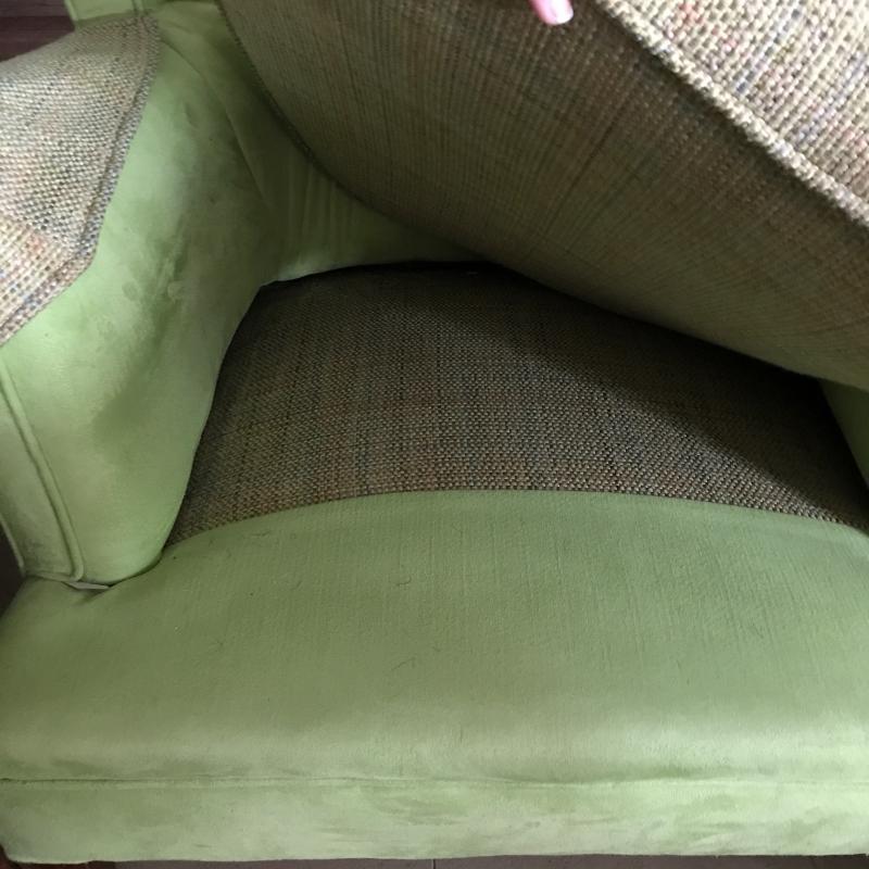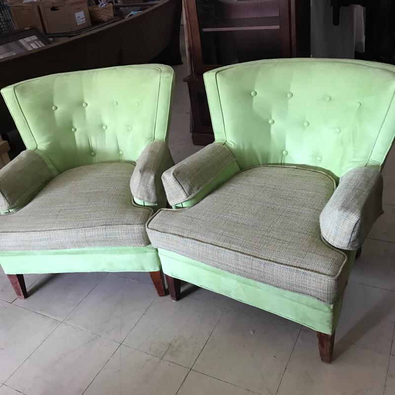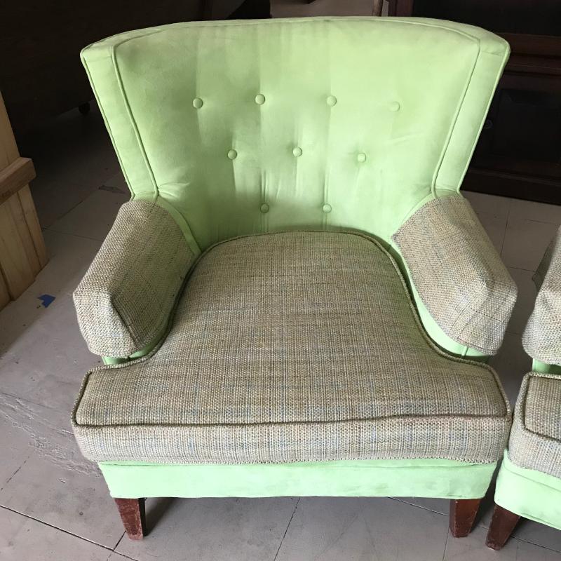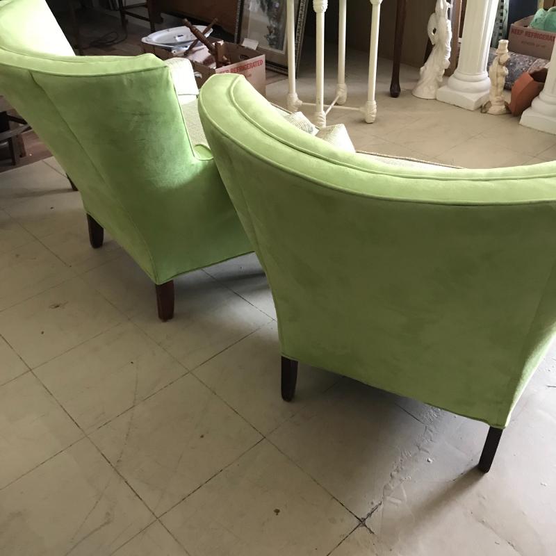 Lot includes two matching lime green suede-like chairs. Seats have a different fabric and appear to have been reupholstered. Approx. 35” x 32” x 30”. No shipping available. Local pickup only in Maggie Valley, NC.