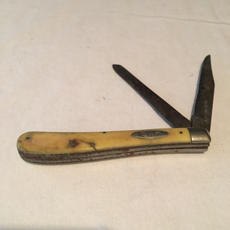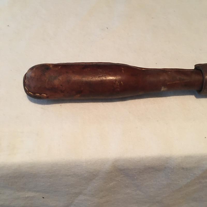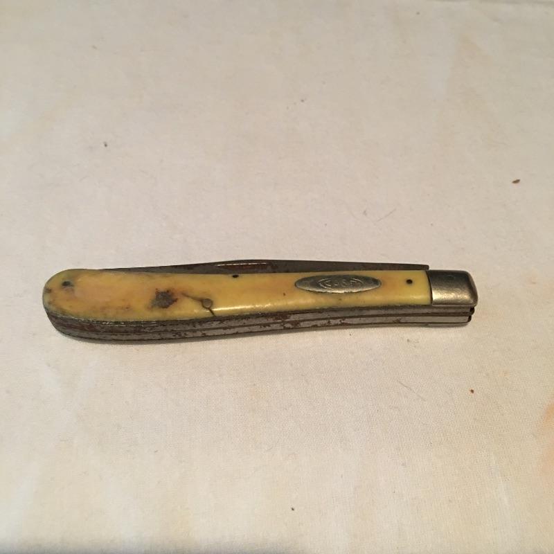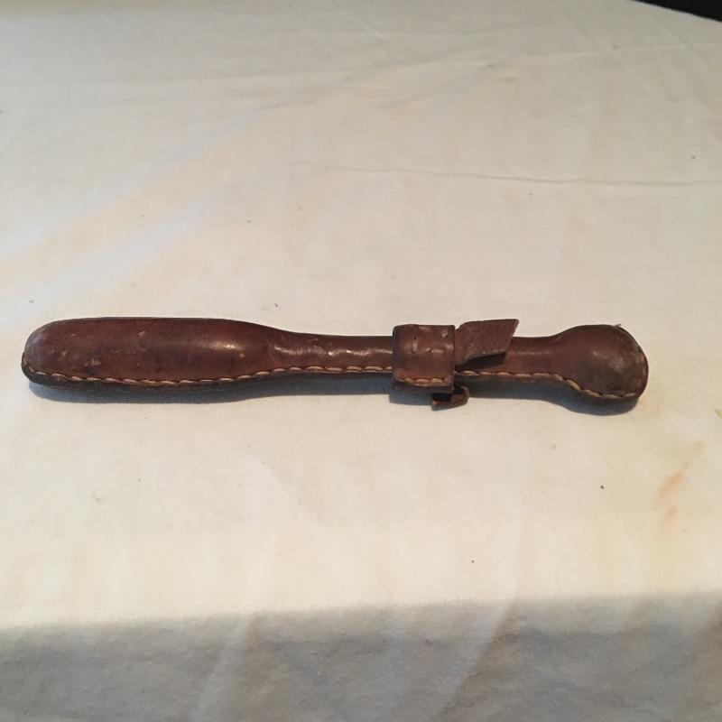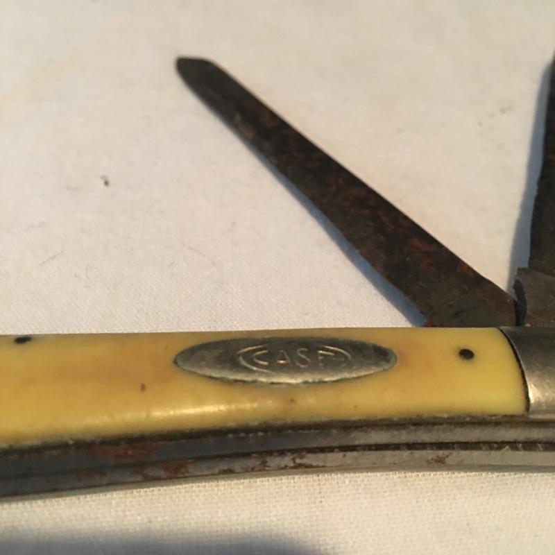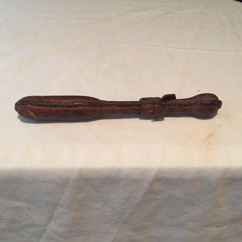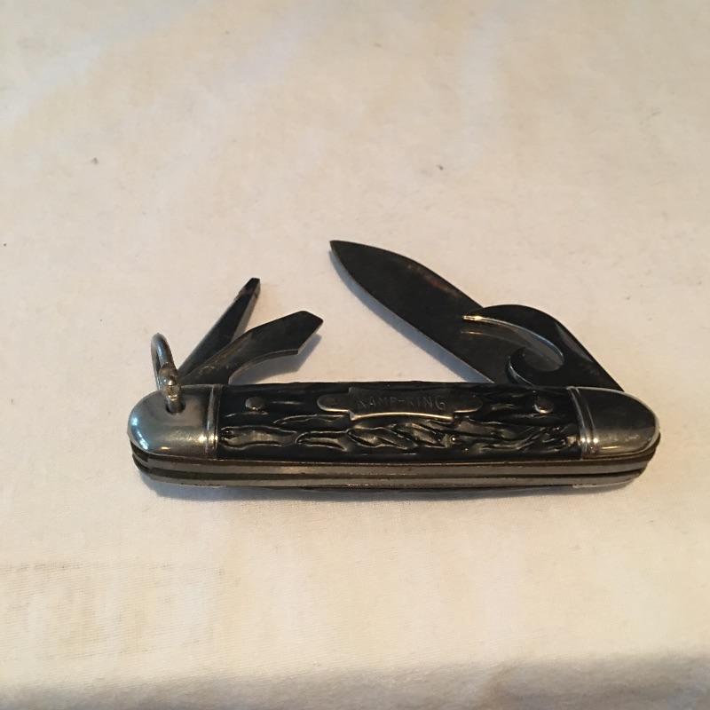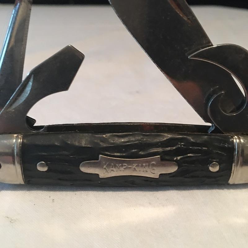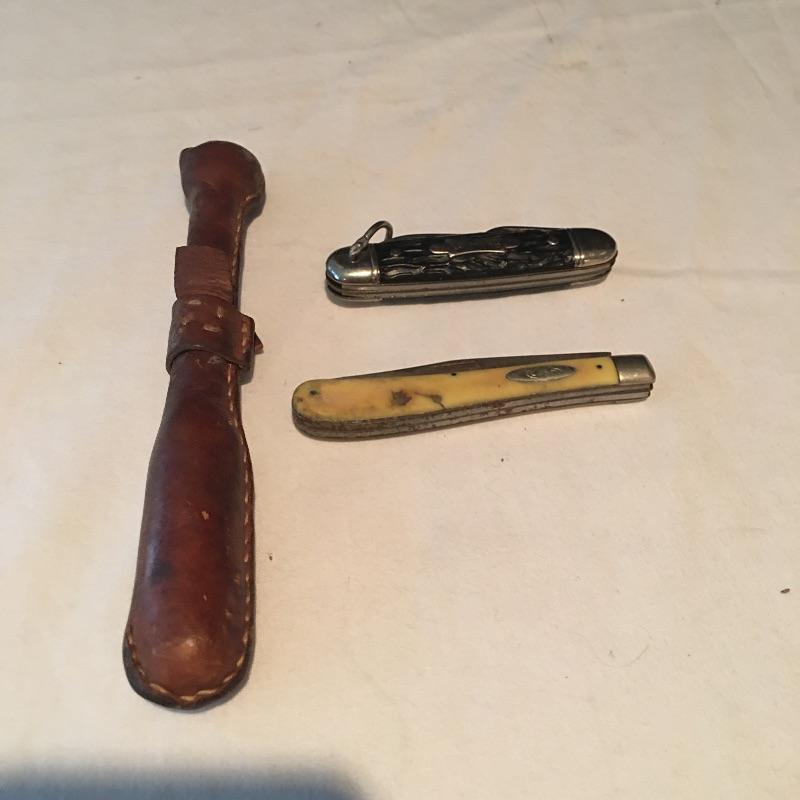 Pair of knives and small club includes one Case knife with two blades, Kamp King knife with bottle and can opener and a small club covered with leather. Club measures 8” long.