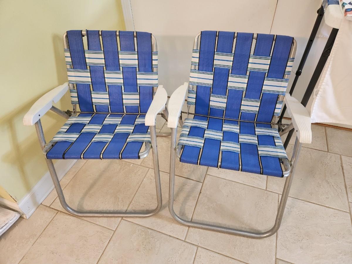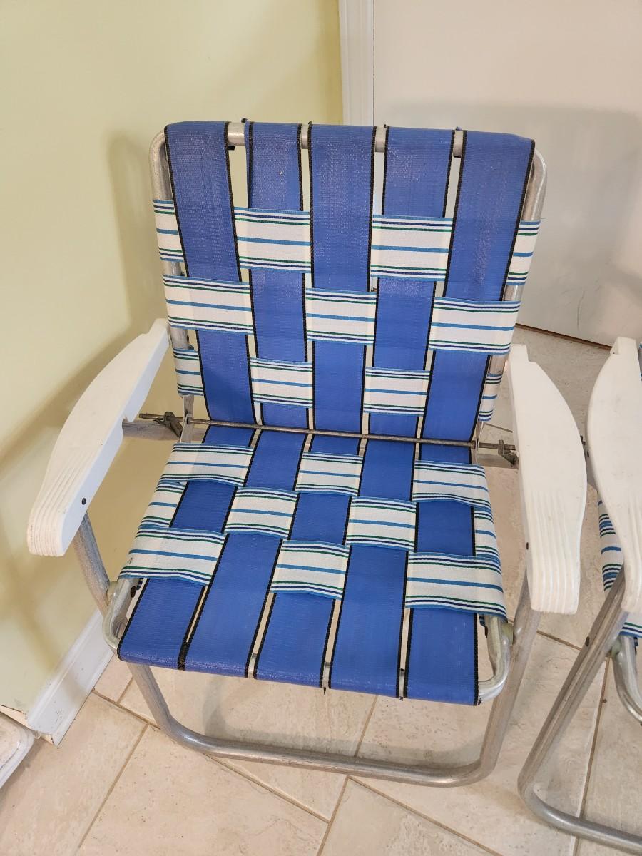 Lot #194 Pair of Vintage Aluminum Frame Strap Upholstery Patio/outdoor chairs