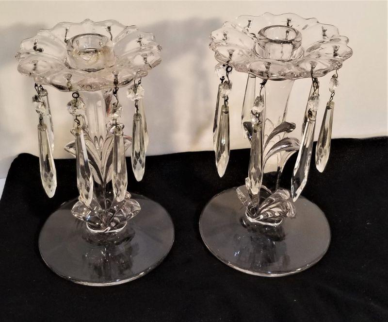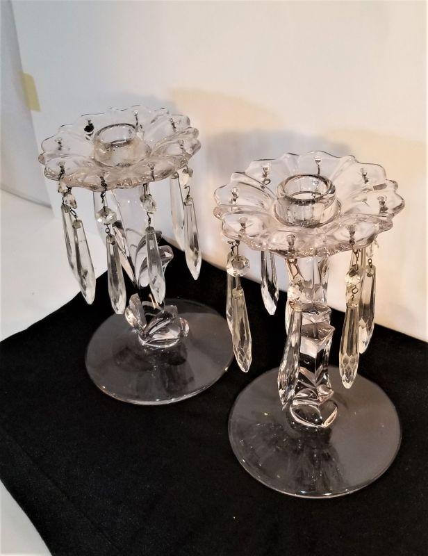 Lot #194 Pair of vintage glass candlesticks - hanging prisms
